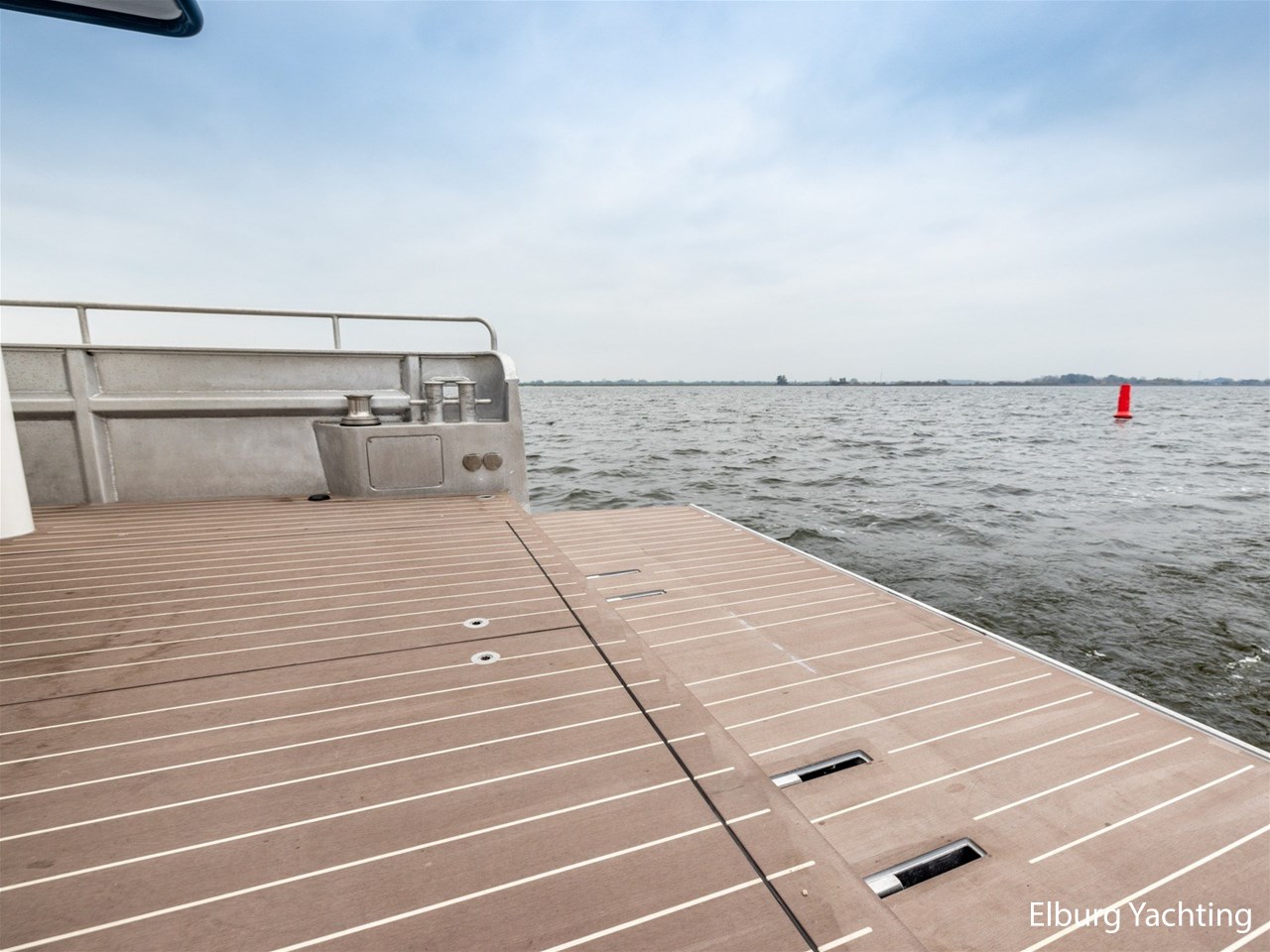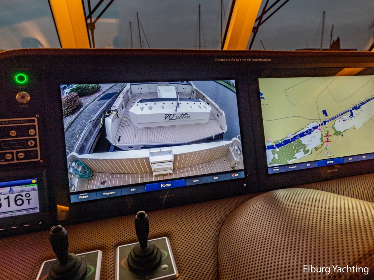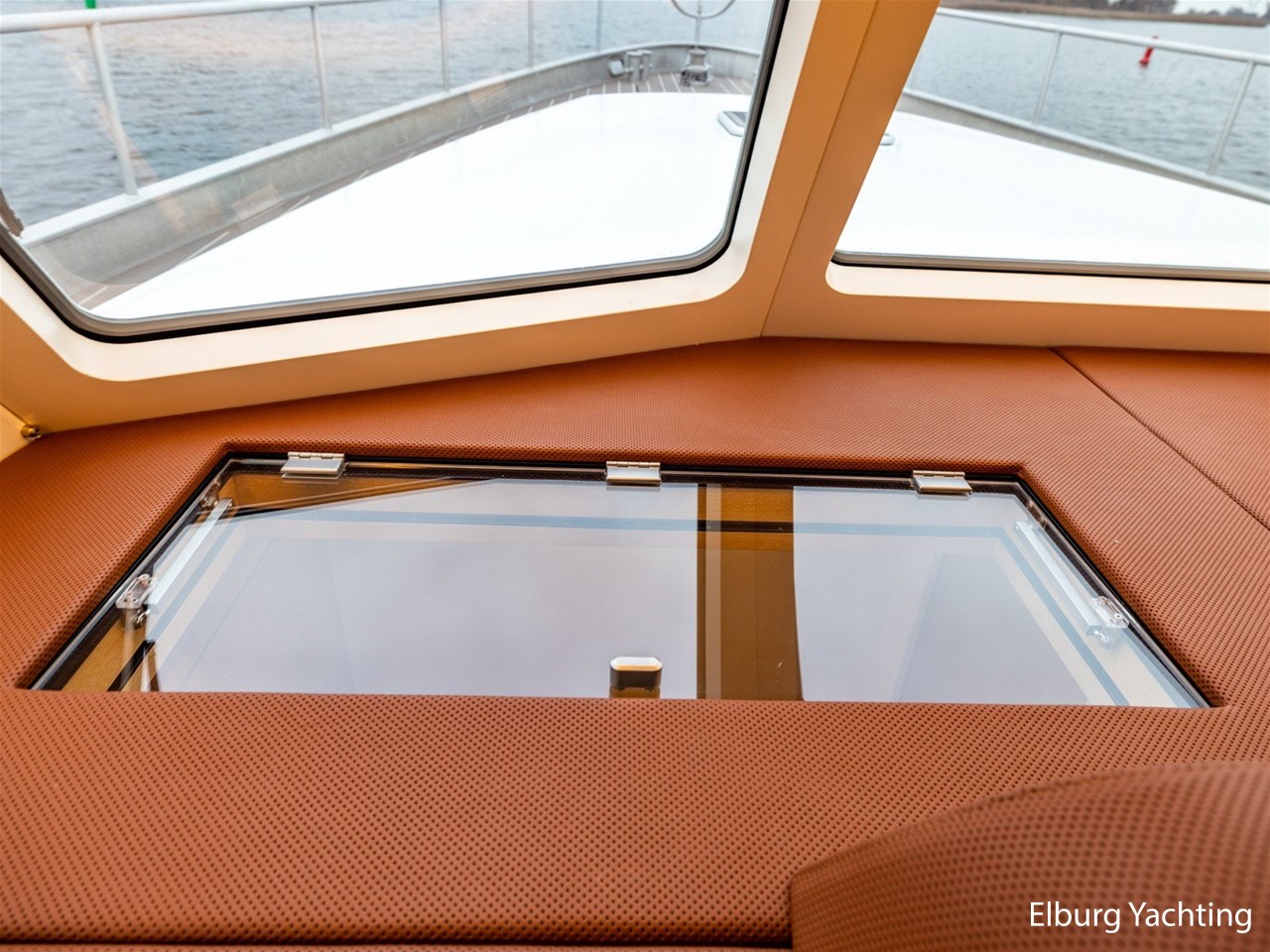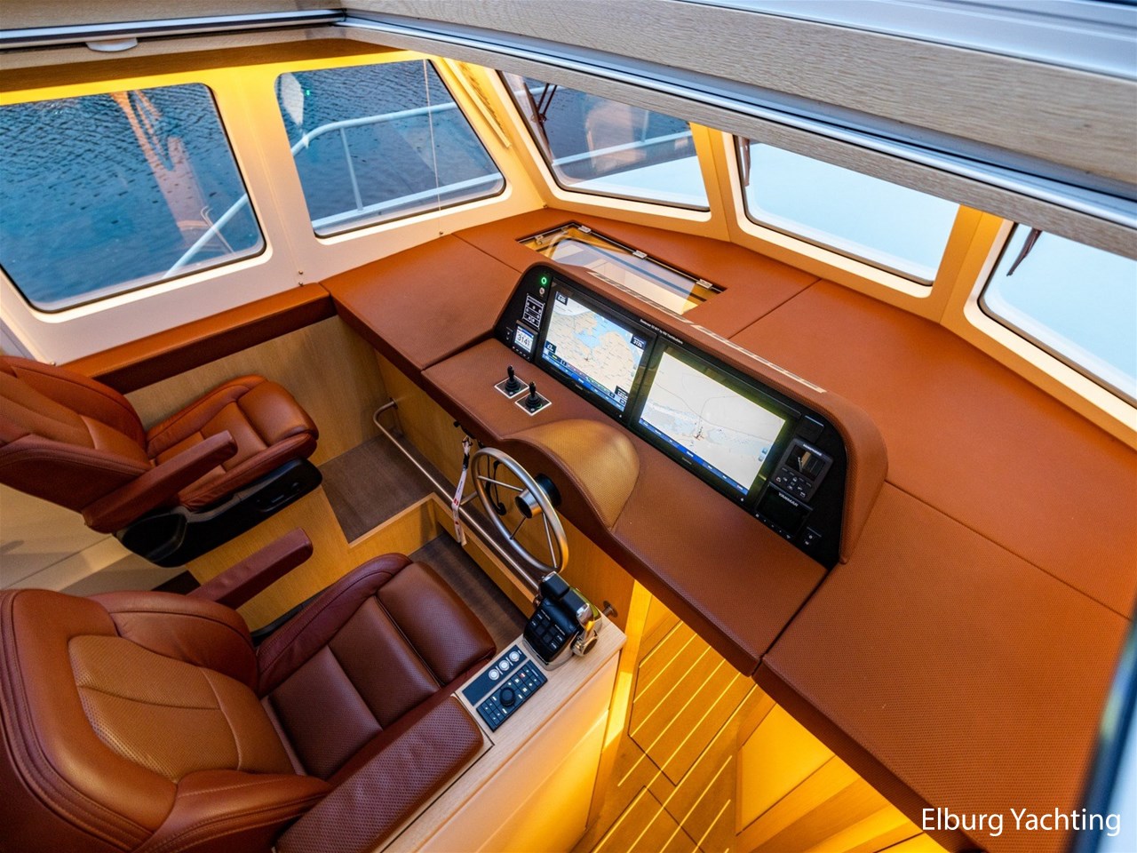 Het jacht wat u ter inspiratie kunt bezichtigen beschikt over : Achterdek en salon gelijkvloers, zij-ingang, elektrisch schuifdak bij stuurhut ( ca. 1.10 x 1.80 m, zij-ingang in reling, grote openslaande deuren naar de kuip om de salon en buitendek, dekdouche met warm/koud water bij zwemplateau, ruime leefomgeving in salon, buiten verlichting op tredes , Garmin navigatiepakket, 2 x 16" scherm, CTCV Camerasysteem voor achterdek en machinekamer, Dockmate - 2 motoren en boegschroef, Humphree interscepter set (4 x) met roll en pitch demping software + carbon vinnen, 4 x zonnepanelen op het achterdak, Fusion radio + 2 x speakers salon en 2 x cockpit (iPhone compatible), Miele was-droogcombinatie. Siemens vaatwasser, Ocean Air horren in eigenaar hut bij dekluik, shades/gordijnen in salon, lederen bekleding van de dashboardunit, elektrische lift voor vaarstoel- en passagiersstoel voor optimaal zicht, Lampe Gras zwarte design lampen, Frost zwarte douche armaturen, elektrische lift voor eettafel om te transformeren naar salon/lounge tafel, Kvadrat bekleding, geïntegreerde aluminium bolders, aluminium tredeplaat in voorroef, Aluminium geïntegreerde trap naar dak op bovenbouw, machinekamer akoestisch geïsoleerd, 3 x ruitenwissers met sproeisysteem. Lewmar dekluiken, Marlan tops, douche en toilet gescheiden voor gastenhut, Prebit leeslampjes, met USB aansluiting en dimbaar, Prebit plafondlampen dimbaar in rood/wit, Flatscreen 43" TV + lift, verborgen in salon rugleuning. In exclusieve samenwerking met Yachtfull International.