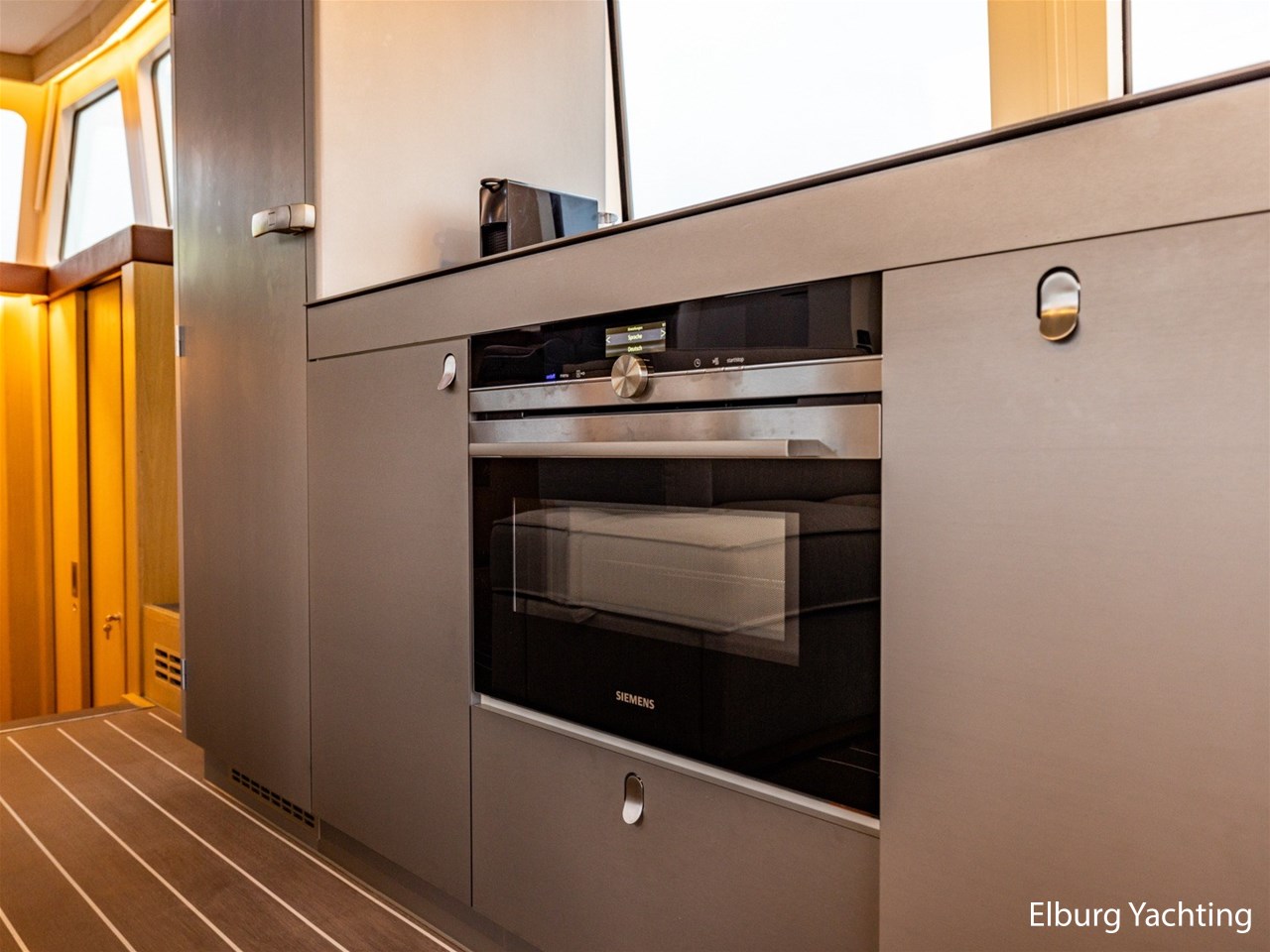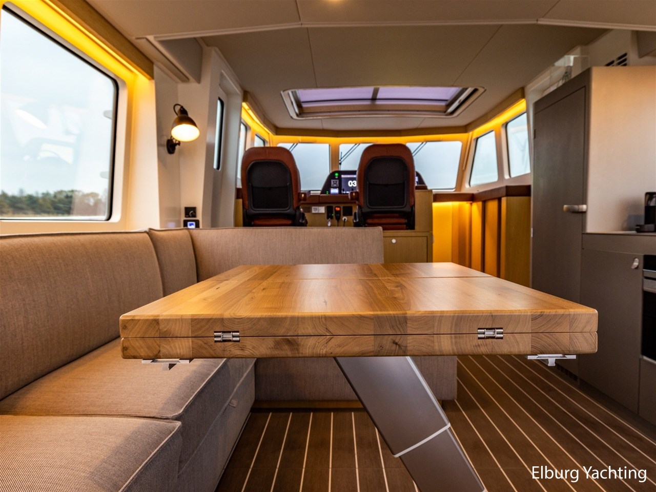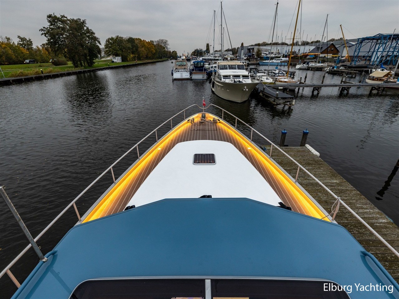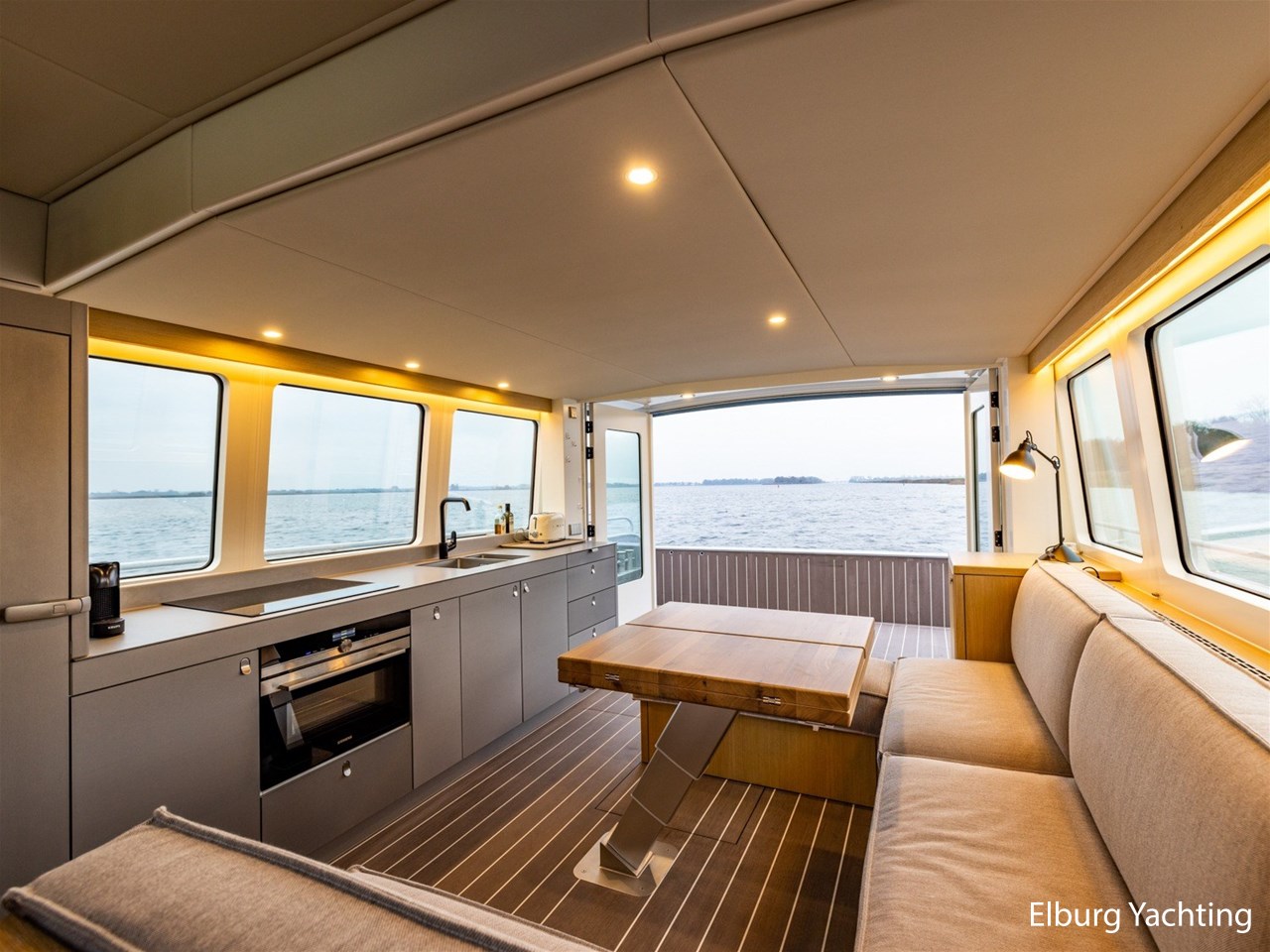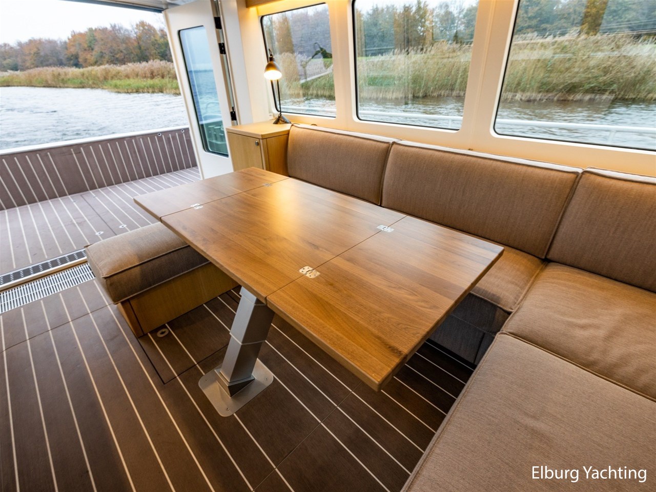 Het jacht wat u ter inspiratie kunt bezichtigen beschikt over : Achterdek en salon gelijkvloers, zij-ingang, elektrisch schuifdak bij stuurhut ( ca. 1.10 x 1.80 m, zij-ingang in reling, grote openslaande deuren naar de kuip om de salon en buitendek, dekdouche met warm/koud water bij zwemplateau, ruime leefomgeving in salon, buiten verlichting op tredes , Garmin navigatiepakket, 2 x 16" scherm, CTCV Camerasysteem voor achterdek en machinekamer, Dockmate - 2 motoren en boegschroef, Humphree interscepter set (4 x) met roll en pitch demping software + carbon vinnen, 4 x zonnepanelen op het achterdak, Fusion radio + 2 x speakers salon en 2 x cockpit (iPhone compatible), Miele was-droogcombinatie. Siemens vaatwasser, Ocean Air horren in eigenaar hut bij dekluik, shades/gordijnen in salon, lederen bekleding van de dashboardunit, elektrische lift voor vaarstoel- en passagiersstoel voor optimaal zicht, Lampe Gras zwarte design lampen, Frost zwarte douche armaturen, elektrische lift voor eettafel om te transformeren naar salon/lounge tafel, Kvadrat bekleding, geïntegreerde aluminium bolders, aluminium tredeplaat in voorroef, Aluminium geïntegreerde trap naar dak op bovenbouw, machinekamer akoestisch geïsoleerd, 3 x ruitenwissers met sproeisysteem. Lewmar dekluiken, Marlan tops, douche en toilet gescheiden voor gastenhut, Prebit leeslampjes, met USB aansluiting en dimbaar, Prebit plafondlampen dimbaar in rood/wit, Flatscreen 43" TV + lift, verborgen in salon rugleuning. In exclusieve samenwerking met Yachtfull International.