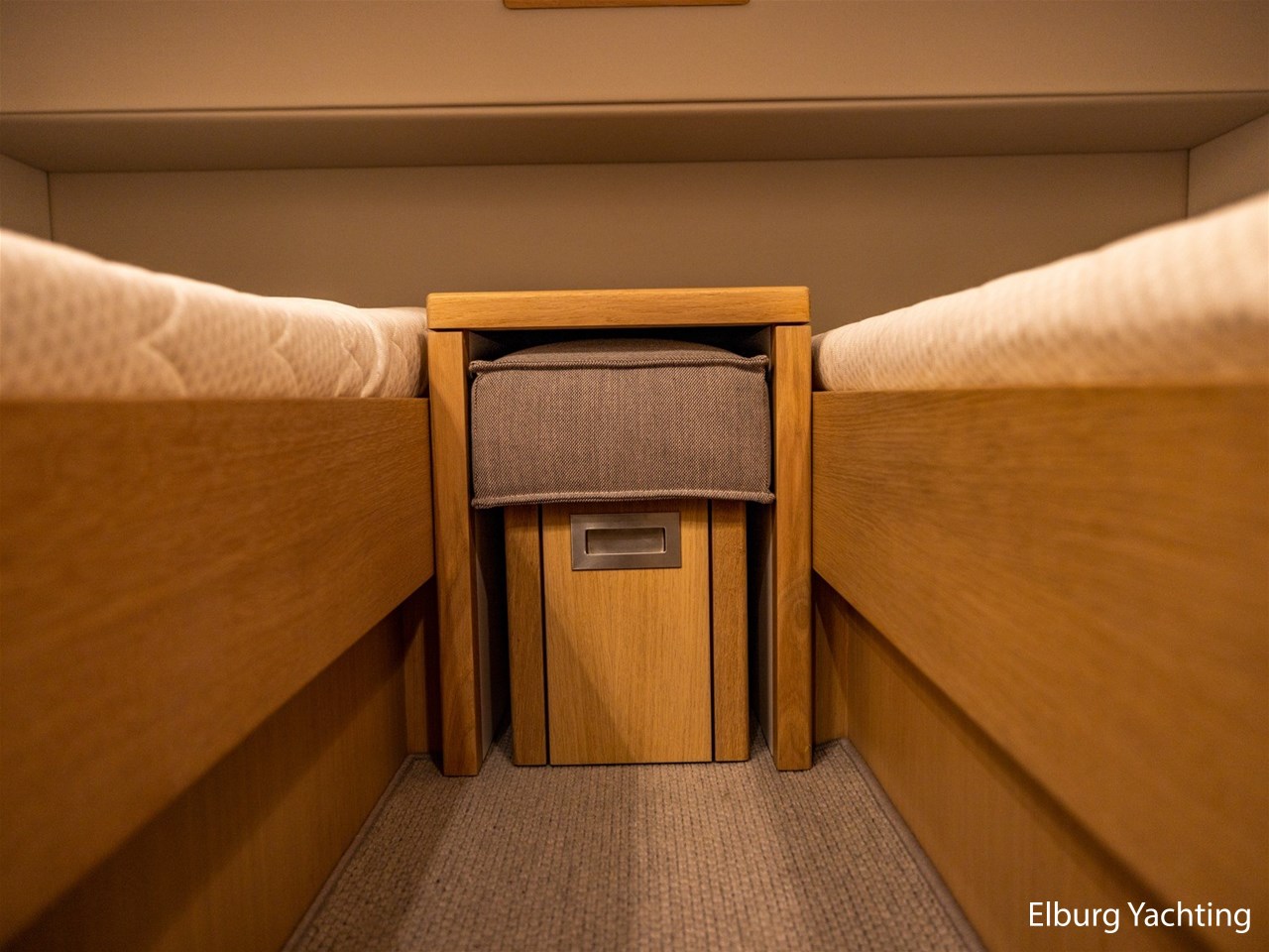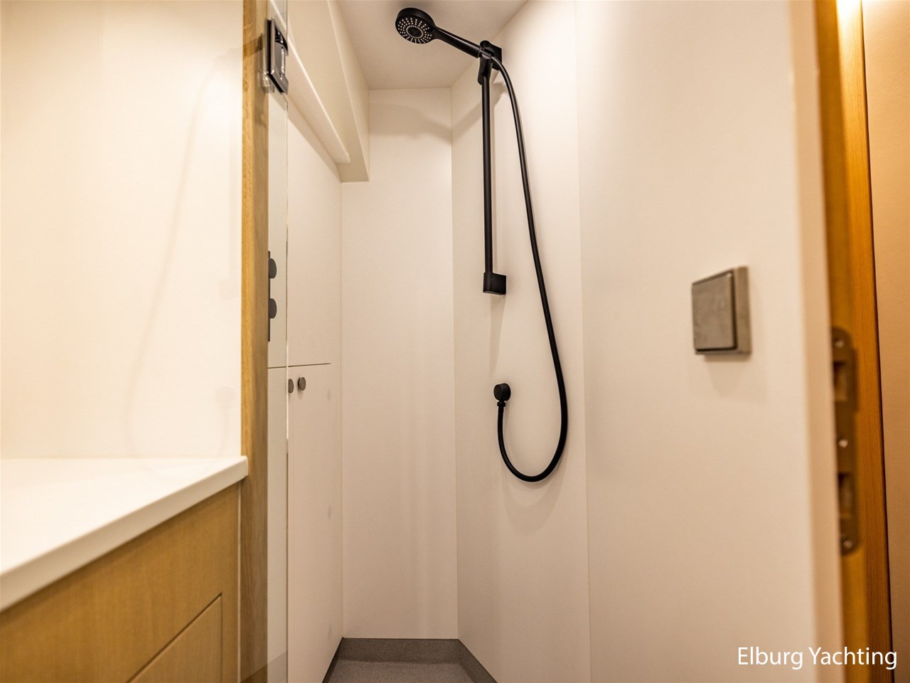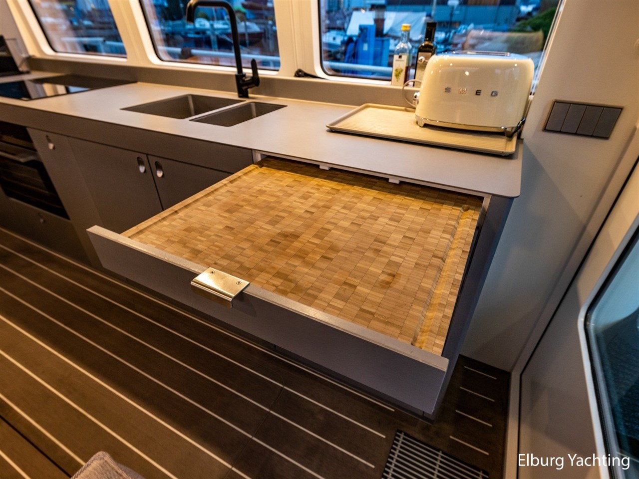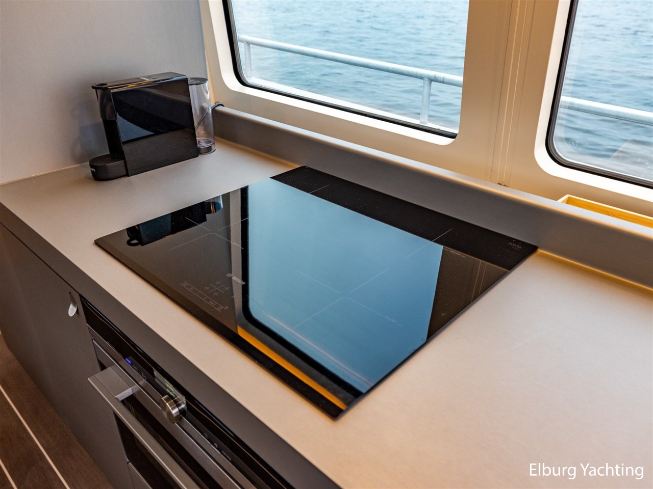 Het jacht wat u ter inspiratie kunt bezichtigen beschikt over : Achterdek en salon gelijkvloers, zij-ingang, elektrisch schuifdak bij stuurhut ( ca. 1.10 x 1.80 m, zij-ingang in reling, grote openslaande deuren naar de kuip om de salon en buitendek, dekdouche met warm/koud water bij zwemplateau, ruime leefomgeving in salon, buiten verlichting op tredes , Garmin navigatiepakket, 2 x 16" scherm, CTCV Camerasysteem voor achterdek en machinekamer, Dockmate - 2 motoren en boegschroef, Humphree interscepter set (4 x) met roll en pitch demping software + carbon vinnen, 4 x zonnepanelen op het achterdak, Fusion radio + 2 x speakers salon en 2 x cockpit (iPhone compatible), Miele was-droogcombinatie. Siemens vaatwasser, Ocean Air horren in eigenaar hut bij dekluik, shades/gordijnen in salon, lederen bekleding van de dashboardunit, elektrische lift voor vaarstoel- en passagiersstoel voor optimaal zicht, Lampe Gras zwarte design lampen, Frost zwarte douche armaturen, elektrische lift voor eettafel om te transformeren naar salon/lounge tafel, Kvadrat bekleding, geïntegreerde aluminium bolders, aluminium tredeplaat in voorroef, Aluminium geïntegreerde trap naar dak op bovenbouw, machinekamer akoestisch geïsoleerd, 3 x ruitenwissers met sproeisysteem. Lewmar dekluiken, Marlan tops, douche en toilet gescheiden voor gastenhut, Prebit leeslampjes, met USB aansluiting en dimbaar, Prebit plafondlampen dimbaar in rood/wit, Flatscreen 43" TV + lift, verborgen in salon rugleuning. In exclusieve samenwerking met Yachtfull International.