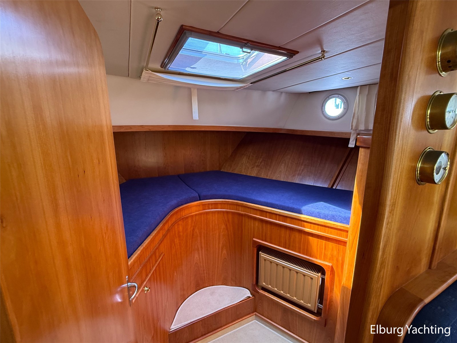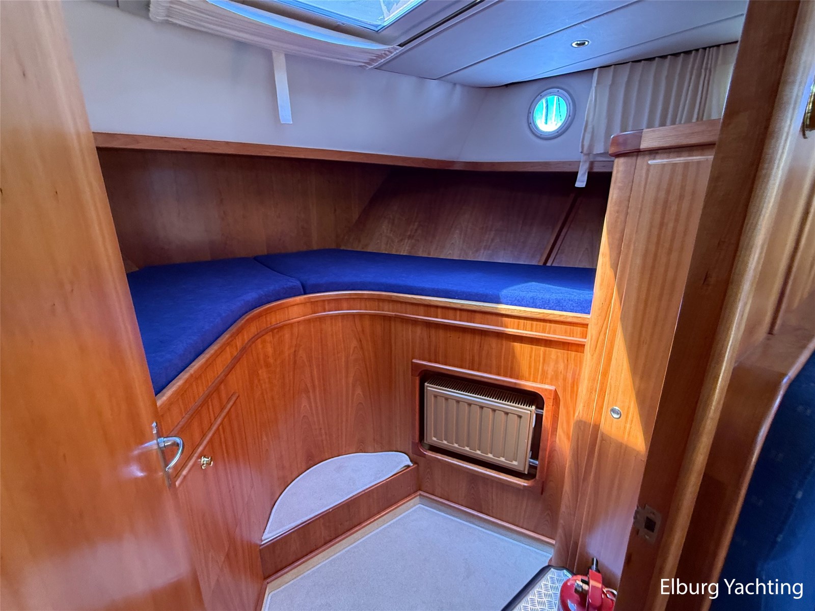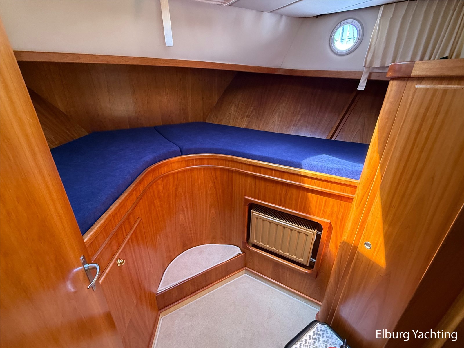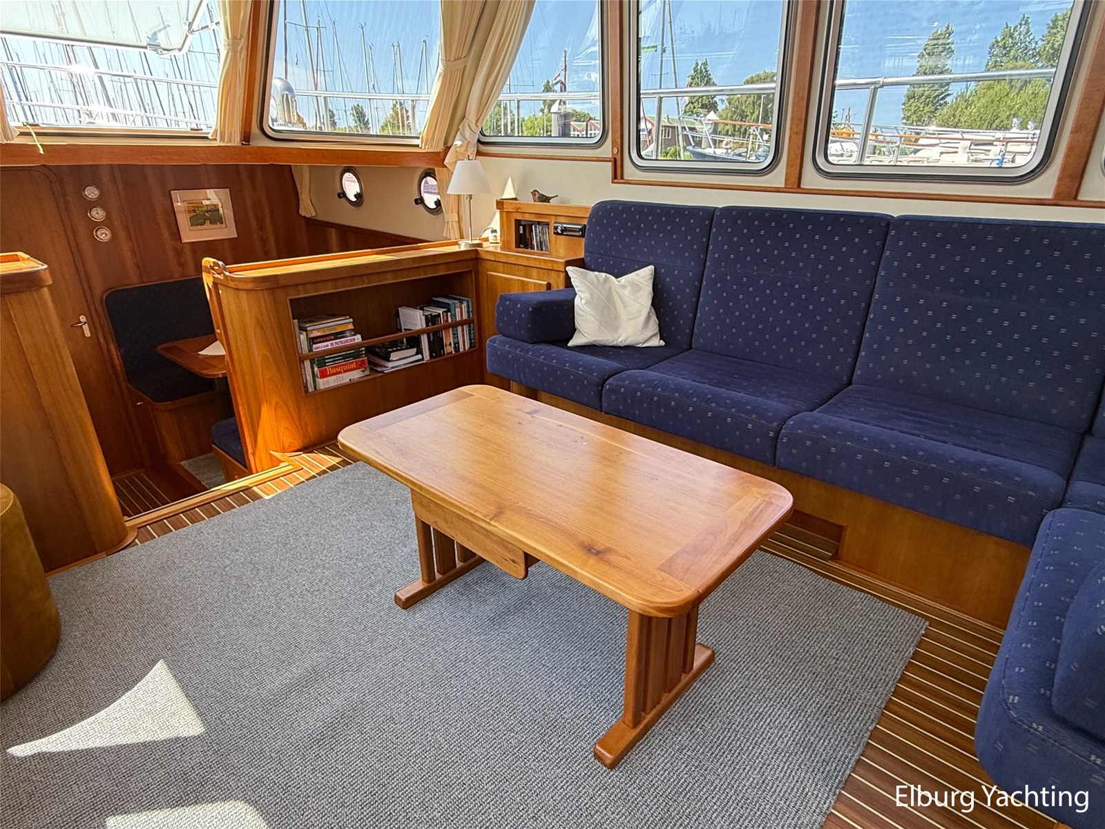 - Goed geïsoleerd met scheeps kersenhoutenbetimmering in combinatie met Teakhouten holly vloer en blauwe bekleding