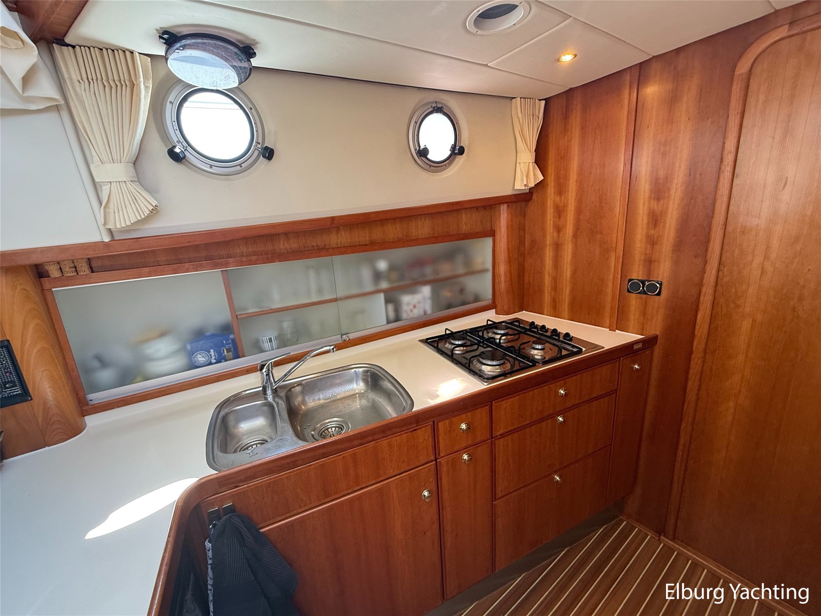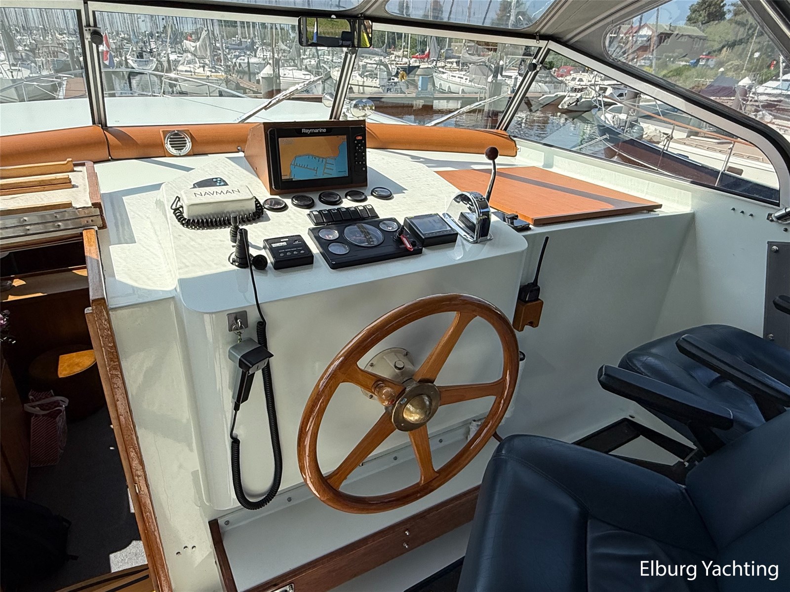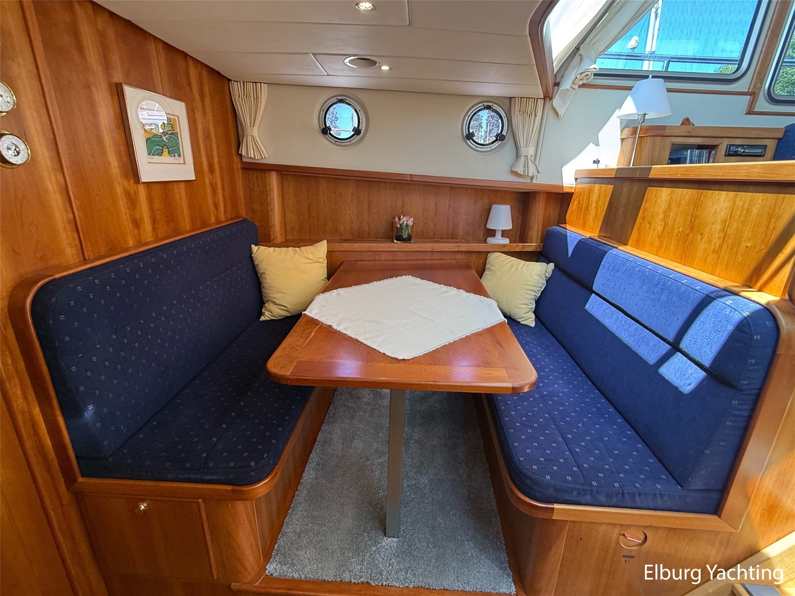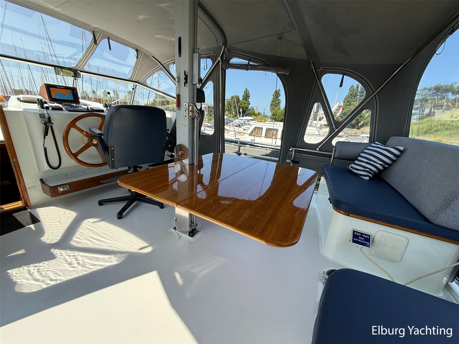 - Goed geïsoleerd met scheeps kersenhoutenbetimmering in combinatie met Teakhouten holly vloer en blauwe bekleding