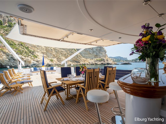 Het brugdek beschikt over een bar, vaste bank aan de achterzijde en veel dek-ruimte flexibel te gebruiken, zeker wanneer beide tenders worden ingezet. Een klein zonnedek bovenop de brug biedt enige privacy, grote zonnekussens en een prachtig uitzicht. Een bank op het voordek biedt extra privé zitplaatsen buiten.