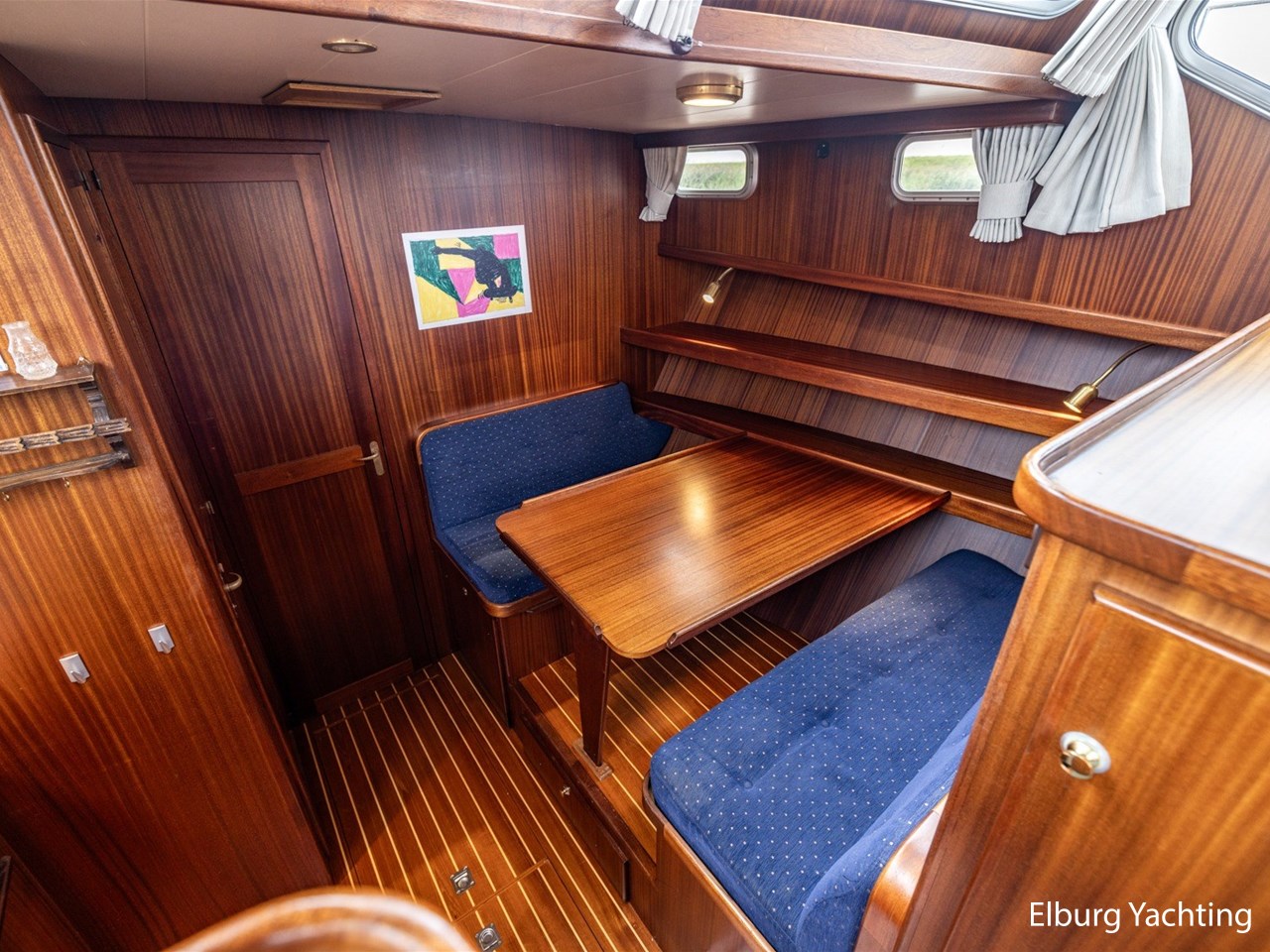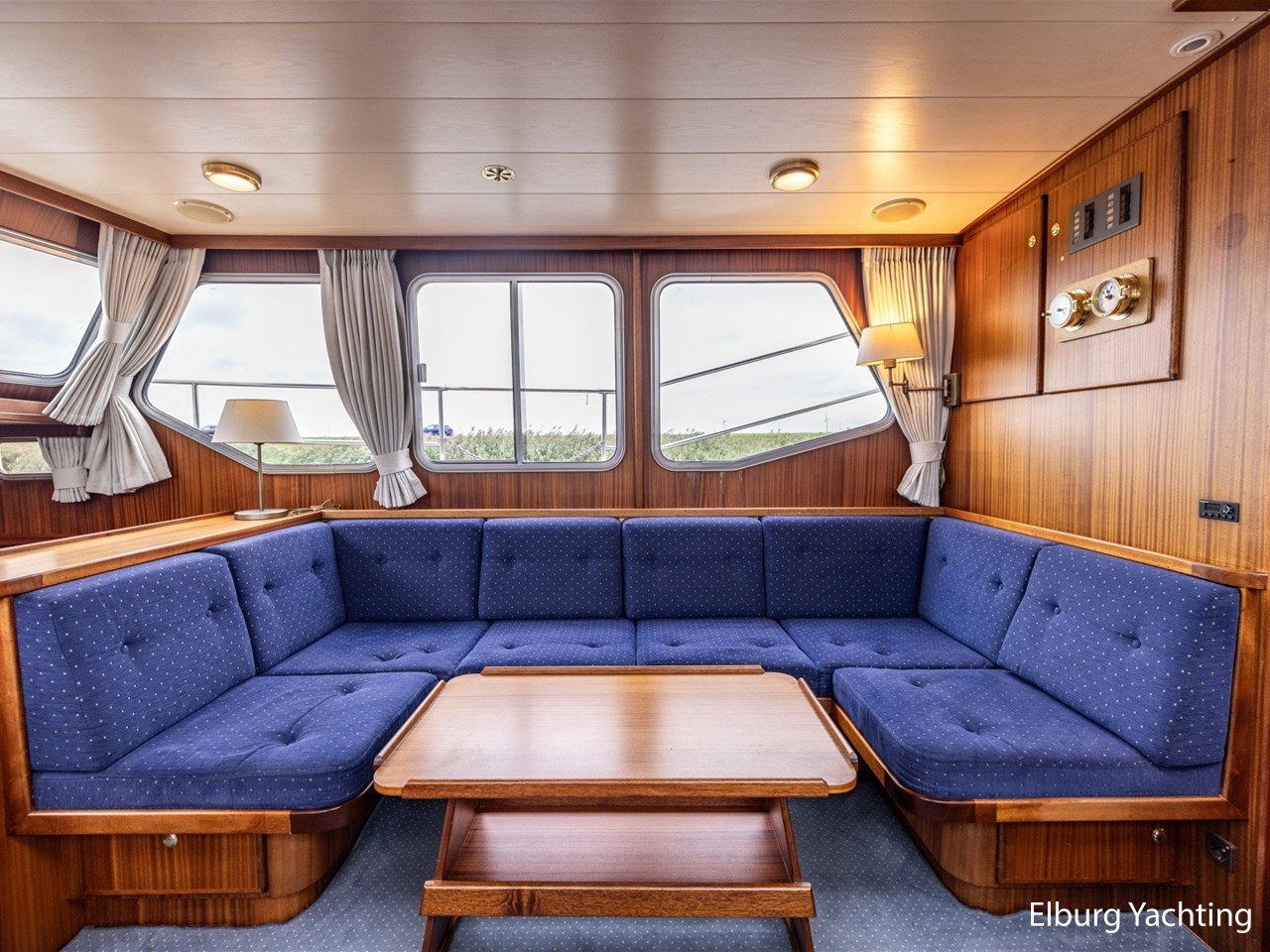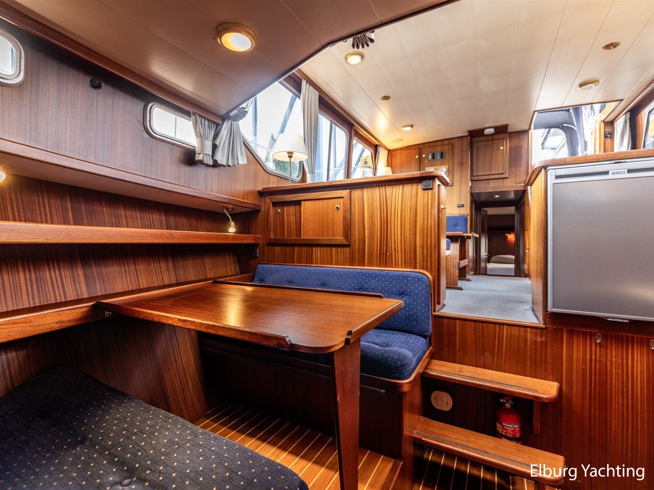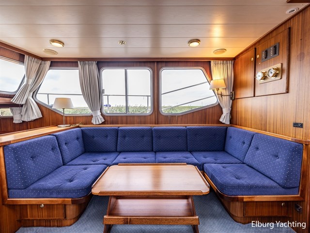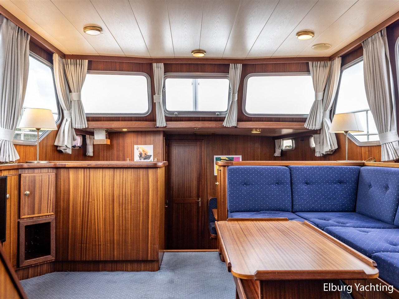 - Scheeps zijdeglas mahonyhouten interieur met blauwe kussens en een bijpassende vloer