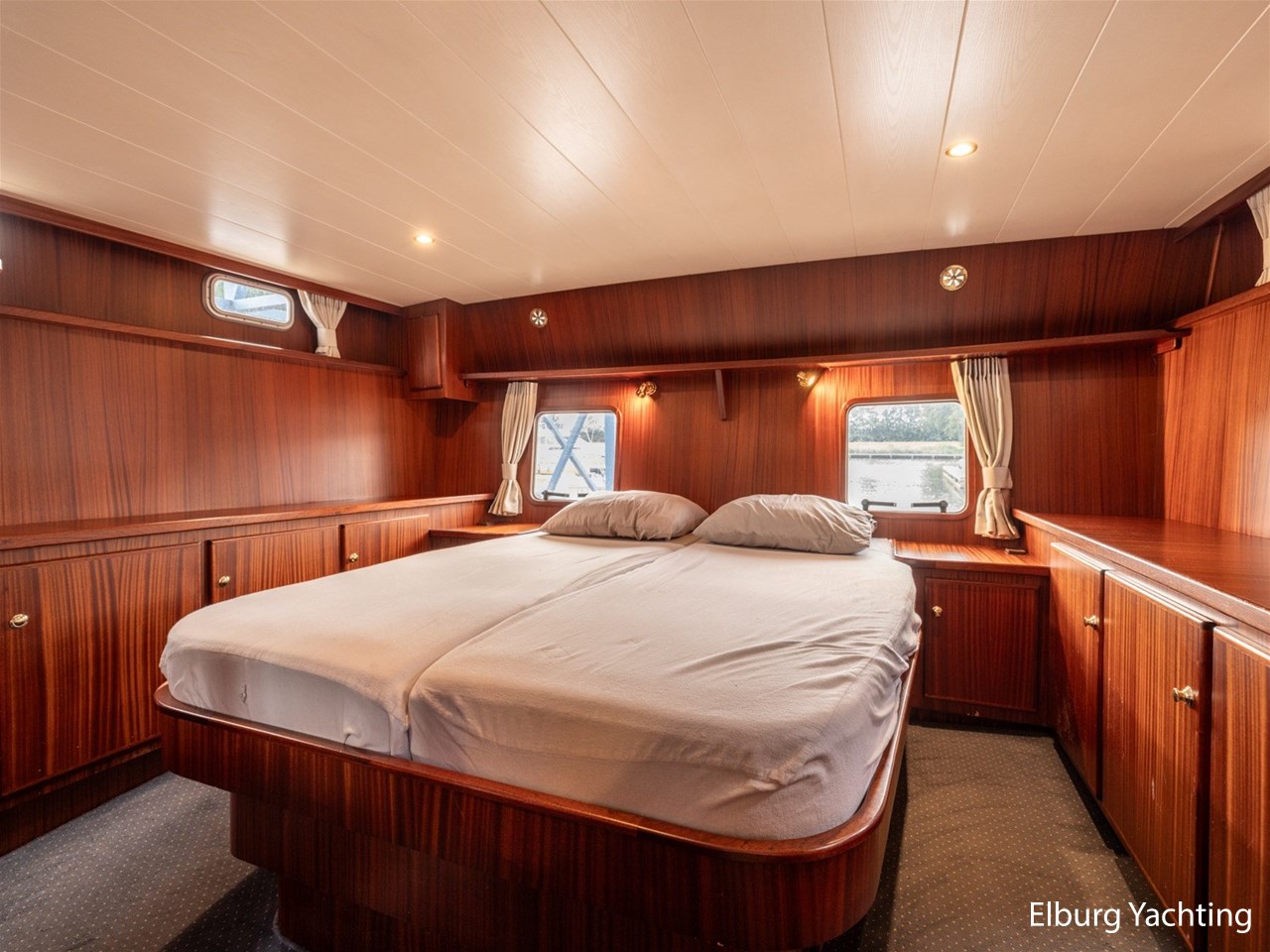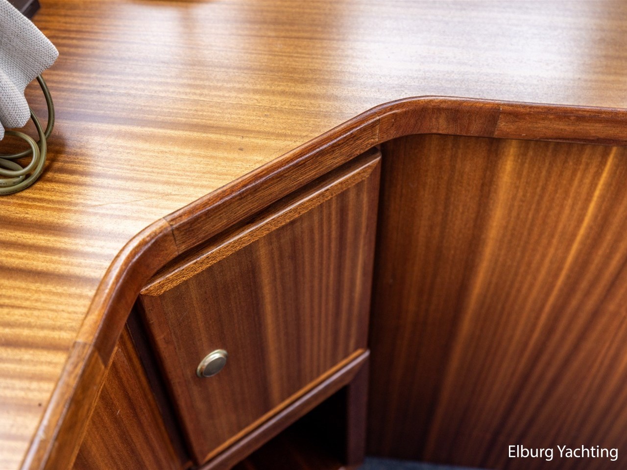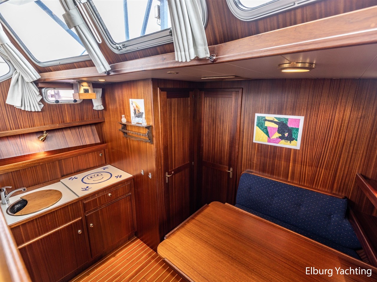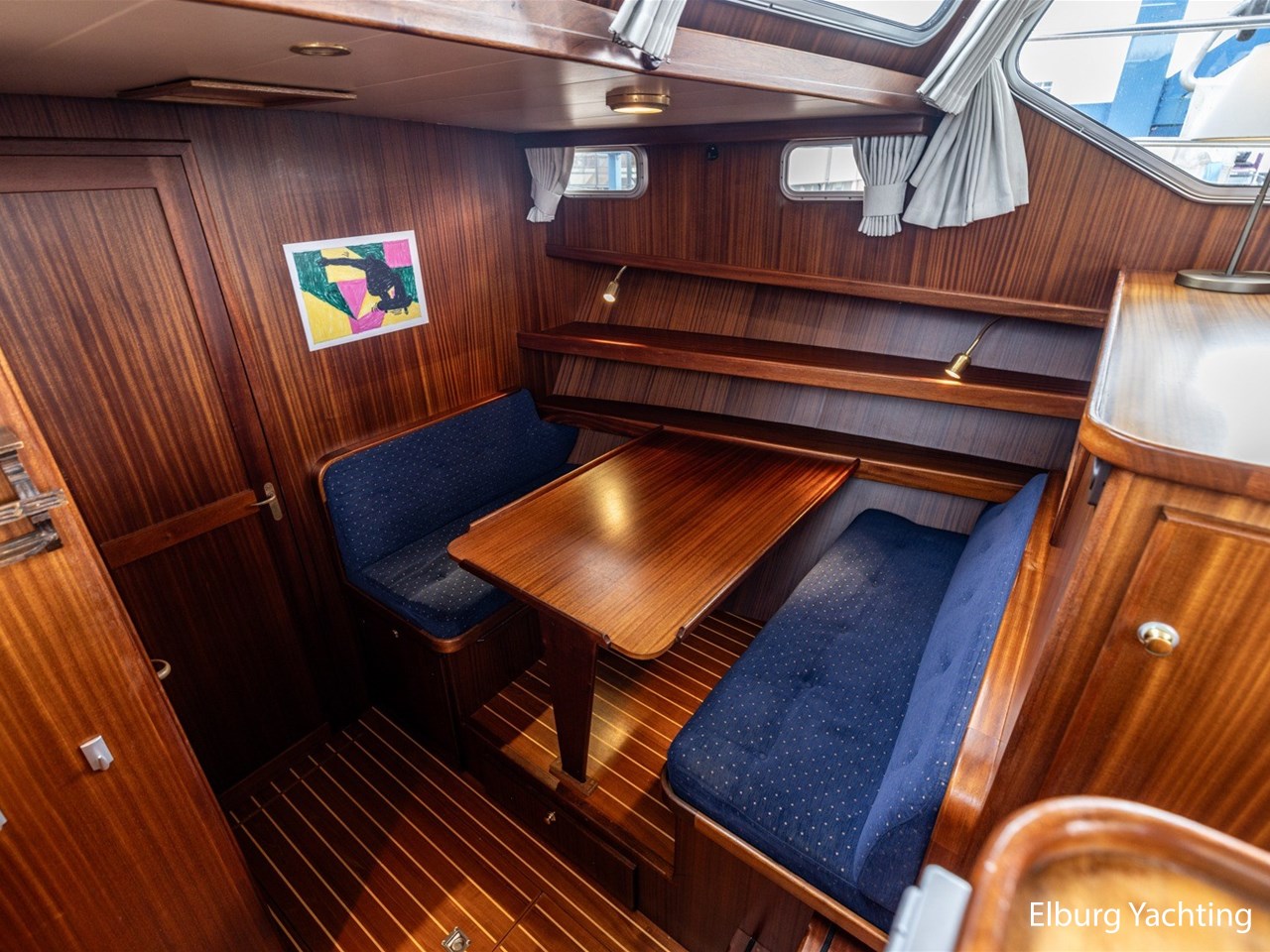- Scheeps zijdeglas mahonyhouten interieur met blauwe kussens en een bijpassende vloer