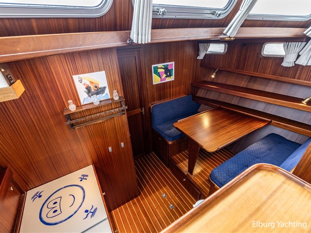 Strakke, goed verzorgde en degelijk gebouwde Privateer 40 XL gebouwd te Privateer Yachts in Uitwellingerga. Rondom is de Privateer 40 XL voorzien van een degelijk dek gemaakt van kurk. Rondom is er niet bezuinigd op de Privateer. Zo valt onder andere de dubbel uitgevoerde r.v.s. zeerailing op alsook de r.v.s. potdeksels. De gangboorden zijn zeer royaal waardoor u zich gemakkelijk verplaatst aan boord. De Privateer 40 XL beschikt over een zeer ruime open kuip, waar zich ook de vaste stuurstand bevindt. De open kuip verbindt zich met de salon via een riante trap. De salon bestaat uit prachtig mahony houten interieur met nette blauwe kussens, te openen ramen aan bak- en stuurboord en een het middelste raam aan de voorzijde kan ook opengeklapt worden. De eigenaarshut is erg royaal uitgevoerd en beschikt over een riant Frans bed, veel opbergruimte, airconditioning en meerdere te openen ramen met muggenhorren. De Privateer 40 XL beschikt over een ruime natte cel met eigen douchecabine en twee aparte elektrische toiletten, luxe 2 persoons vaarstoel bij stuurstand, veel opbergmogelijkheden aan dek in de verschillende bakskisten, volledig afluitbare tent rondom gehele achterdek, klapbare ramen voor lage kruiphoogte, dekwaspomp, 2 x raam in spiegel, Candy wasmachine 120ES.