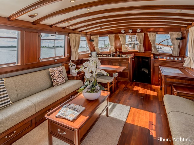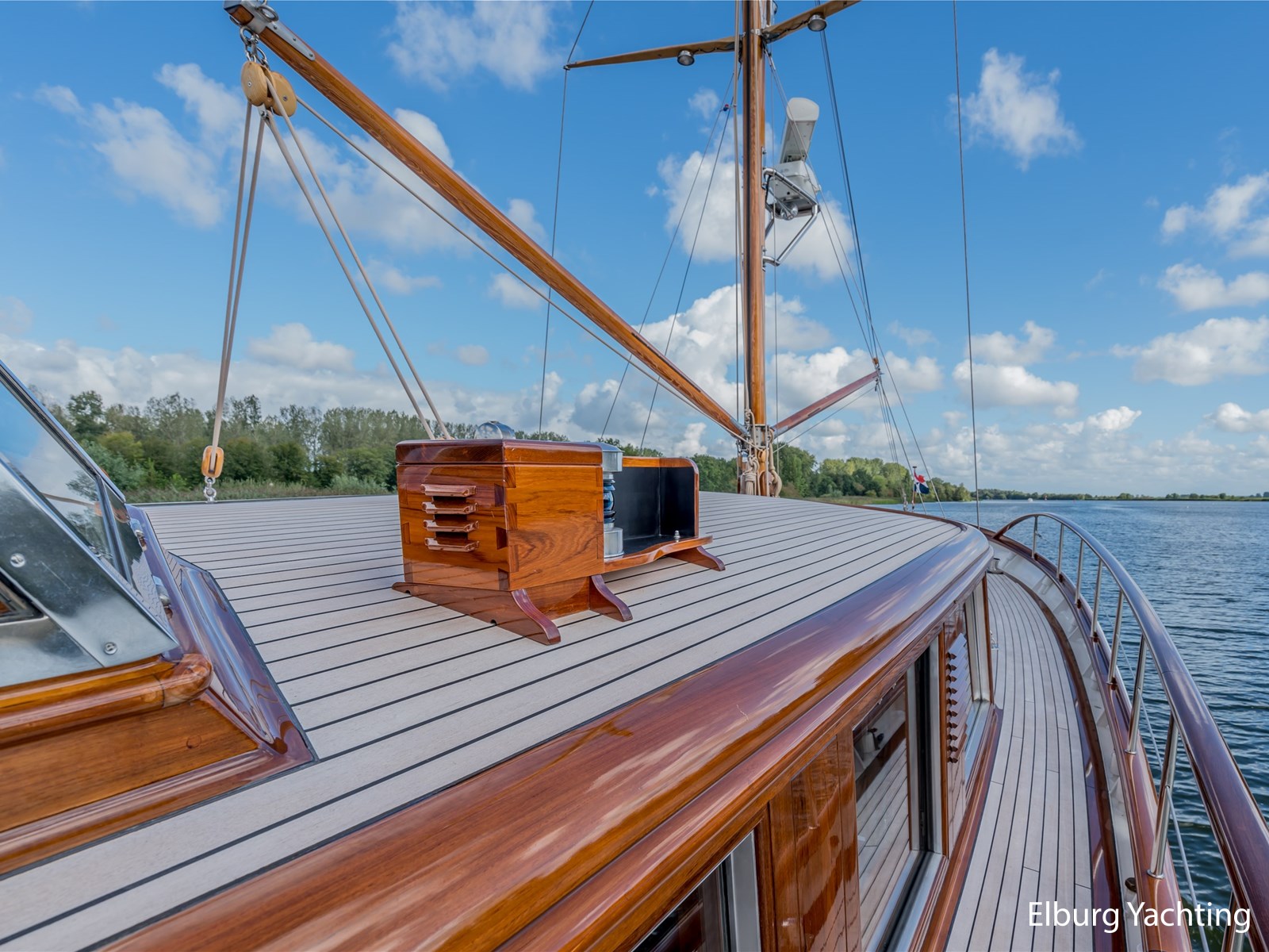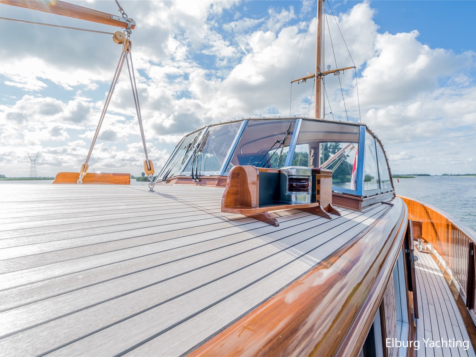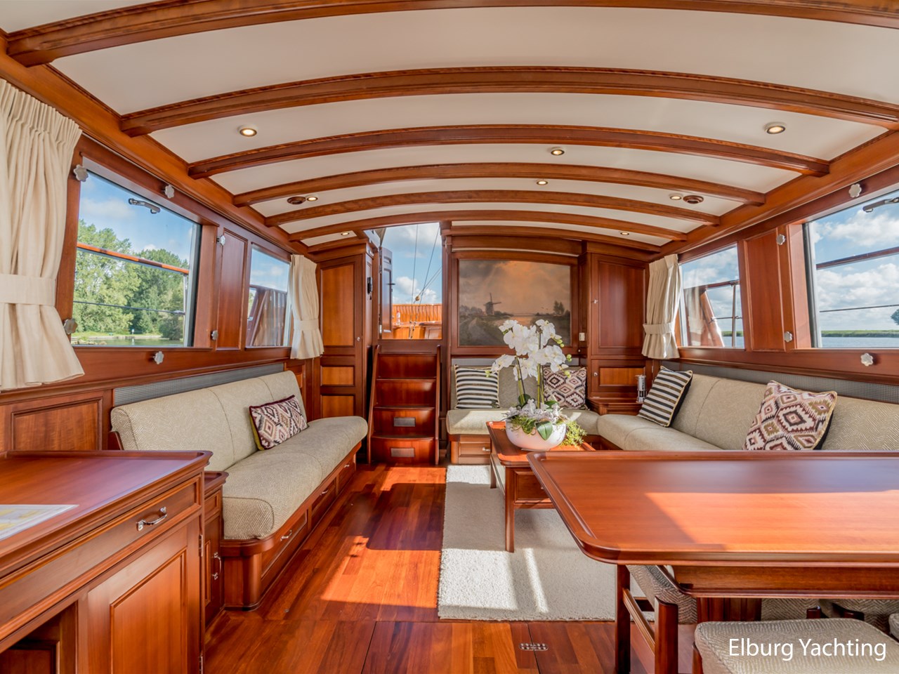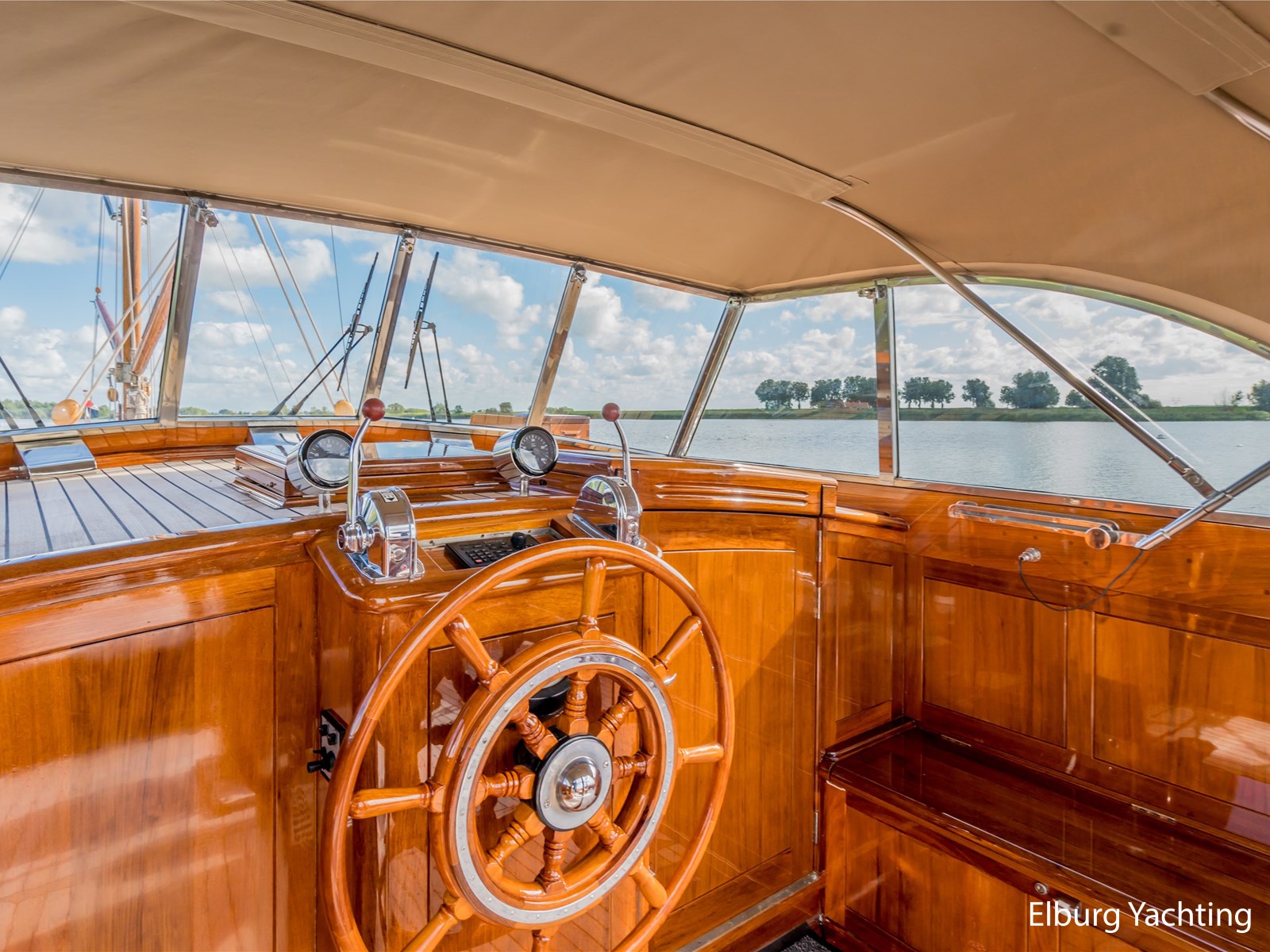 De Lunstroo 56 - (Total Refit 2015) is een stuk maritieme geschiedenis en zonder twijfel een van de meest in het oog springende kotterjachten die rondvaart. Het schip is gelanceerd in 1974, maar heeft in 2015 een volledige refit ondergaan op bij Nicolaas Witsen, waar kosten nog moeite zijn gespaard. Het schip heeft 2 nieuwe Perkins motoren gekregen, welke bekend staan om het lage toerental en laag geluidsniveau. Tijdens de refit is o.a. het volgende uitgevoerd : Nieuw massief teakdek (22 mm), nieuw teak kajuitdak (15 mm), Alle gelakte teakhout elementen van de kajuitopbouw zijn nieuw vervaardigd, verchroomde patrijspoorten, nieuw verpakte raamframes, de gehele elektrische installatie is vernieuwd incl. pompen en andere apparaten, nieuwe navigatieapparatuur, nieuw schroefassen, schroefaslagers, stuwdruklagers en schroeven. Alle tanks zijn open geweest, schoongemaakt en geïnspecteerd. (Zowel diesel, water en vuilwatertanks.), Leidingwerk is gemeten op wanddikte. Romp geschilderd in Awl Grip. Al het blanke lakwerk met impregneerhars en Dubbel UV Coating van Dubbelcoat Van de IJssel. (met uitzondering van de rondhouten), Motorbediening Morse omgebouwd tot elektronische bediening, Kabola CV met warmwatervoorziening gemonteerd, nieuwe stoffering, nieuw matrassen. De Lunstroo 56 beschikt over veel leefruimte in de salon en op het achterdek. Het is een uniek motorjacht met hoogwaardige afwerking met modern comfort en nieuwe techniek, geschikt om voor langere tijd op te verblijven. R.v.s. reling, r.v.s stootlijst, ruime zitgelegenheid in de salon, 7 slaapplaatsen, chroom omrand windscherm, achteringang, 2 x vluchtluik voorin, Miele wasmachine, stahoogte ca. 2 meter, achterhut geschikt voor crewcabine (incl. entree machinekamer), goed geïsoleerde machinekamer. Stereoset BOSE Binnen en Buiten (2015), Lowe TV + Lift (2015), CVO certificaat aanwezig, bilge alarm aanwezig in 3 zone’s . De huidige eigenaar heeft om makkelijker lage bruggen te passeren de voormast gedemonteerd en droog opgeslagen en de achtermast klapbaar gemaakt d.m.v. een lier. Ook is in de stuurboord hut één van de stabelbedden weggenomen om meer ruimte te creëren. De doorvaarthoogte met mast op is ca. 8,40m en met geklapte mast en kuipramen geklapt ca. 2,90m.