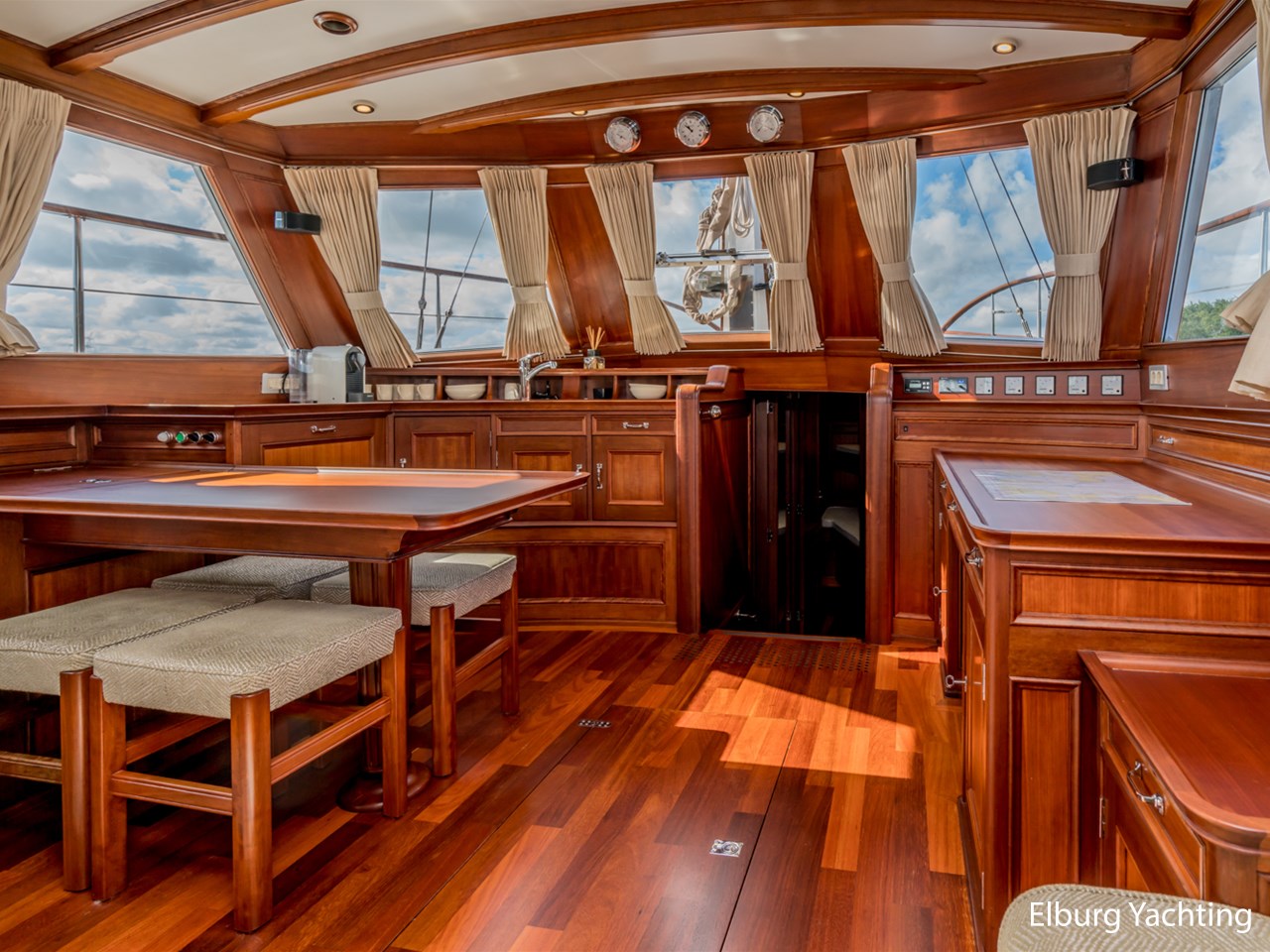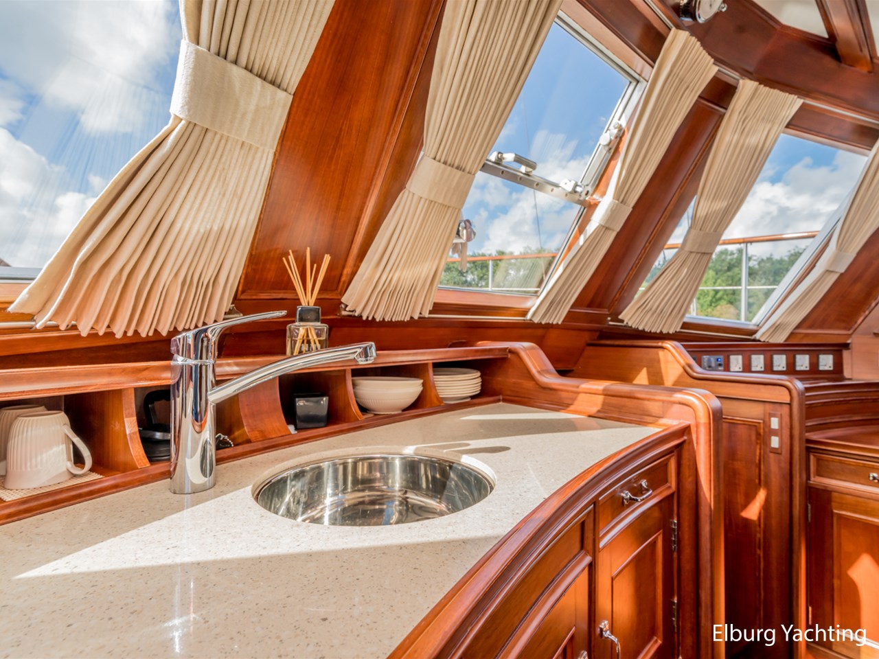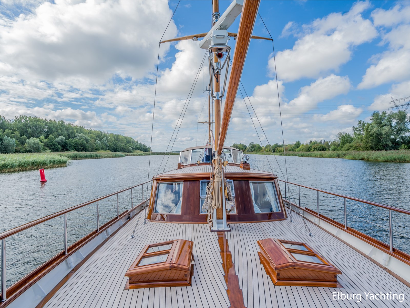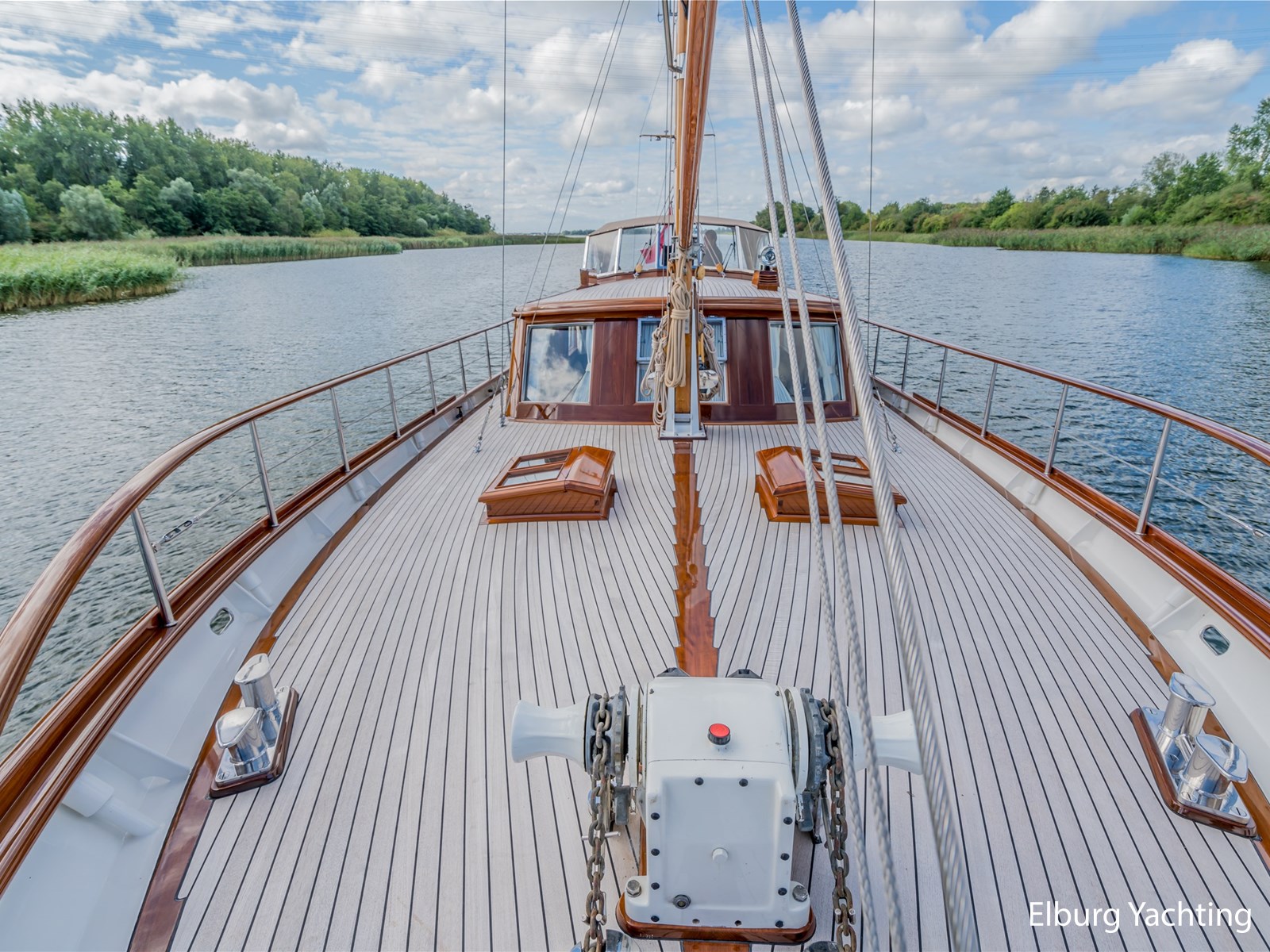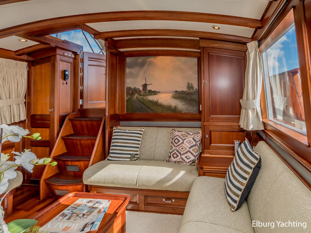 De Lunstroo 56 - (Total Refit 2015) is een stuk maritieme geschiedenis en zonder twijfel een van de meest in het oog springende kotterjachten die rondvaart. Het schip is gelanceerd in 1974, maar heeft in 2015 een volledige refit ondergaan op bij Nicolaas Witsen, waar kosten nog moeite zijn gespaard. Het schip heeft 2 nieuwe Perkins motoren gekregen, welke bekend staan om het lage toerental en laag geluidsniveau. Tijdens de refit is o.a. het volgende uitgevoerd : Nieuw massief teakdek (22 mm), nieuw teak kajuitdak (15 mm), Alle gelakte teakhout elementen van de kajuitopbouw zijn nieuw vervaardigd, verchroomde patrijspoorten, nieuw verpakte raamframes, de gehele elektrische installatie is vernieuwd incl. pompen en andere apparaten, nieuwe navigatieapparatuur, nieuw schroefassen, schroefaslagers, stuwdruklagers en schroeven. Alle tanks zijn open geweest, schoongemaakt en geïnspecteerd. (Zowel diesel, water en vuilwatertanks.), Leidingwerk is gemeten op wanddikte. Romp geschilderd in Awl Grip. Al het blanke lakwerk met impregneerhars en Dubbel UV Coating van Dubbelcoat Van de IJssel. (met uitzondering van de rondhouten), Motorbediening Morse omgebouwd tot elektronische bediening, Kabola CV met warmwatervoorziening gemonteerd, nieuwe stoffering, nieuw matrassen. De Lunstroo 56 beschikt over veel leefruimte in de salon en op het achterdek. Het is een uniek motorjacht met hoogwaardige afwerking met modern comfort en nieuwe techniek, geschikt om voor langere tijd op te verblijven. R.v.s. reling, r.v.s stootlijst, ruime zitgelegenheid in de salon, 7 slaapplaatsen, chroom omrand windscherm, achteringang, 2 x vluchtluik voorin, Miele wasmachine, stahoogte ca. 2 meter, achterhut geschikt voor crewcabine (incl. entree machinekamer), goed geïsoleerde machinekamer. Stereoset BOSE Binnen en Buiten (2015), Lowe TV + Lift (2015), CVO certificaat aanwezig, bilge alarm aanwezig in 3 zone’s . De huidige eigenaar heeft om makkelijker lage bruggen te passeren de voormast gedemonteerd en droog opgeslagen en de achtermast klapbaar gemaakt d.m.v. een lier. Ook is in de stuurboord hut één van de stabelbedden weggenomen om meer ruimte te creëren. De doorvaarthoogte met mast op is ca. 8,40m en met geklapte mast en kuipramen geklapt ca. 2,90m.