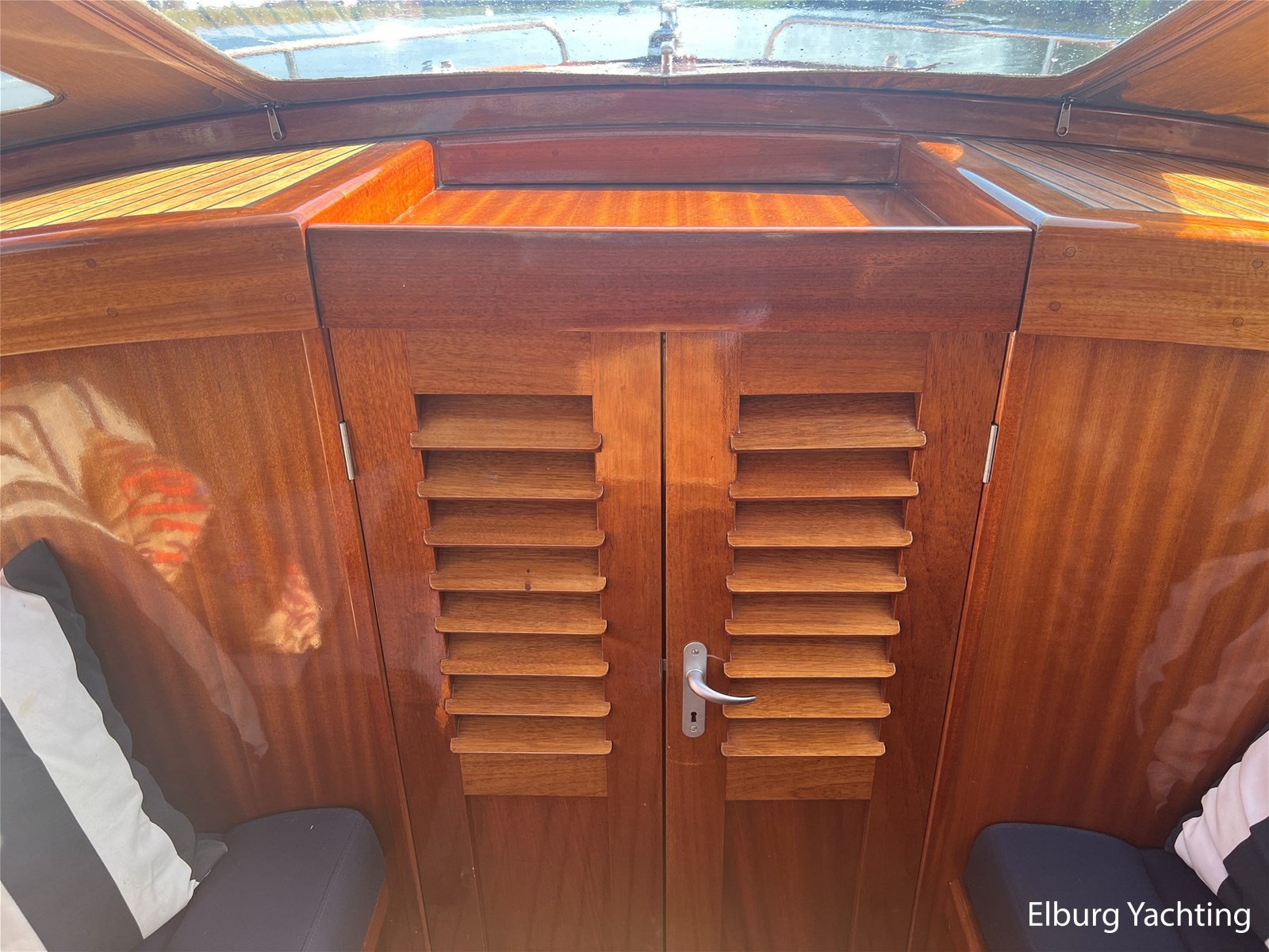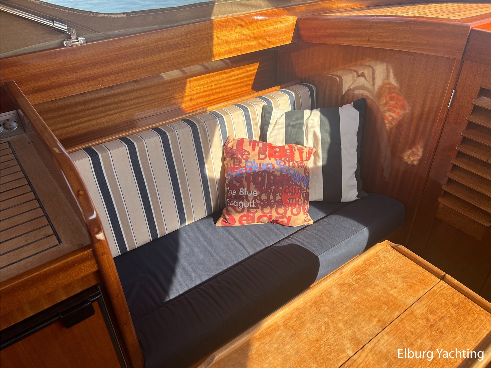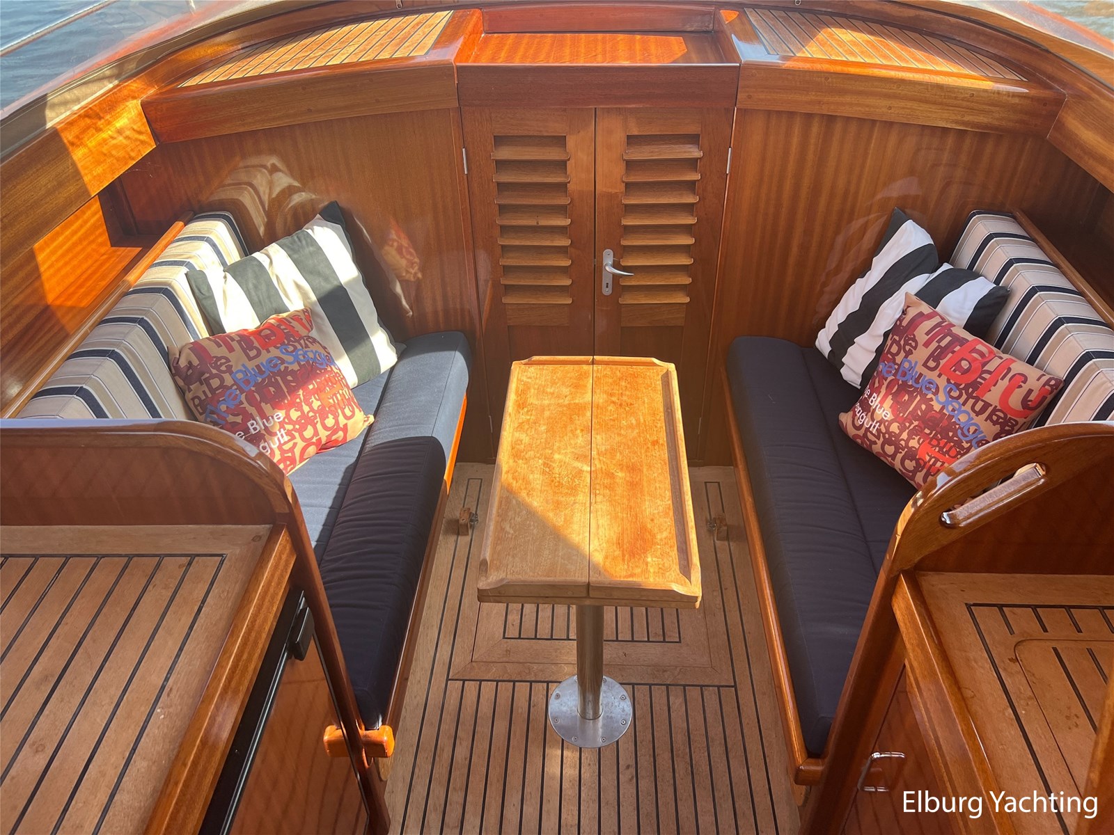 - Teakhouten interieur met wit/donkerblauwe bekleding