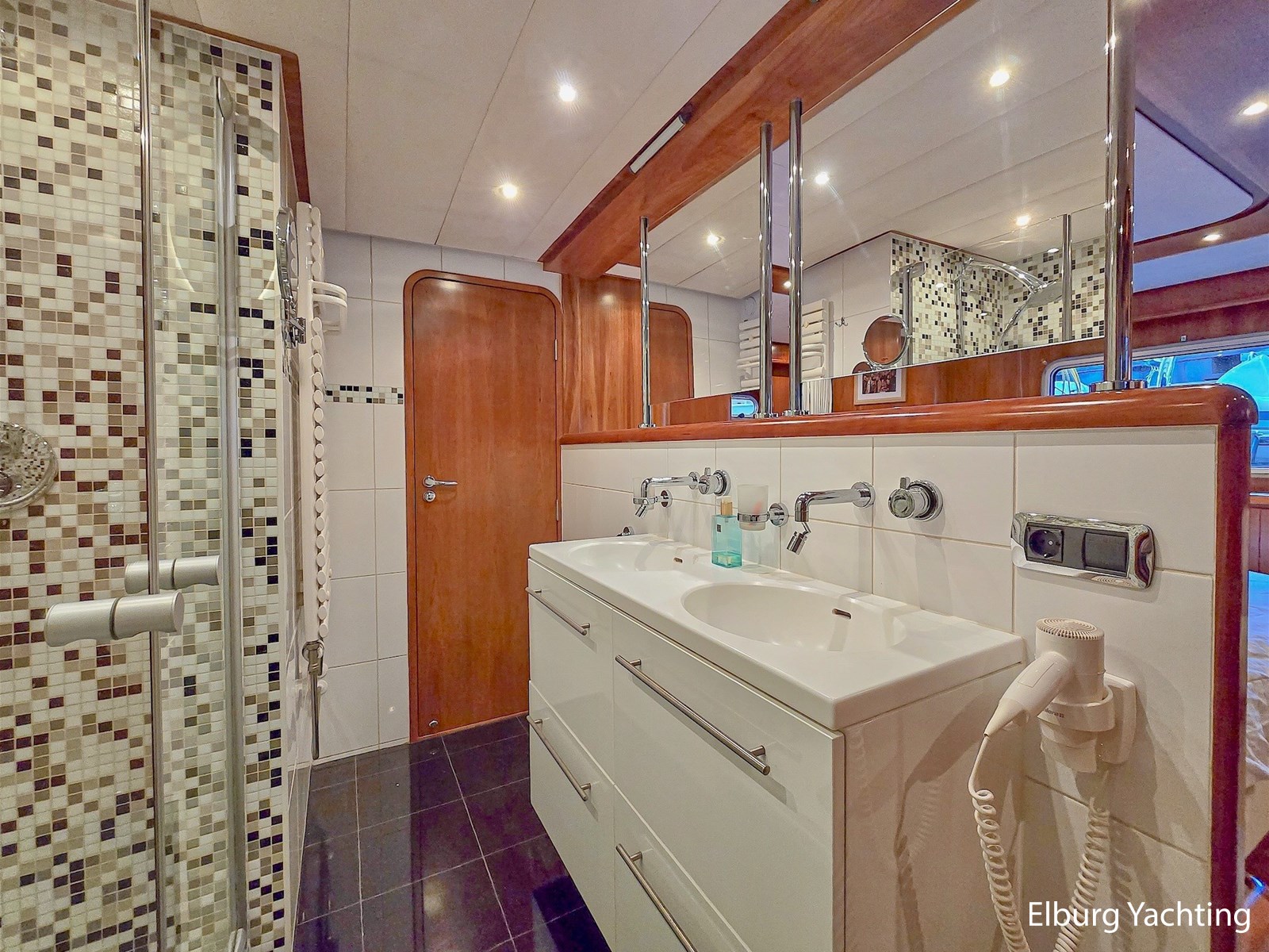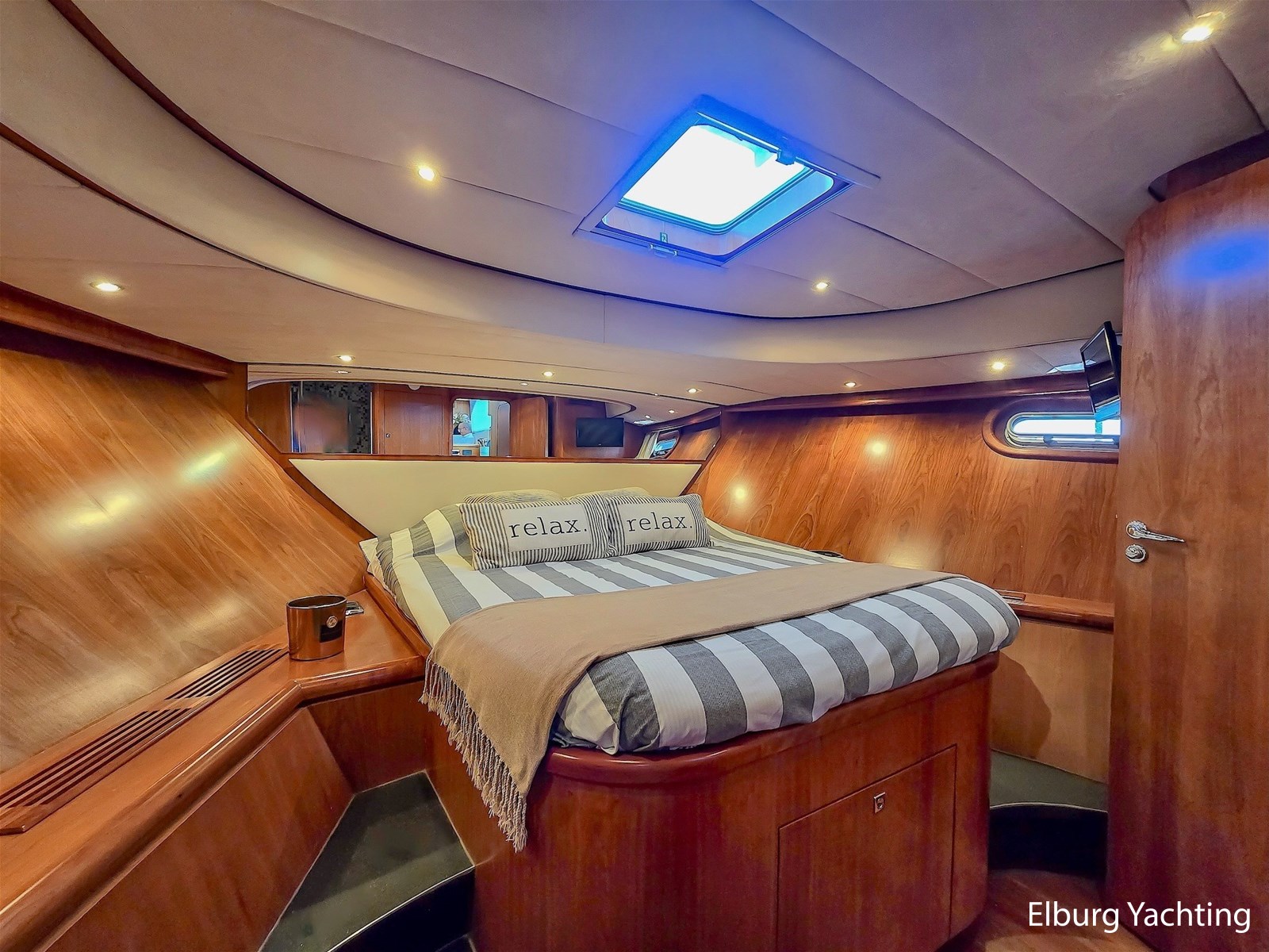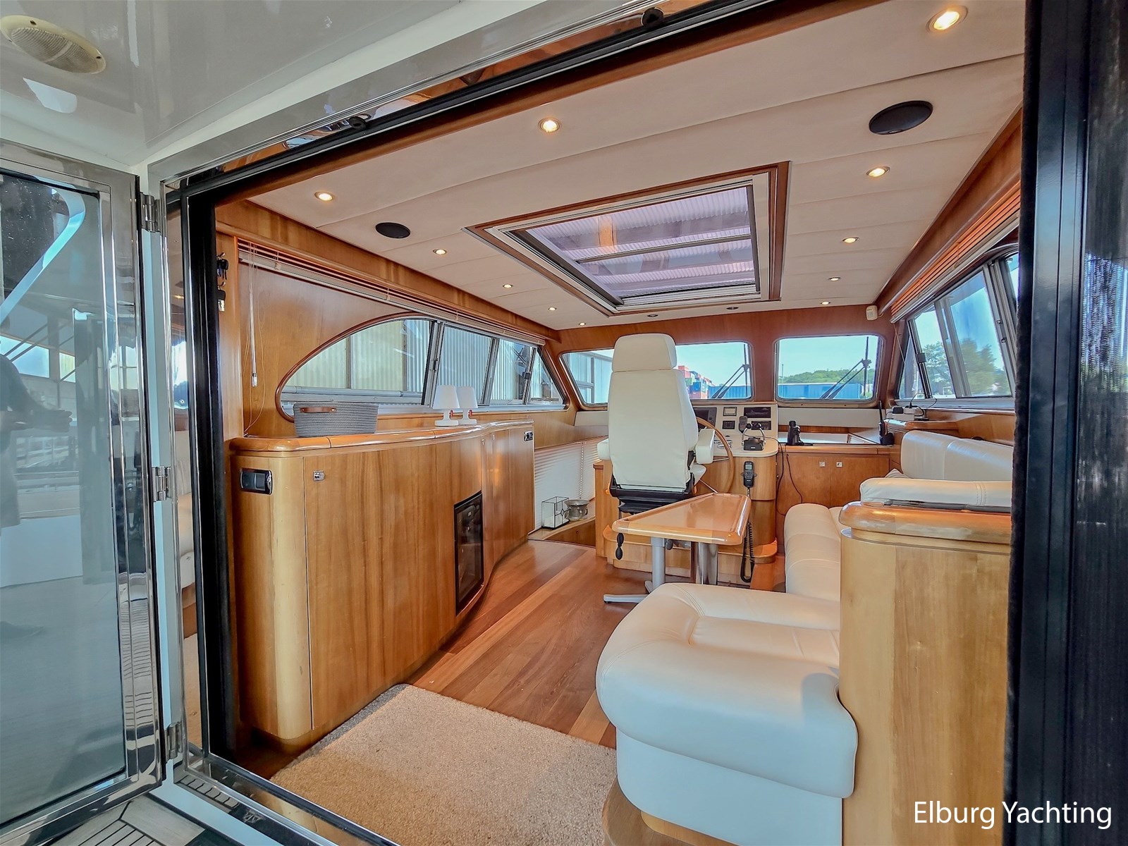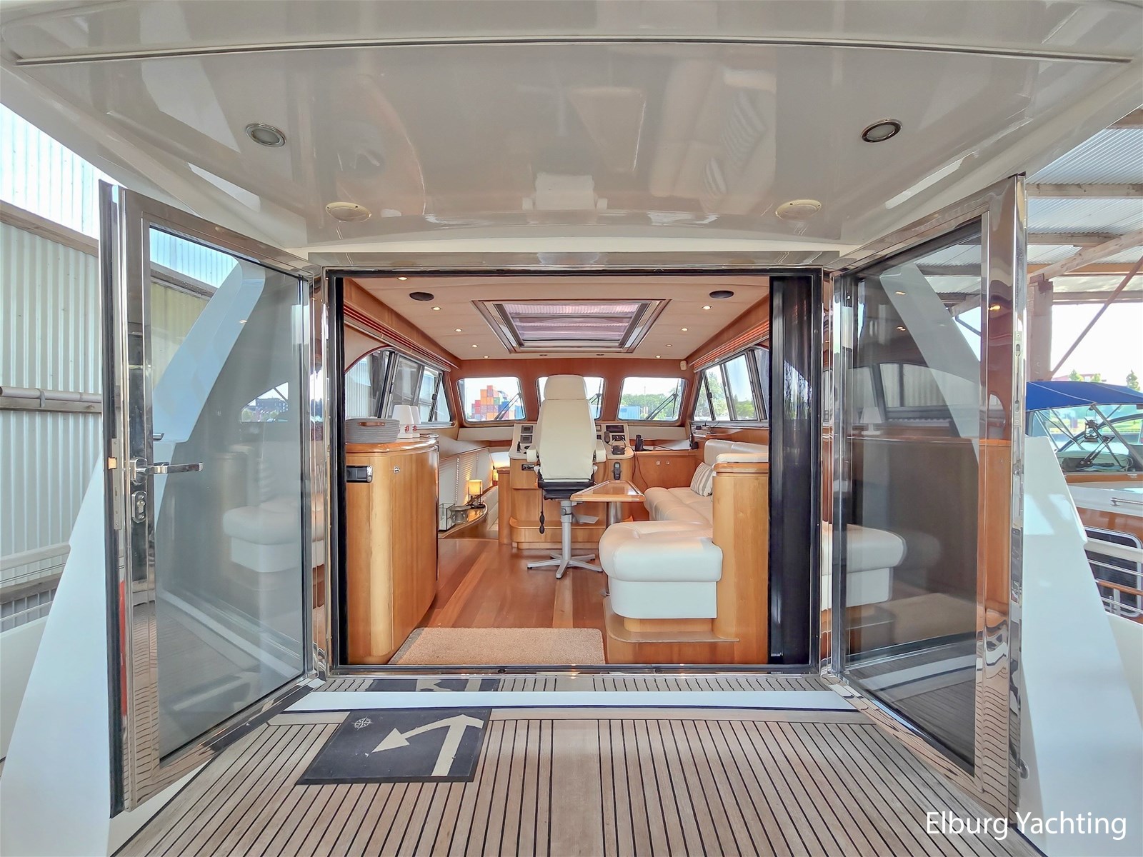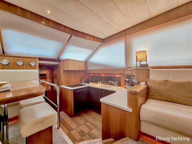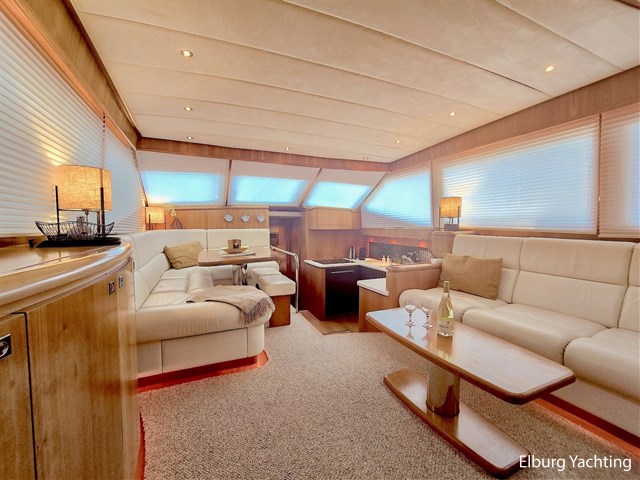 Via het stuurhuis kom je via de openslaande deuren op het riante achterdek met vaste tafel. Dit schip wordt verder geleverd met o.a: Samsung TV op lift in salon/stuurhuis/eigenaarshut, muggenhorren, groot elektrisch schuifdak in stuurhuis, r.v.s. klapbare deuren naar achterdek, r.v.s. reling, r.v.s. bolders, r.v.s. fenderkorven, r.v.s. spoelbakken, bolders op achterdek, bimini voor over achterdek, dubbele wasbakken in de eigenaarshut, op afstand bedienbare verwarming d.m.v. SMS, hydraulisch klapbare radarbeugel, kruiphoogte ca. 4.20 meter, designradiatoren in badkamers, generator start in keuken, Corian aanrechtblad, bergruimte onder keukenvloer, bergruimte voor vouwfietsen op voordek, luxe plafondbekleding, NEFF vaatwasser, AEG wasmachine (8kg), AEG droger (8kg), raam in spiegel, open badkamer in eigenaarshut, volledig betegelde douchecabines, dressoir in eigenaarshut, aluminium traanplaten in machinekamer, Firepro brandblussysteem in machinekamer, hydrauliekpomp op beide motoren, wijnkoeler, geïntegreerde bakskisten, dimbare verlichting, dekwaspomp, roerstandaanwijzer, 10 x patrijspoorten in roestvrij stalen frames, groot openslaand raam geïntegreerd in het achterschip voor extra licht en ventilatie van de eigenaarsslaapkamer, trap aan bak- en stuurboord, douche met warm/koud water en roestvrijstalen zwemtrap, teakvloer in cockpit, L-vormige bank met off-white lederen bekleding, teakhouten kuiptafel gemonteerd op twee roestvrijstalen steunen, 2 x cockpit plafondverlichting, 2 x Stereo luidspreker gemonteerd in cockpit plafond, de toegangsdeuren van de cockpit naar het stuurhuis zijn gemaakt van gepolijst roestvrij staal met dubbele beglazing en kunnen volledig harmonica-open voor optimaal contact en doorgang van de cockpit naar het stuurhuis, houtwerk interieur afgewerkt in zijdeglans gelakt kersenhout, licht zandgrijze vloerbedekking in alle delen van het interieur, behalve in de stuurhut (gelakte houten vloer), LED plafondverlichting in het hele interieur, grote centrale stuurstand met 360 graden overzicht en kapiteinsstoel, L-vormige bank afgewerkt met off-white lederen bekleding + salontafel, comfortabele zijtrap naar de salon, grote kast aan bakboordzijde met een voorlader AEG koelkast, AKAI flatscreen TV, wijnkast (koelt niet) en meerdere kasten, jaloezieën voor de ramen, uitzonderlijk veel opbergruimte/kledingkast en lades.