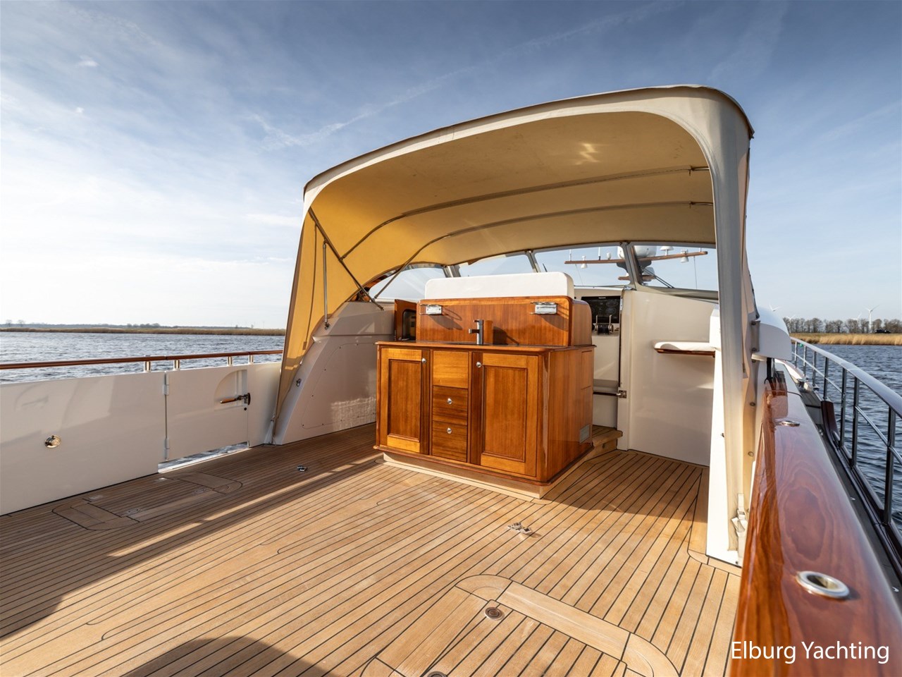 De Mulder Classic - 77 Eleonore straalt door haar stijlvolle houten elementen, 2 trappen naar het achterdek, ruime rondom lopende gangboorden, zonnedek op het voordek, ruime zitbank in de reling.