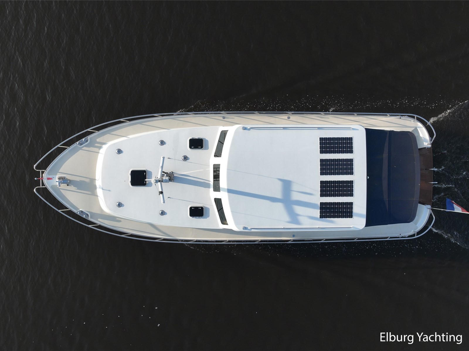 Via de kuip loopt u door middel van een openslaand deurtje naar het zwemplateau. Via de twee luie, halfronde trappen loopt u de gangboorden op die voorzien zijn van een RVS reling, dubbele RVS bolders en antislip verf. Op het voordek staat een elektrisch klapbare mast, en de elektrische ankerlier. Het dak is voorzien van een viertal zonnepanelen via Victron MPPT 100/20. Het jacht heeft een minimale doorvaarthoogte van ca. 2.40 m.