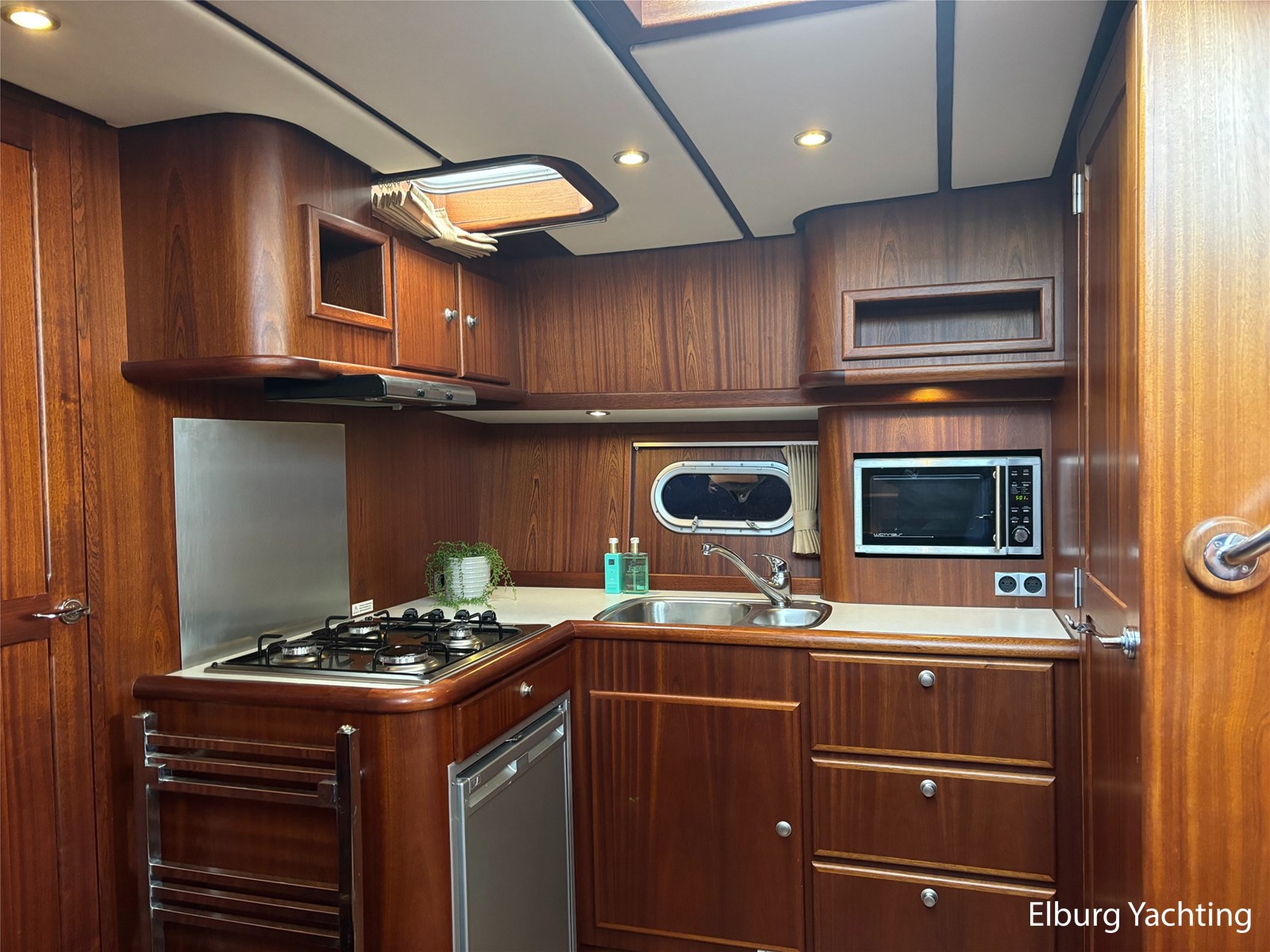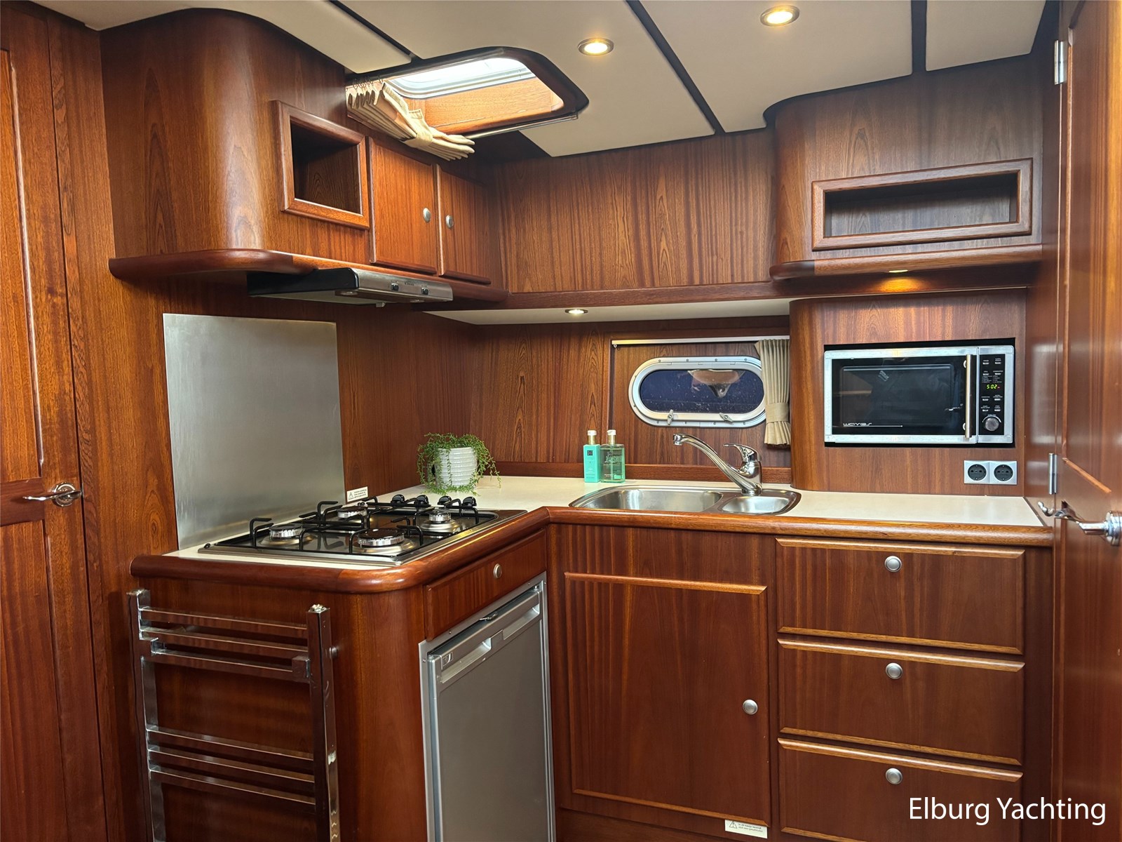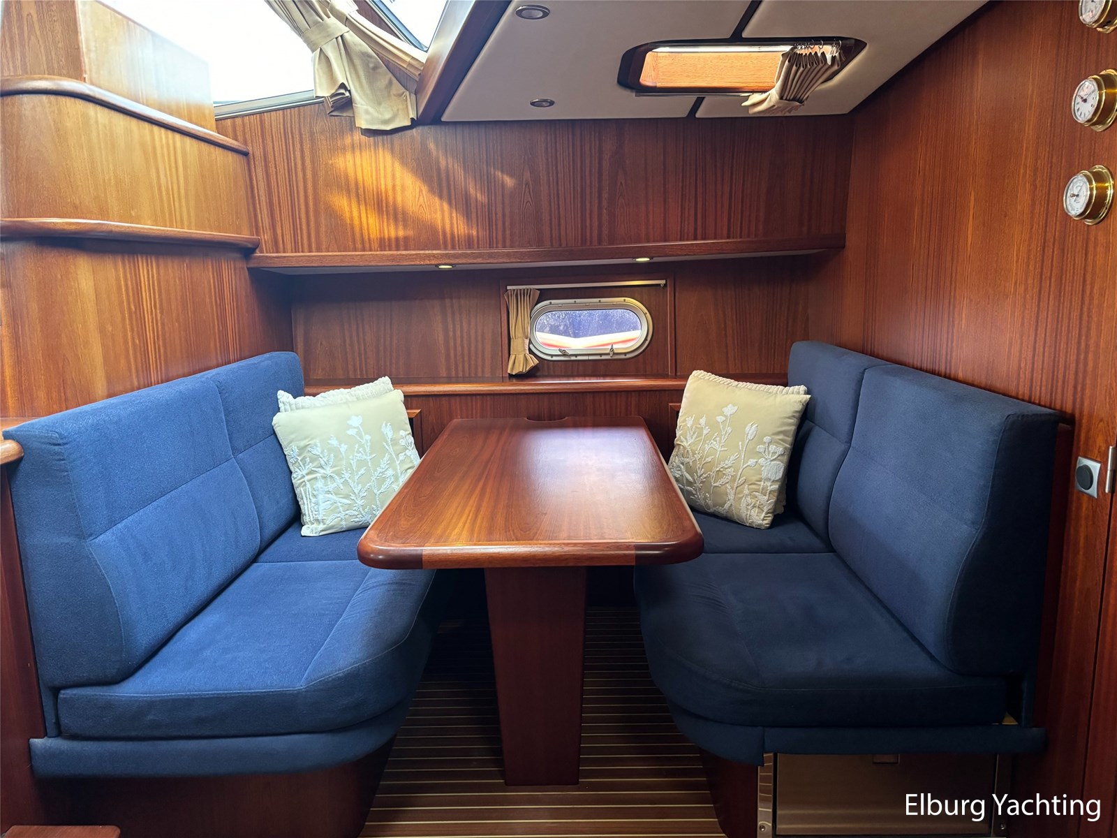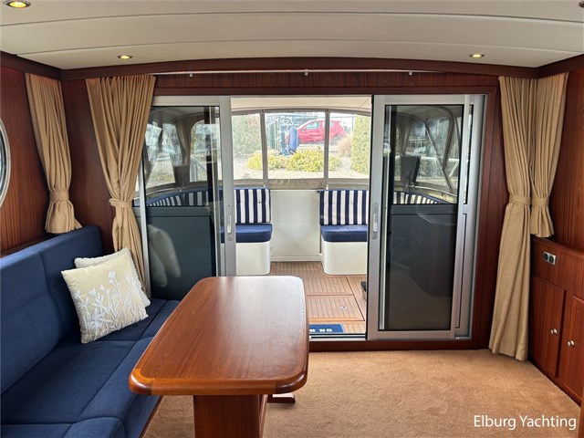 Bij de stuurstand heeft u goed overzicht door de raampartij, Het jacht is voorzien van een Sidepower afstandsbediening waardoor het jacht goed te manoeuvreren is. Vanaf de salon loopt u door middel van een trap naar beneden waar u aan de bakboord kant een ruime dinette vindt, en daar tegenover de kombuis. Als u rechtdoor loopt vindt u de eigenaars hut die voorzien is van een tweepersoons frans bed. Aangrenzend vindt u een douche in eigen cabine en een elektrisch toilet in eigen cabine. Vanuit de kombuis vindt u de gasten hut die is voorzien van een tweepersoons bed.