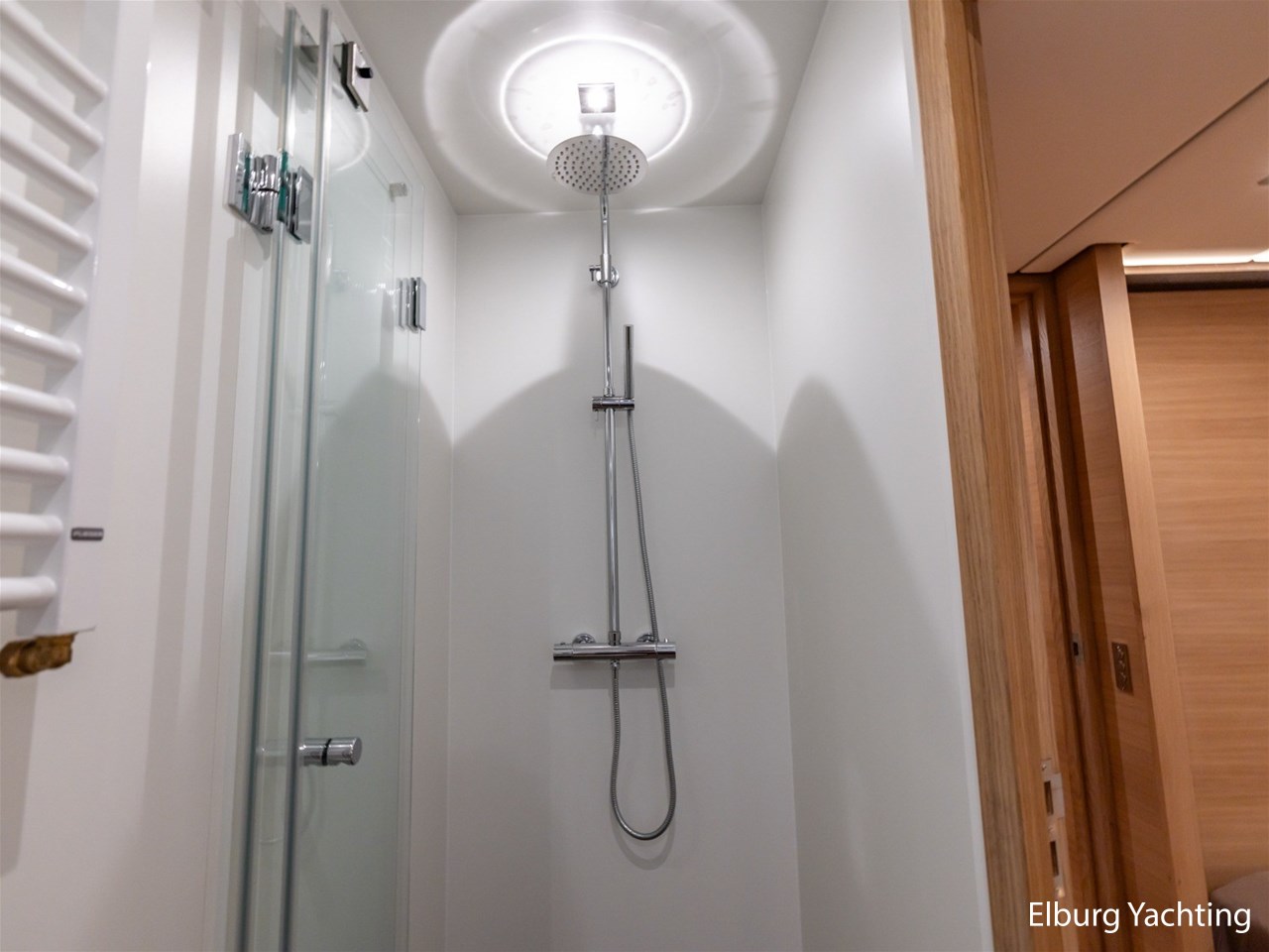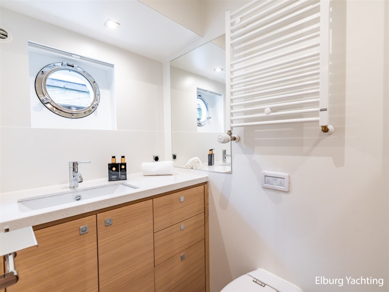 Aan boord valt direct het oog voor ruimte en design op. Het jacht is zeer ruimtelijk vormgegeven met veel hoogte (stahoogte salon ruim 2 meter). Het moderne eiken interieur in combinatie met de p.v.c. vloer (voorzien van vloerverwarming) is vakkundig tot stand gekomen en zorgt voor een aangename omgeving. Naast de centrale verwarming is het jacht voorzien van airconditioning in alle hutten, de salon en het stuurhuis. Het jacht beschikt over drie volwaardige hutten met in de eigenaarshut een ruim dubbel vrijstaand bed en on suite badkamer (lengte ca. 2 meter), aan bakboord twee enkele bedden (lengte ca. 2 meter) en aan stuurboord een ruim dubbel bed (lengte ca. 2 meter) + een enkel bed.