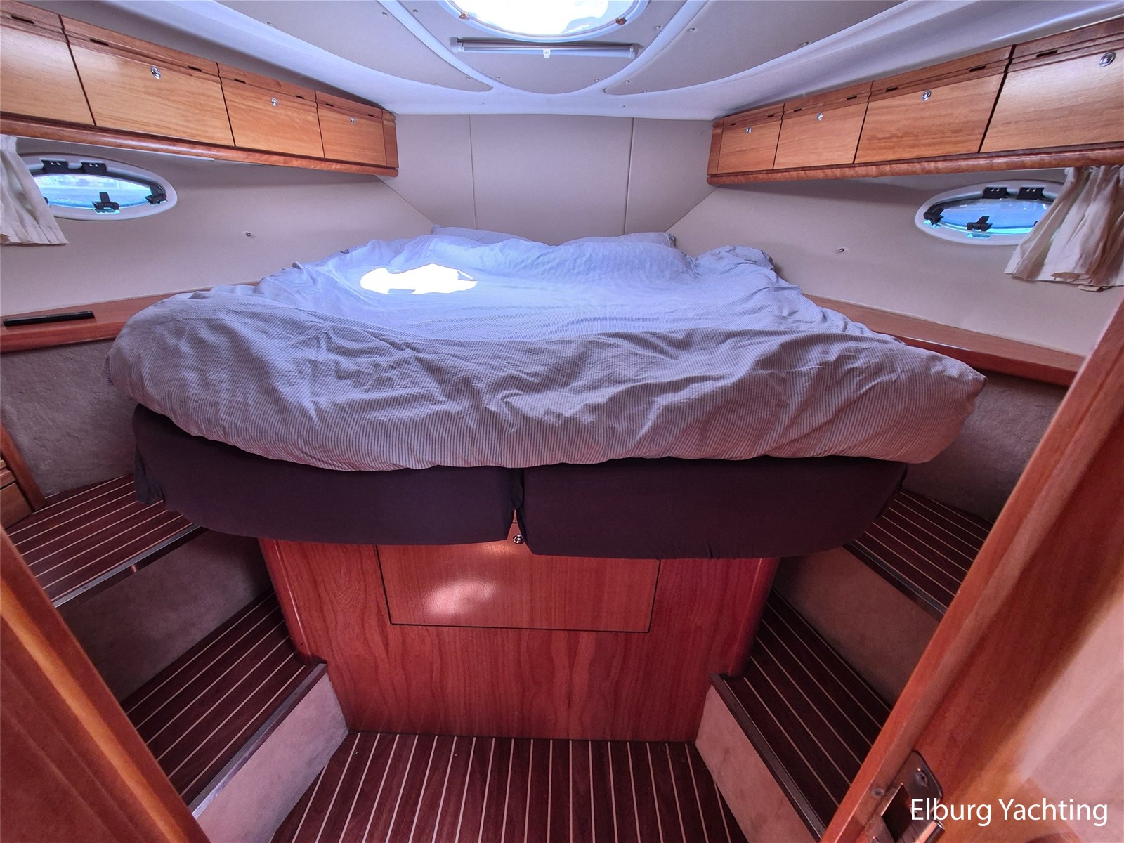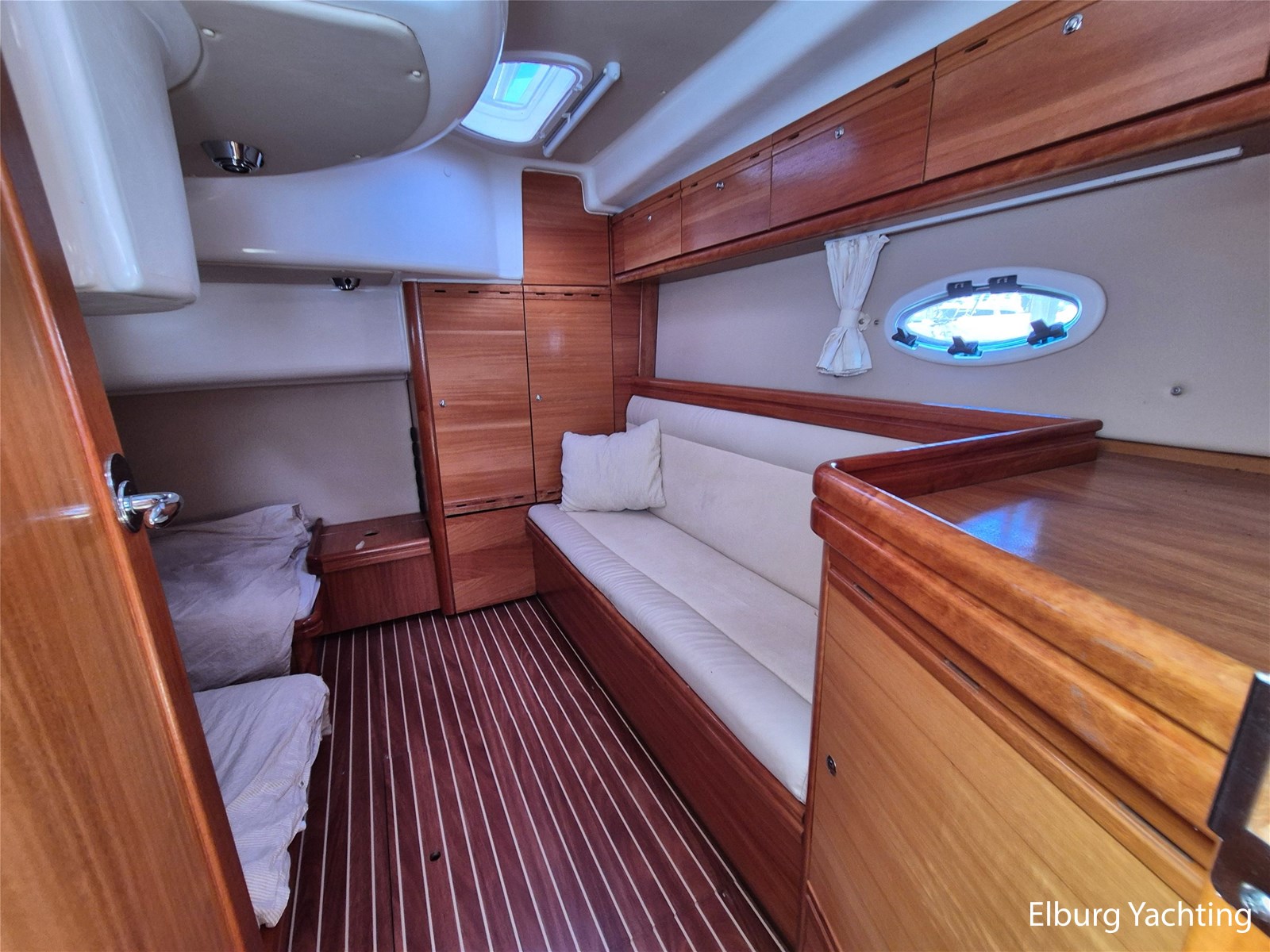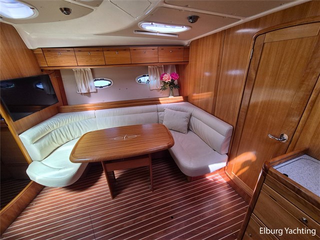 De indeling is praktisch met een fijne dinette met vaste tafel en handige kombuis met veel bergruimte, inductiekookplaat, dubbele spoelbak, magnetron/oven en ruime koelkast met vriesvak. Verder is ze voorzien van 2 ruime hutten (2 persoons vrijstaand Frans bed in de voorkajuit + 2 enkele bedden in de ruime achterkajuit) en een royale natte cel met elektrisch toilet, wastafel en grote afsluitbare douchekabine.