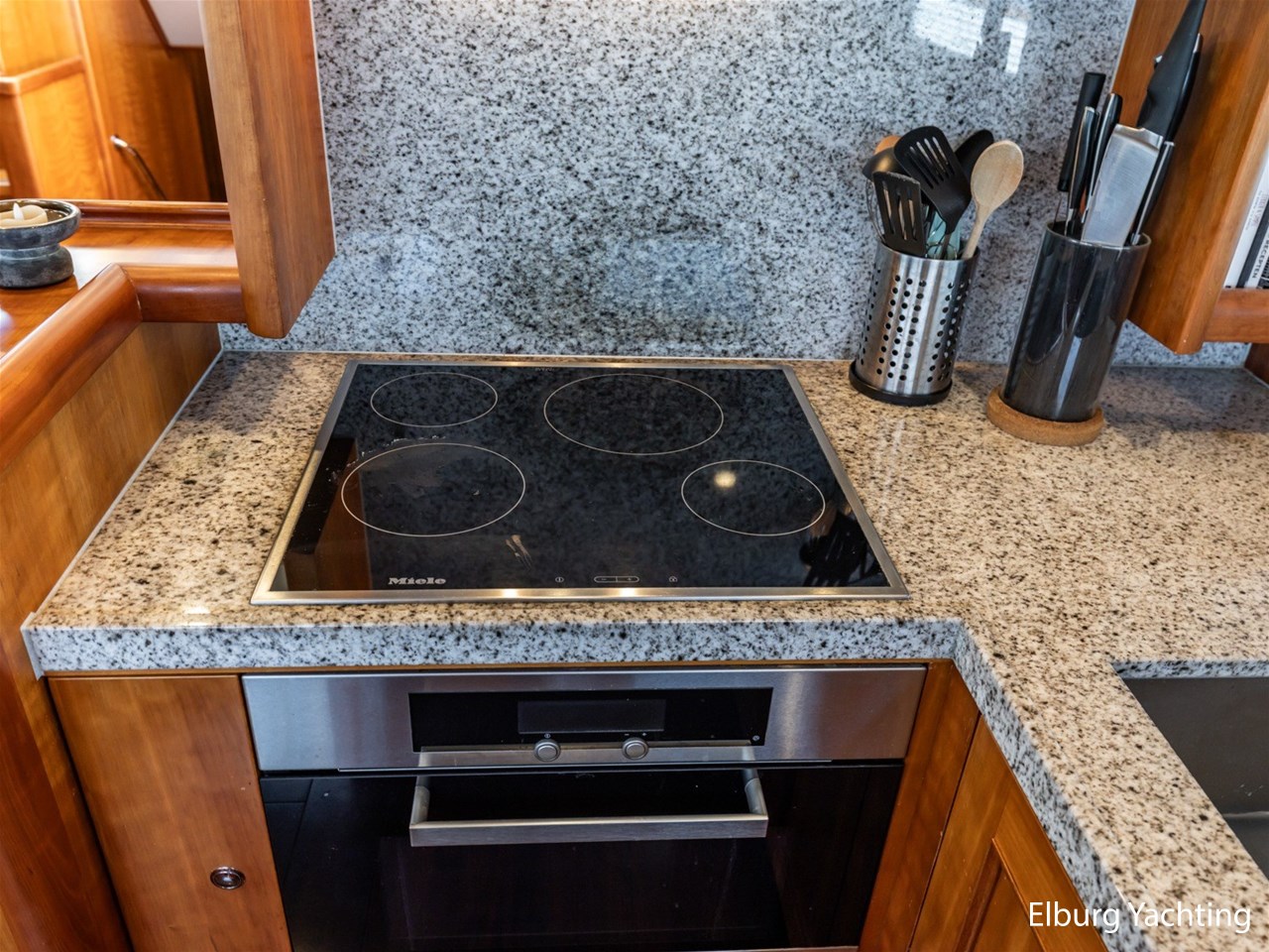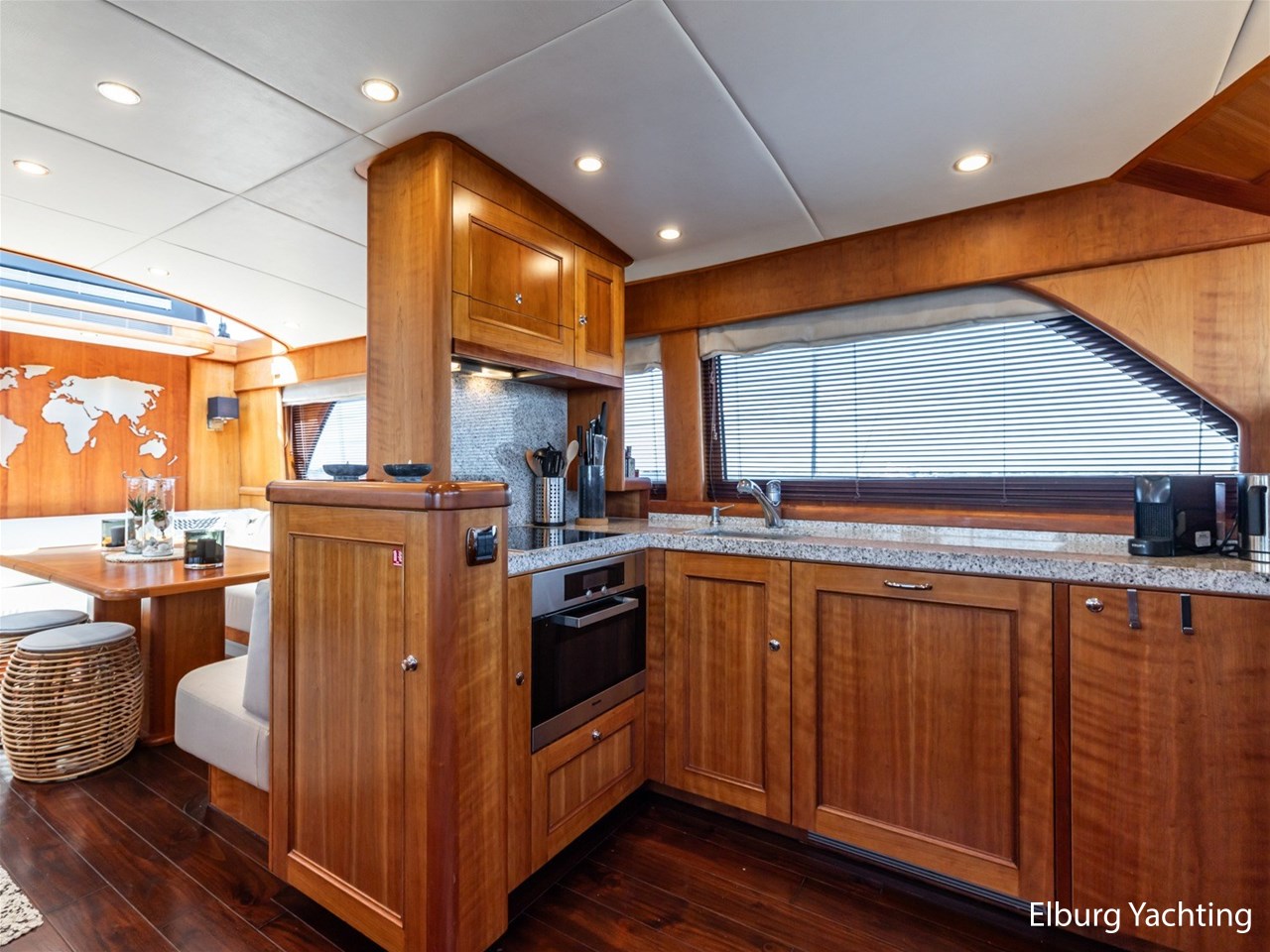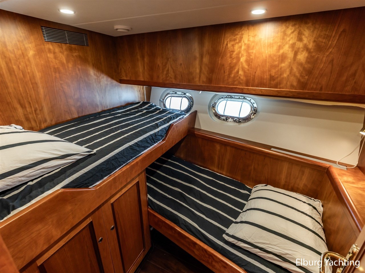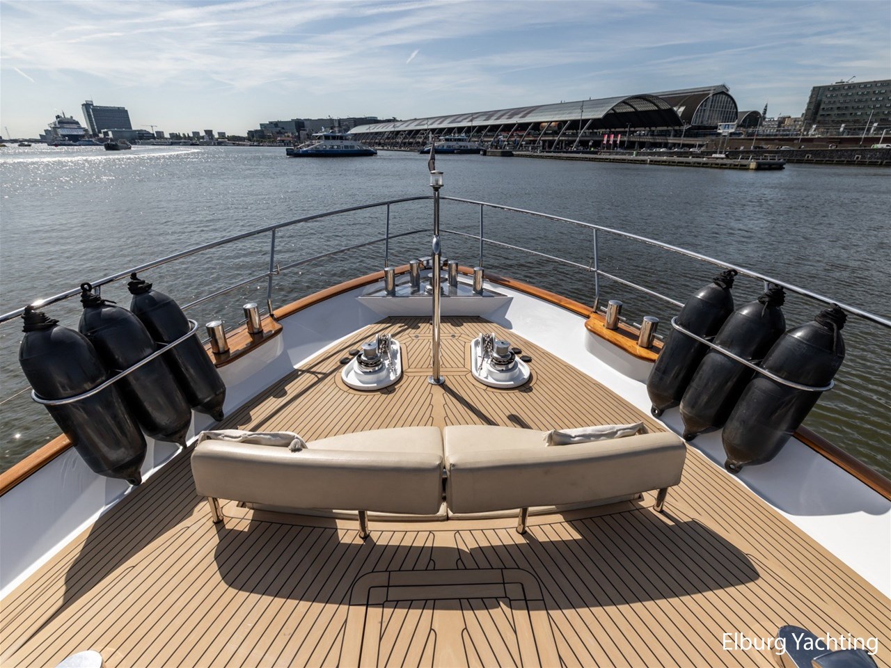 Het jacht beschikt over 3 luxe hutten en een crew cabin. Het interieur in kersenhout en wengé vloer, in combinatie met moderne technologie: Raymarine Axiom-systeem, Naiad stabilisatie, hydraulische transomdeur, passerelle, airconditioning en generatorsets. De brandstoftanks van ca. 7.200 L en vers watercapaciteit van ca. 2.500L garanderen lange zeereizen met comfort.
