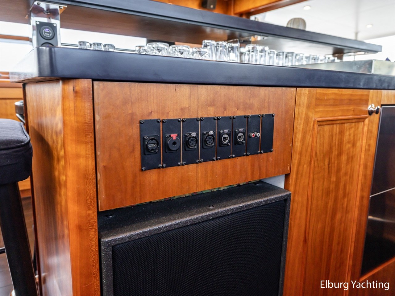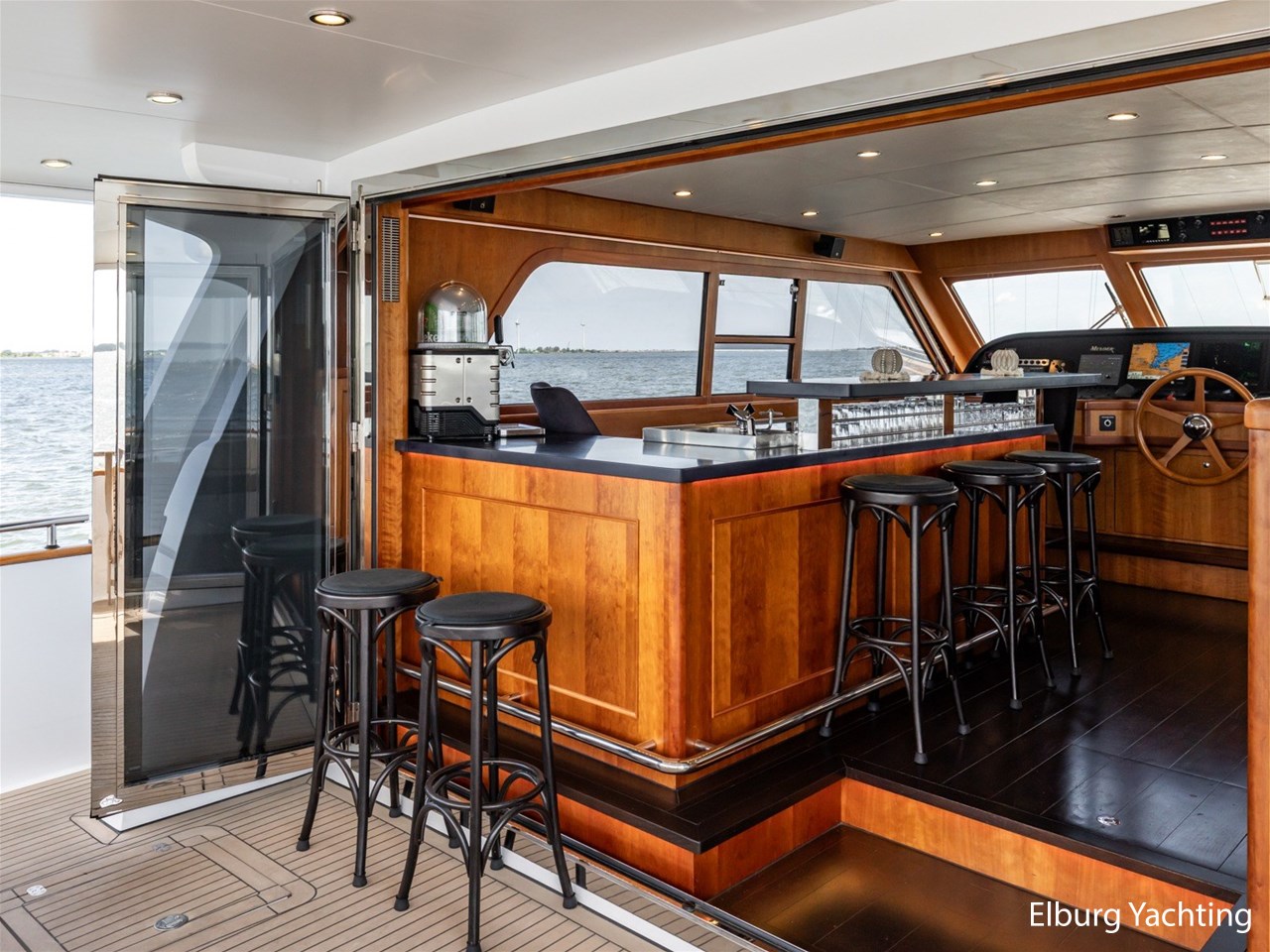 Exclusief in stijl gebouwde bar voor de verbinding tussen achterdek en stuurhut. diverse koelkasten, muziekinstallatie aan boord. Zeer rijk uitgeruste stuurstand, ruime salon met grote U-dinette, 2 x poef, TV op lift., veel daglicht, veel opbergruimte, ruime keuken met zicht naar buiten, granieten keukenblad, Miele keuken apparatuur, vaatwasser, 2 x Liebherr,koelkast, 1 x kantoor in aparte cabin. De Mulder 73 Wheelhouse Alu Fast Going heeft een ruime mastercabin met 2 pers. kingsize bed vrijstaand met veel opbergruimte en grote badkamer en-suite met toilet en urinoir. Er is een guestcabin met een 2 pers. bed vrijstaand en badkamer en-suite, 1 guest cabin met 2 x 1 pers bed als een half overlappend stapelbed, TV in salon + stuurhuis en achterhut, 2-persoons crew cabine met eigen ingang