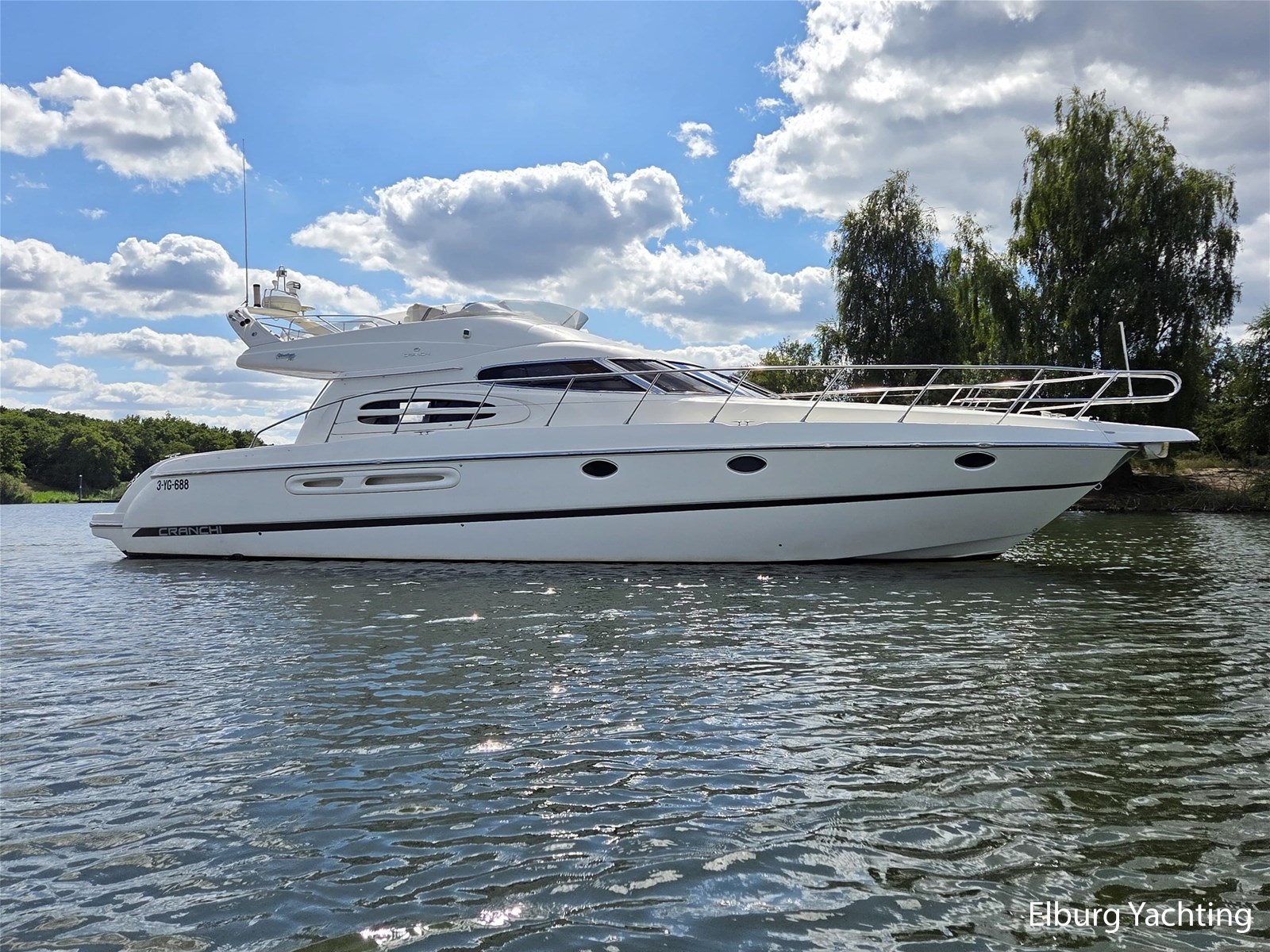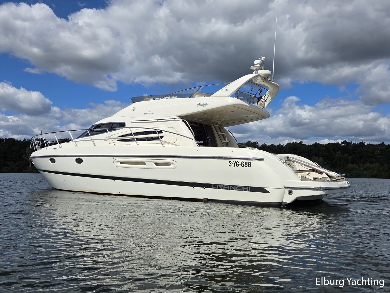 De Cranchi Atlantique 48 is een mooi gelijnd snelvarend polyester motorjacht. Het jacht beschikt over maar liefst 3 vaste hutten + crew cabin waarmee er plaats aan boord is voor minimaal 6 opvarenden. Doormiddel van de r.v.s. schuifpui is het achterdek en de salon met elkaar te verbinden. De salon is ruim opgezet met een aangesloten open keuken. Uniek voor dit schip is de Maritieme Booster CV dieselkachel voor een comfortabele verwarming aan boord in ieder vertrek inclusief motorruimte waardoor dit schip ook in de winter te gebruiken is en/of permanente bewoning. Dit jacht is voorzien van: Geïntegreerde kuipbanken inclusief bijbehorende kussens, ronde dinette in salon, entree naar flybridge via een trap in open kuip, koeling/verwarming per vertrek afzonderlijk regelbaar via de airconditioning, overzichtelijk elektrisch schakelpaneel, kleine praktische wasmachine in open kuip, 2 x zijraam in salon en bij stuurstand, 2-persoons stuurbank bij beide stuurstanden, afsluitbare kuip met spiegeldeur aan SB zijde, Benzensoni hydraulische gangway voor opstap op de steiger of het kranen van een bijboot op het zwemplateau, 2 x toegang naar machinekamer, r.v.s. fenderhouders op het voordek, de open kuip en het zwemplateau zijn volledige belegt met een kunststof teakdek voor minder onderhoudszorgen, 2 x zonnepanelen op de flybridge.