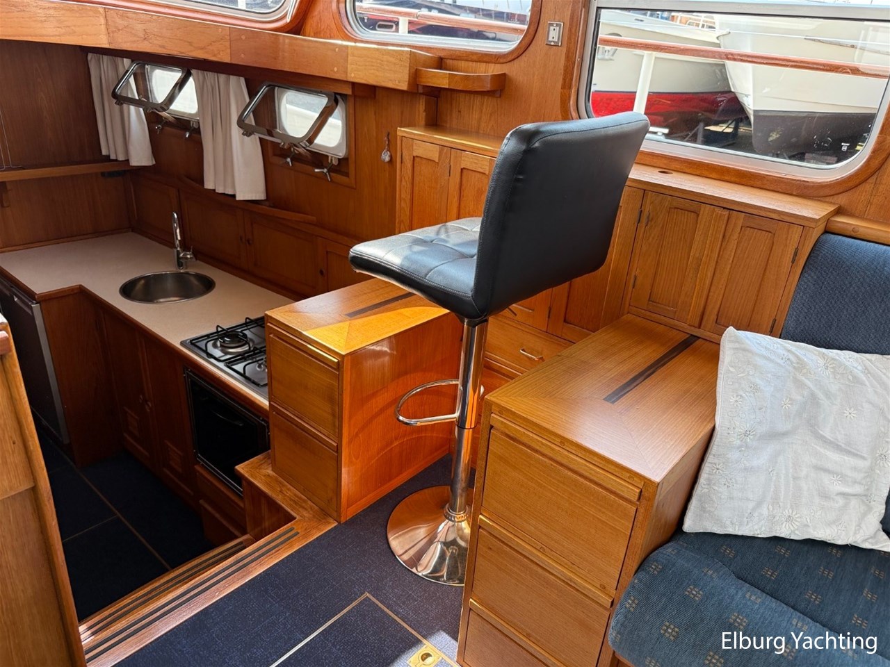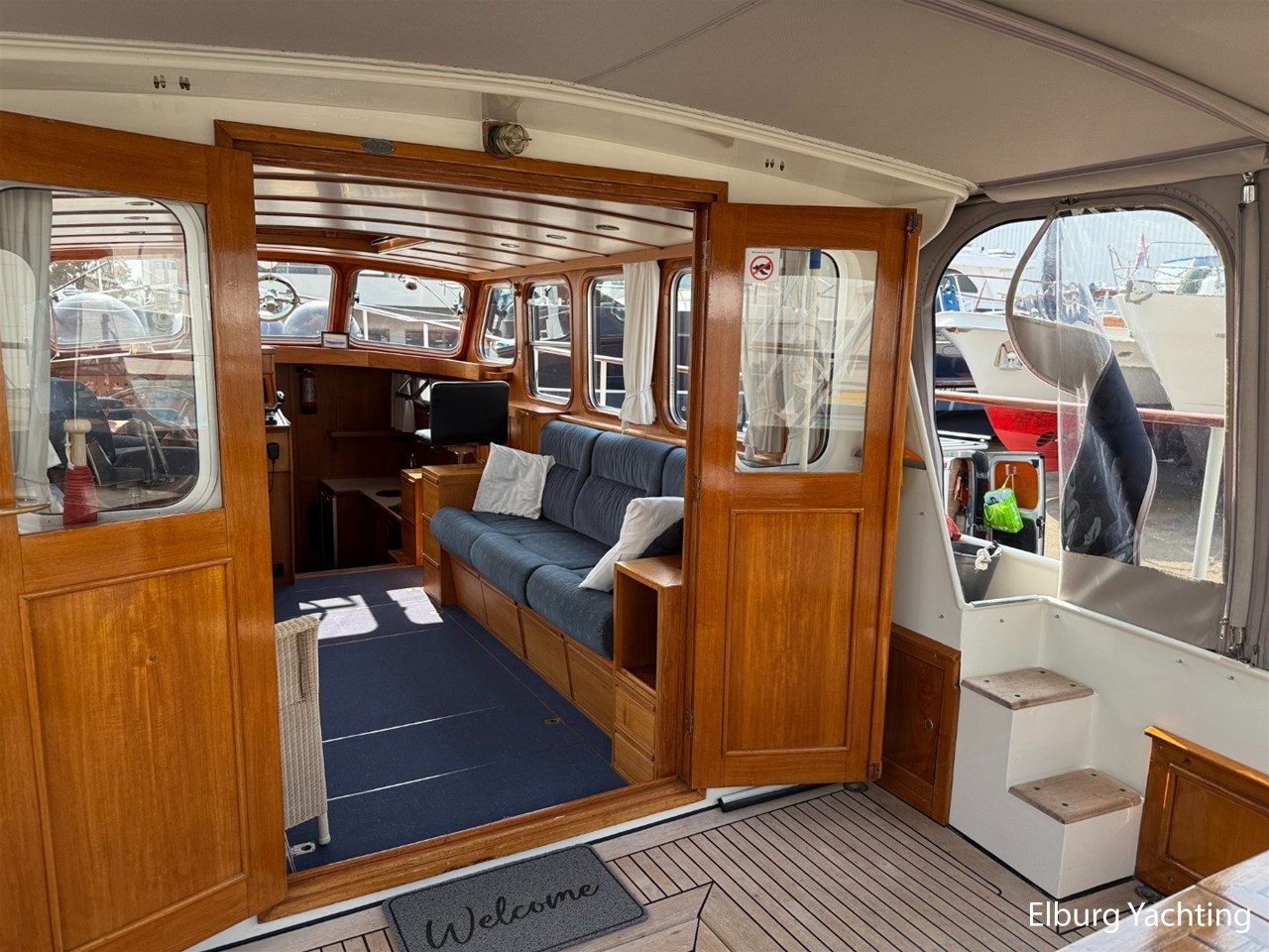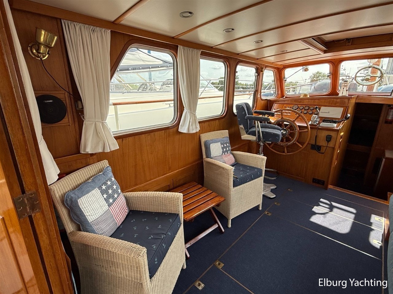 - Scheeps Teakhouten interieur met blauwe bekleding en recente blauwe vloerbedekking