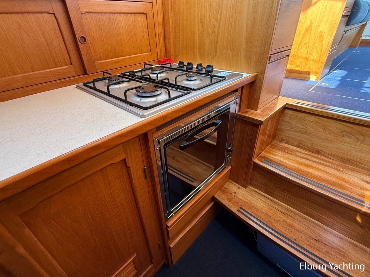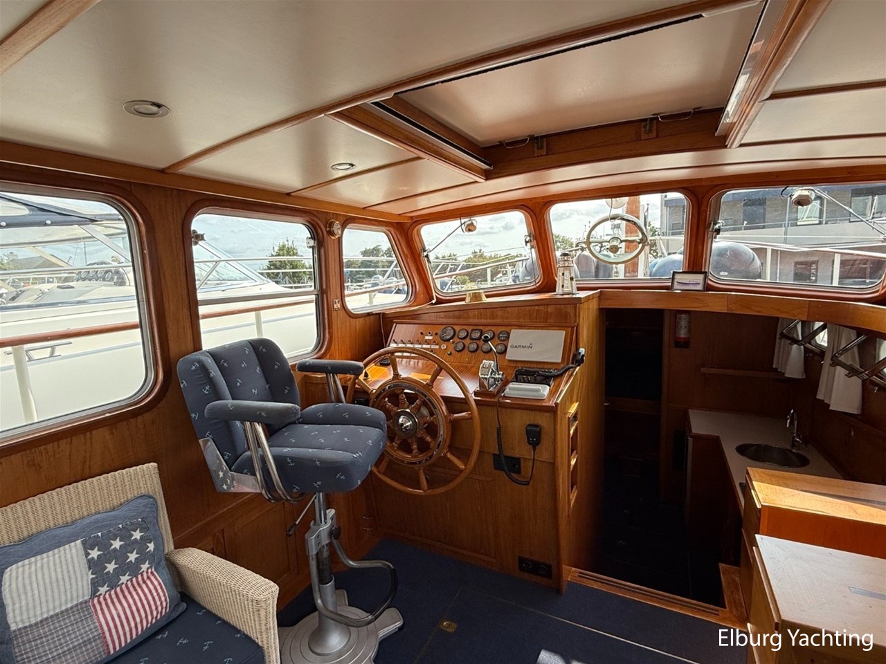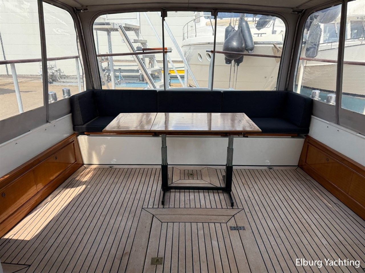 - Scheeps Teakhouten interieur met blauwe bekleding en recente blauwe vloerbedekking