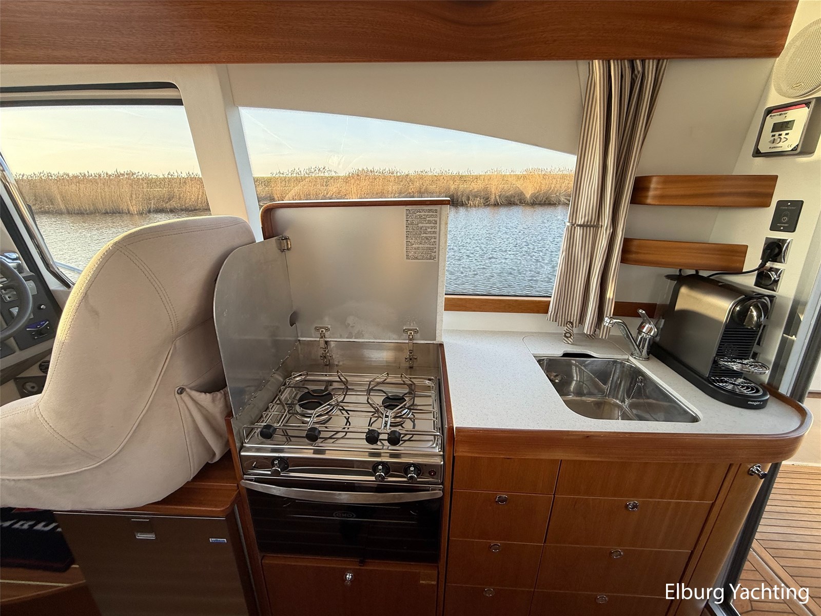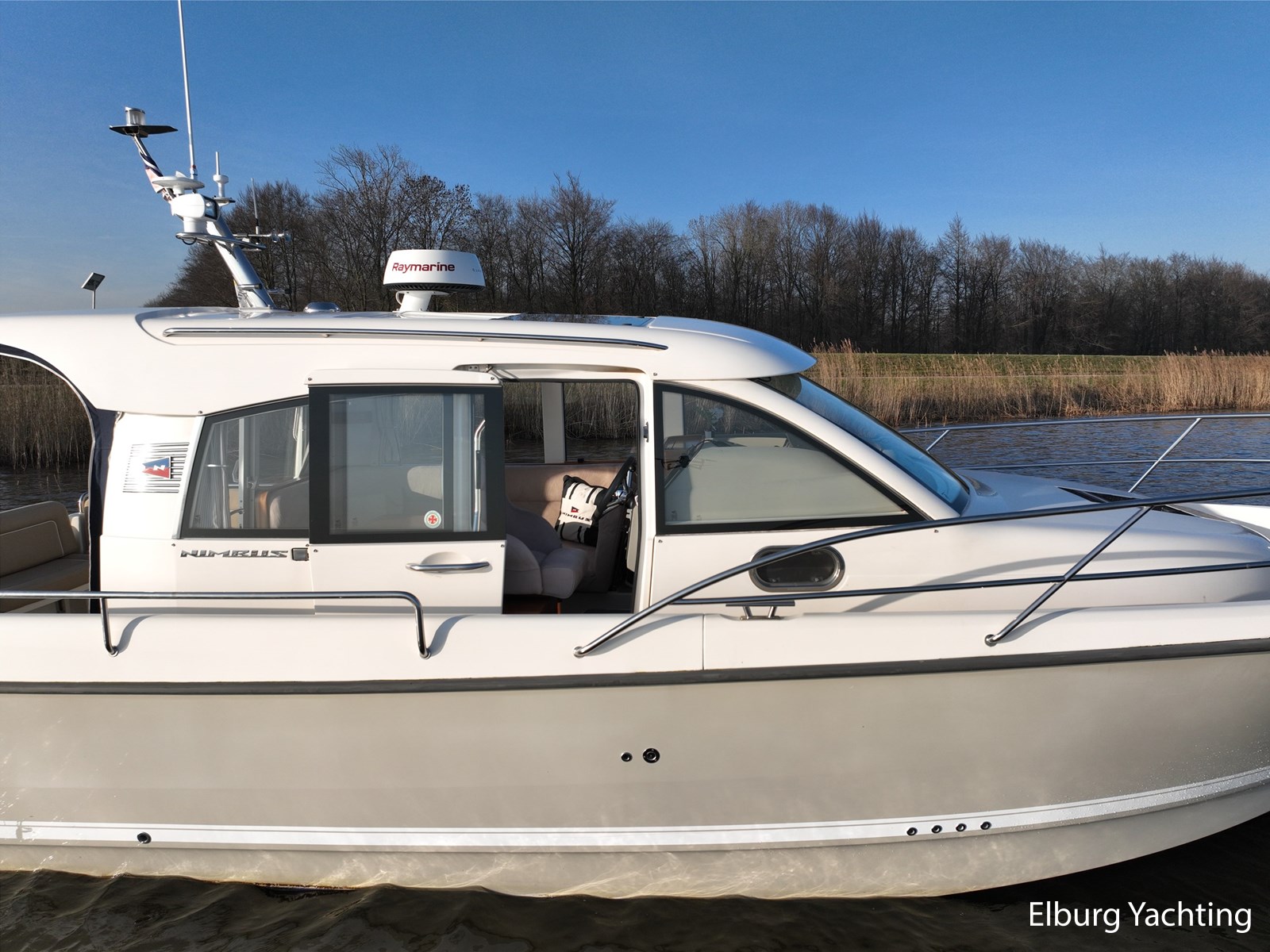 De Nimbus 335 beschikt over een ruime en verzorgde kuip, waarin comfort en functionaliteit mooi samenkomen. De zitbank met kussens nodigt uit tot ontspannen momenten aan boord, terwijl de diepe opbergbak praktische bergruimte biedt. Dankzij de volledig afsluitbare kuiptent is deze buitenruimte ook bij minder weer een prettige plek om te verblijven. Via een gemakkelijke doorgang bereikt u het zwemplatform. De salon is bereikbaar via een schuifdeur en biedt aan stuurboordzijde de kombuis en de stuurstand. De stuurstand is voorzien van een handige deur naar het gangboord. Aan bakboord bevindt zich een comfortabele dinette met in hoogte verstelbare tafel. Voorin, tegenover de stuurstand, is een klapbare meevaarbank aanwezig met een uitschuifbare tv. De combinatie van mahoniehouten betimmering en lichte bekleding geeft het interieur een warme, stijlvolle Scandinavische uitstraling. In 2025 zijn onder andere het toilet, de radar, omvormer, marifoon, Fusion-radio en de matrassen vernieuwd. De warmtewisselaar is gereviseerd. In 2025 is het schip voorzien van nieuwe antifouling en is er een uitgebreide poets- en polijstbeurt uitgevoerd. De motor kreeg in 2025 een onderhoudsbeurt en de plotter werd vervangen in 2023. Grote luiken in de kuipvloer zorgen voor uitstekende toegang tot de motorruimte, bergruimte en technische installaties. Het gemiddeld brandstofverbruik (5-6 knopen varen) bedroeg circa 3 liter per uur. Met originele Nimbus-details zoals het servies, een chique dubbele RVS zeerailing en een doordachte indeling is dit jacht een compleet geheel. Volledige documentatie beschikbaar.