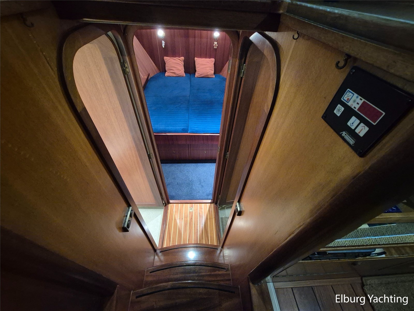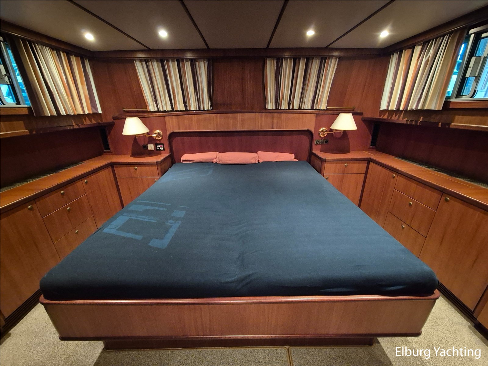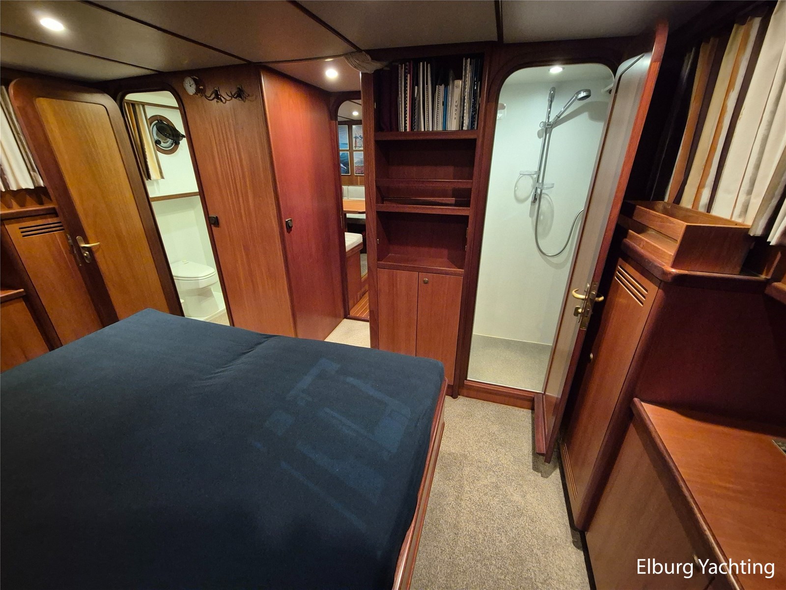 Verder voorzien van o.a. een complete tent over het achterdek, met uitritsbare delen, salon voorzien van dakluik en muggenhorren, voorkajuit in 2015 omgebouwd naar frans bed met veel opbergruimte, ventilatieroosters onder de bedden, blindering (geheel gewassen en nagelopen zomer 2025), een hydraulisch klapbare mast, Intellion TV (2015), Wasdroger Candy (2015), blindering voor alle vensters, dekdouche, twee wateraansluitingen aan dek (voor en achter), davits met bijpassende bijboot, zij-instap in de zeereling en zijdeuren aan weerszijden van de opbouw. Het enorme achterdek kan dienen als buitenruimte of als serre, al naar gelang de wensen van de eigenaar is deze ruimte geheel of gedeeltelijk te overkappen. Diverse bakskisten met goed georganiseerde bergruimte completeren de functionaliteit. Onder een grote hoes loopplanken, schuifhouten voor de franse sluizen, en extra meubilair. Verder: dubbele bolders voor en achter, middenbolder, grote eettafel met stoelen op achterdek, salon voorzien van luxaflex rondom, dakluik, was-droogcombinatie, voorhut met zeer veel kastruimte (essentieel voor verre reizen of wonen aan boord), zeer overzichtelijke motorkamer waarbij alle componenten goed bereikbaar zijn, mangaten in de tanks en ontdreuningsplaatjes voor reductie van geluid, veiligheidsrailing rondom de motor, camera in de motorkamer, vaatwasser, goed uitgeruste en ruime kombuis met dinette ernaast, en eigenaarshut met veel daglicht en separate toilet en douche.