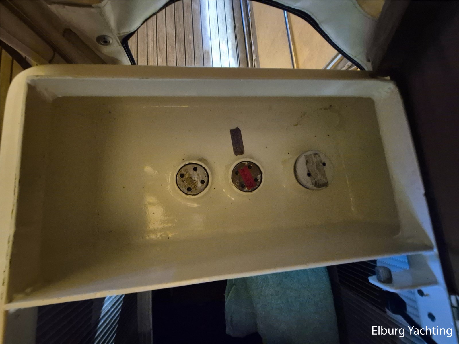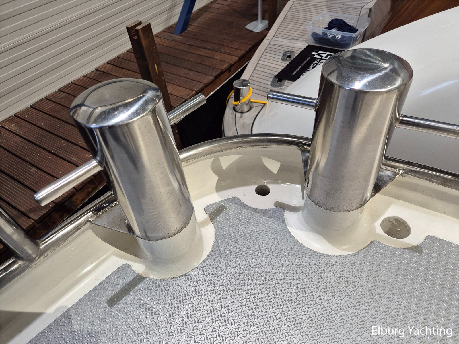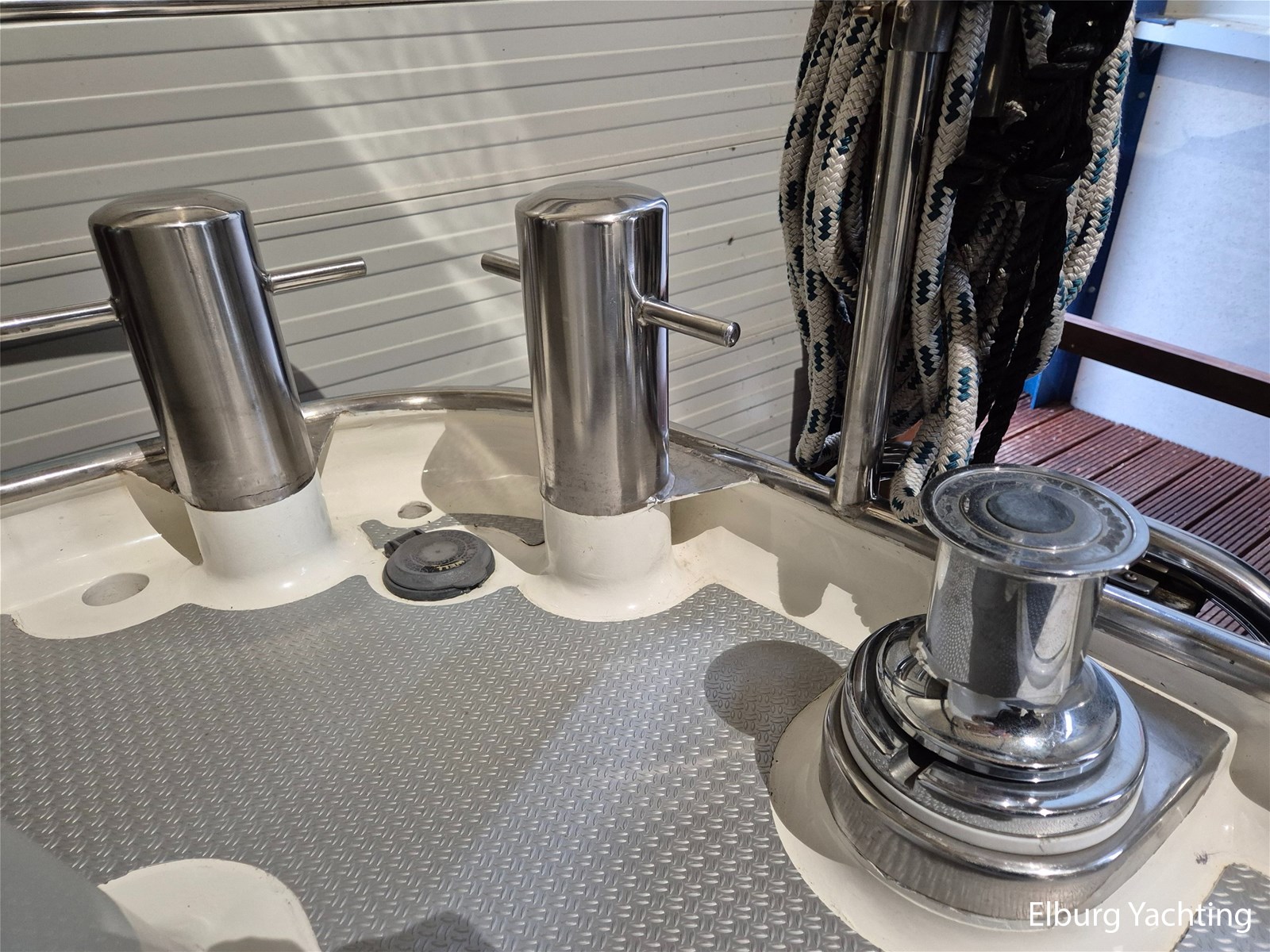 - Alu Antislip materiaal (2012) in gang boorden, teak op achterdek en flexiteak op zwemplateau