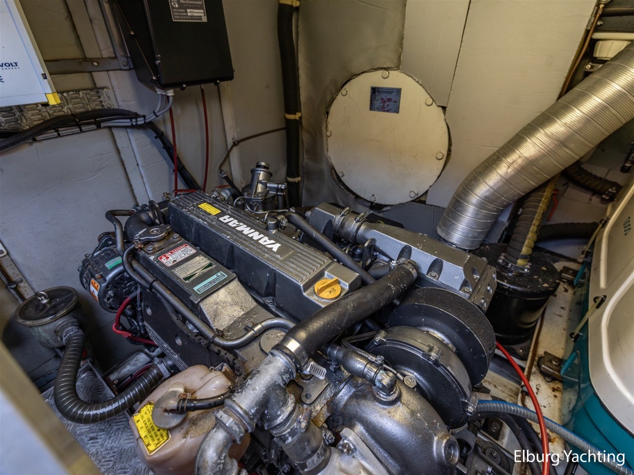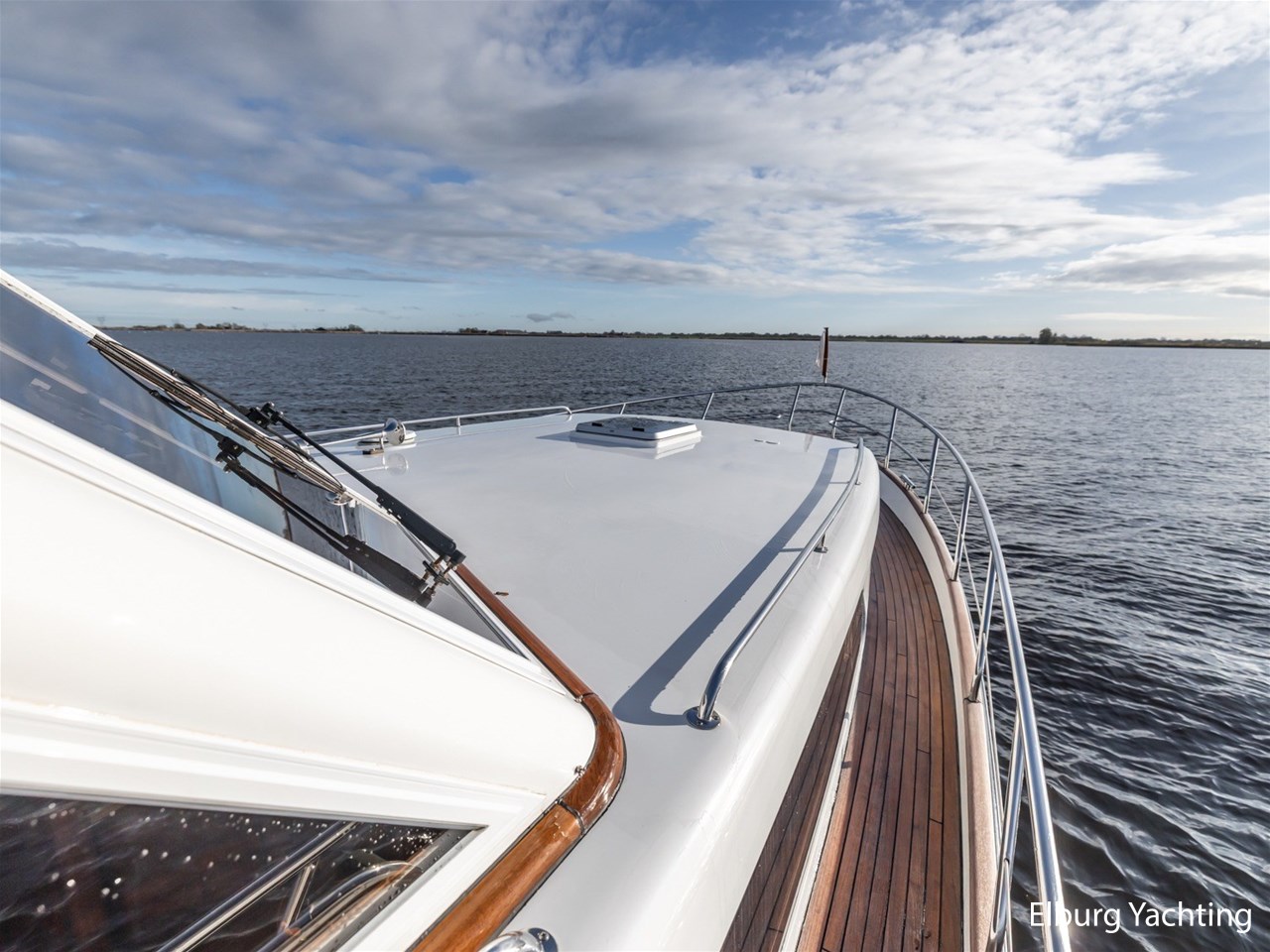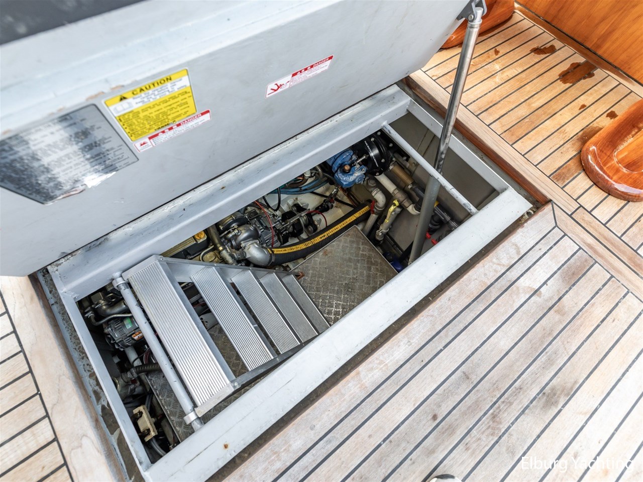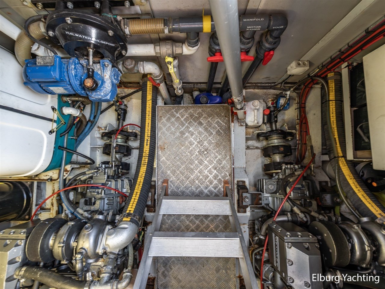 Het onderwaterschip is in diezelfde periode gestraald en behandeld met nieuwe antifouling. In 2023 is groot motoronderhoud uitgevoerd, inclusief de plaatsing van twee nieuwe turbo’s. In 2024 is aanvullende service aan de motoren uitgevoerd. Het jacht is voorzien van schroefassen en vierblads schroeven. De generator is in mei 2025 geserviced. De kruissnelheid bedraagt ca. 8 knopen bij 2500 rpm, met een maximale snelheid van ca. 11 knopen bij 3300 rpm. De economische vaarsnelheid ligt rond de ca. 7 knopen bij 2200 rpm. Qua uitrusting is het jacht voorzien van een uitgebreid en recent vernieuwd Raymarine-navigatiesysteem met onder andere twee Axiom 12” displays, radar, AIS, GPS, autopilot met afstandsbediening, VHF, windmeter en een camera op de radarboog. In 2023-2024 is er een nieuwe hekschroef met afstandsbediening aangebracht, naast de bestaande boegschroef. De kussens op het voordek zijn aanwezig en in 2023-2024 vernieuwd. Verder is het jacht uitgerust met RVS fenderhouders en een zoeklicht. Volledige documentatie van de werkzaamheden is op aanvraag beschikbaar.