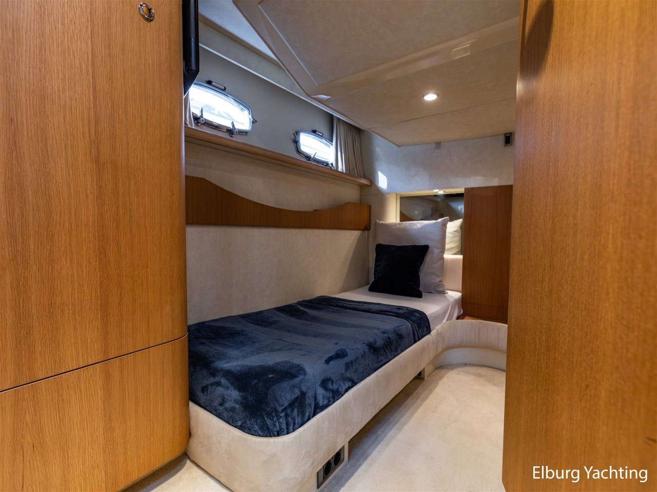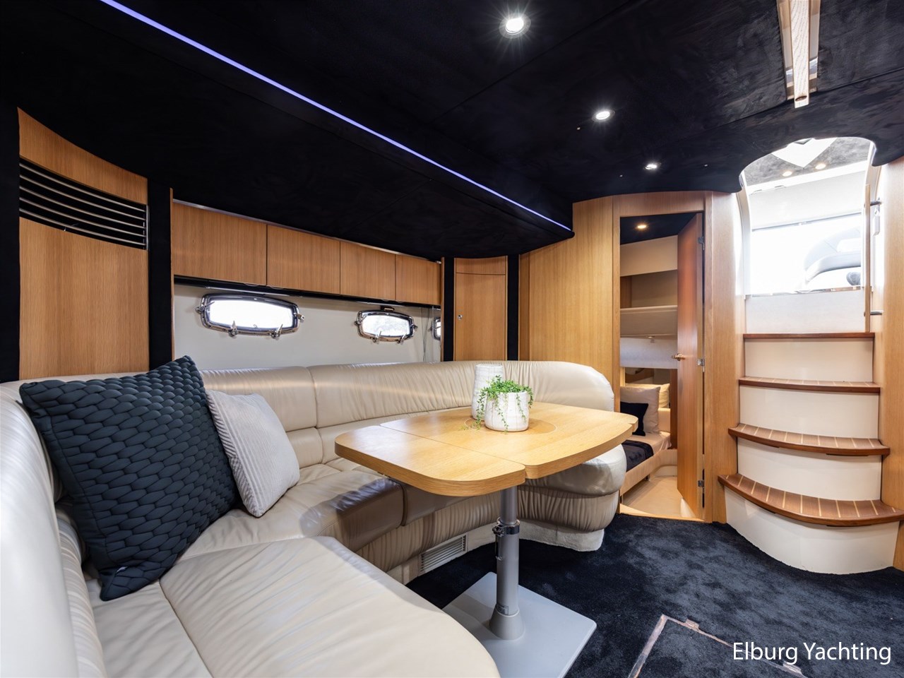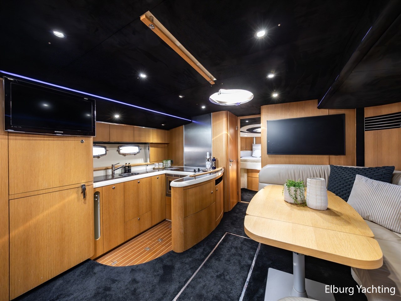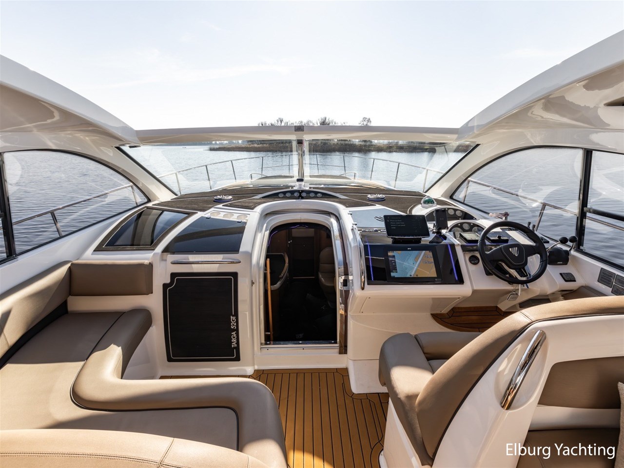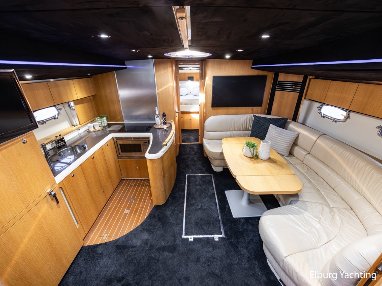De Fairline Targa 52 GT beschikt over een recent gemoderniseerd interieur. De salon en hutten zijn uitgevoerd met een luxe Alcantara plafondafwerking, gecombineerd met hoogpolige vloerbedekking en nieuwe Luxaflex raambekleding. Zowel de salon als de eigenaarshut beschikken over een televisie (beschikbaar op WiFi, exclusief dongle). De sfeerverlichting in de salon is volledig naar wens instelbaar in kleur en intensiteit middels het MiBoxer smart LED-verlichtingssysteem.