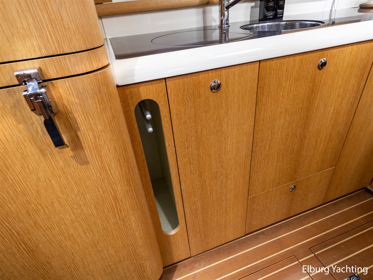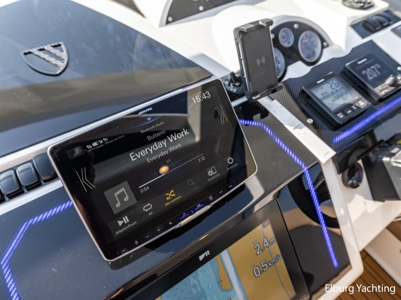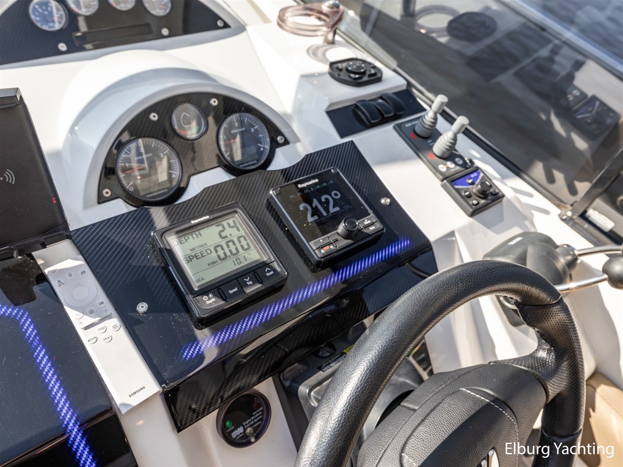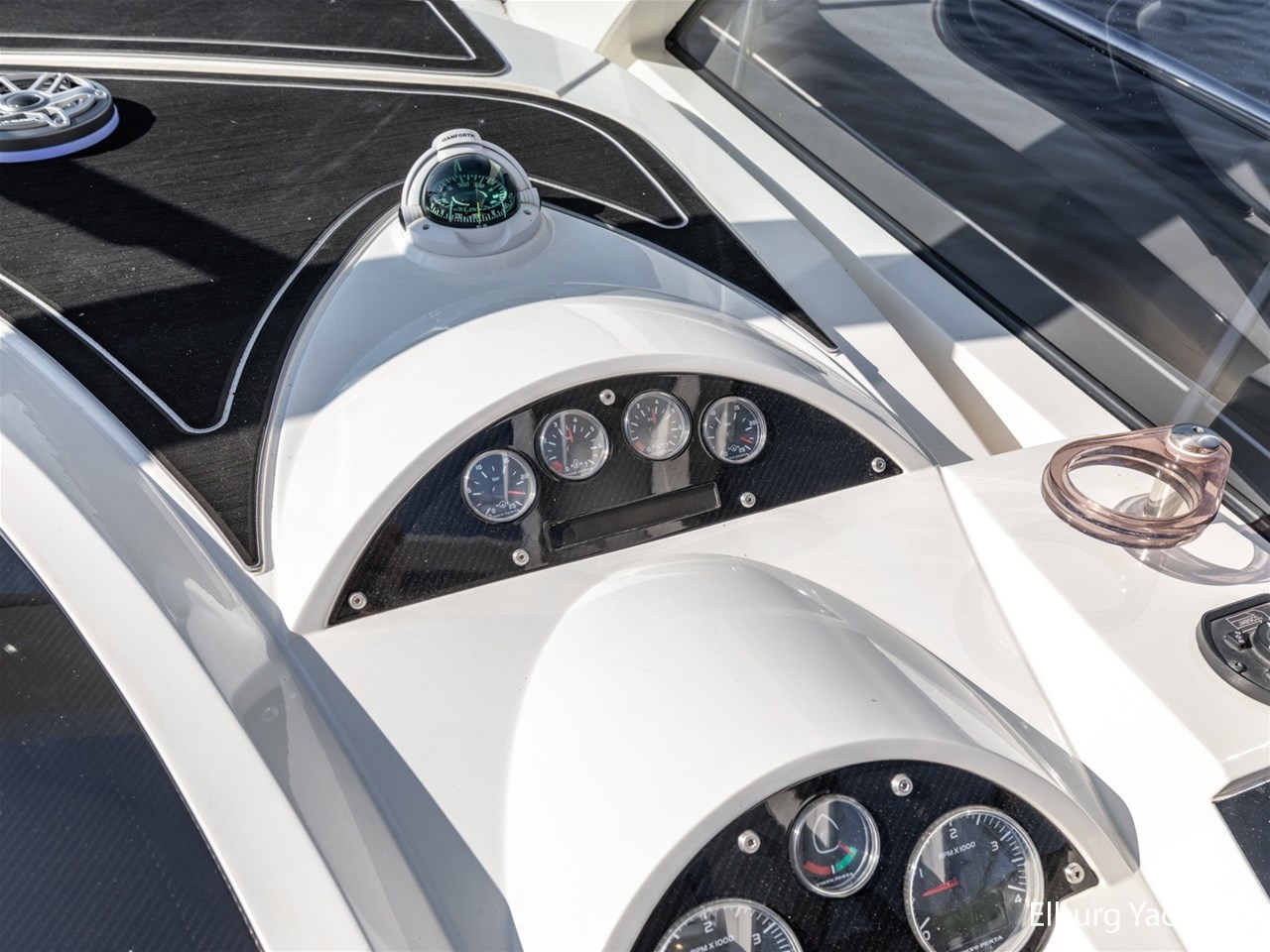 De kombuis is compleet uitgerust met onder andere een vaatwasser, Isotherm koelkast, koelkast met ijsblokjesmachine en een magnetron. Het dashboard is custom made uitgevoerd in carbon en see-through carbon. Ook in de kuip is sfeerverlichting aanwezig welke naar wens instelbaar is. Het jacht is voorzien van een origineel Fairline stuurwiel.