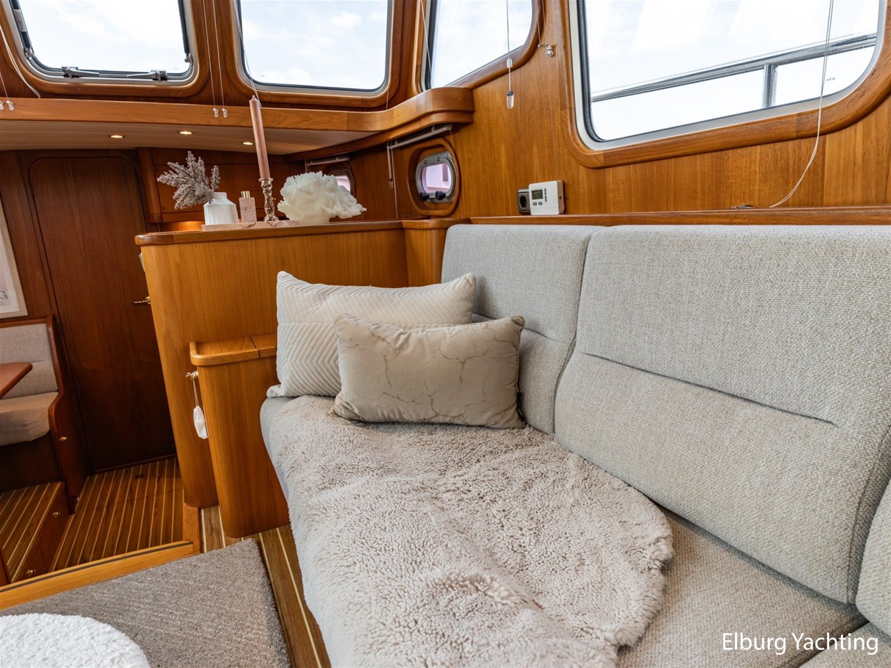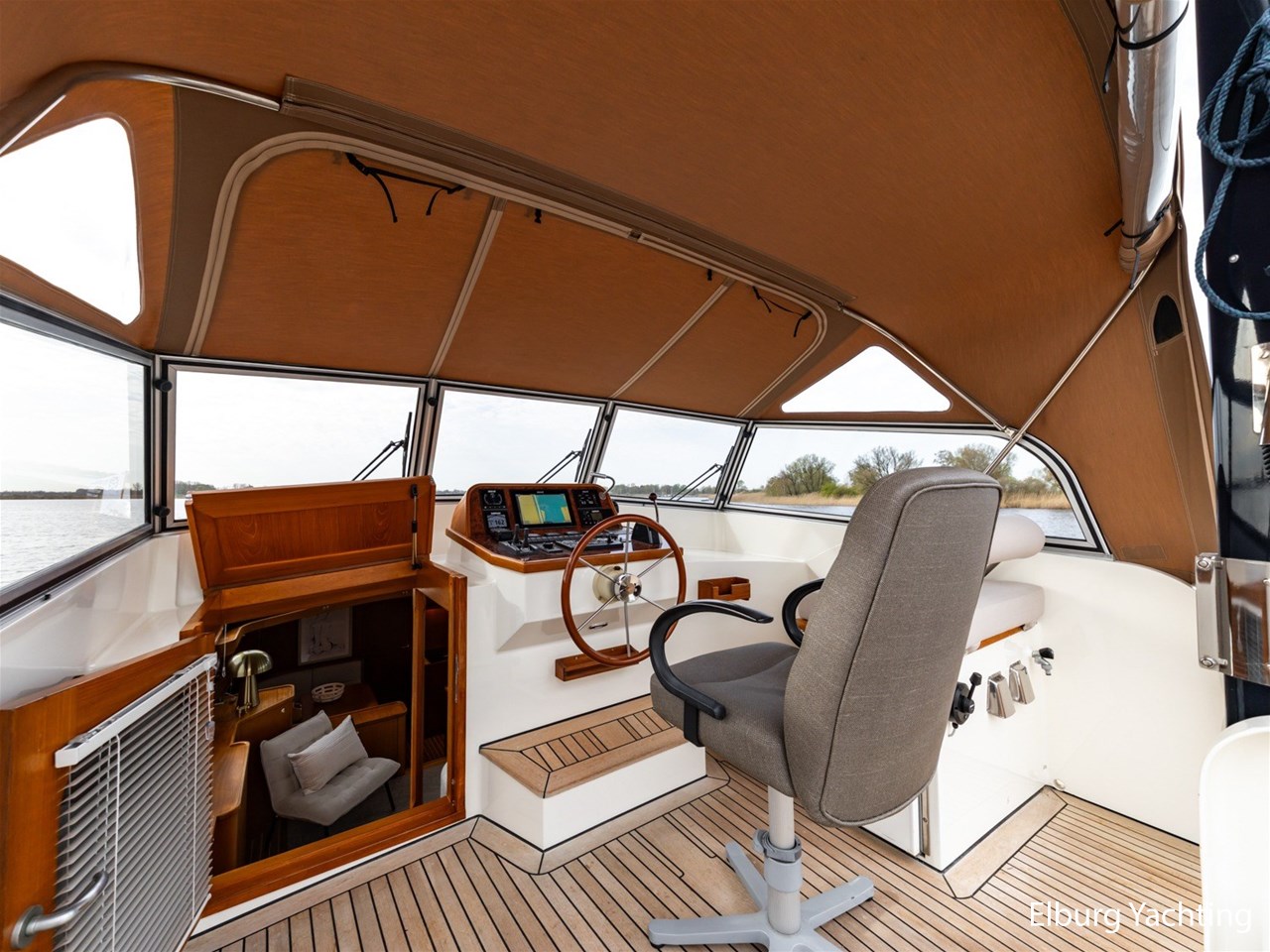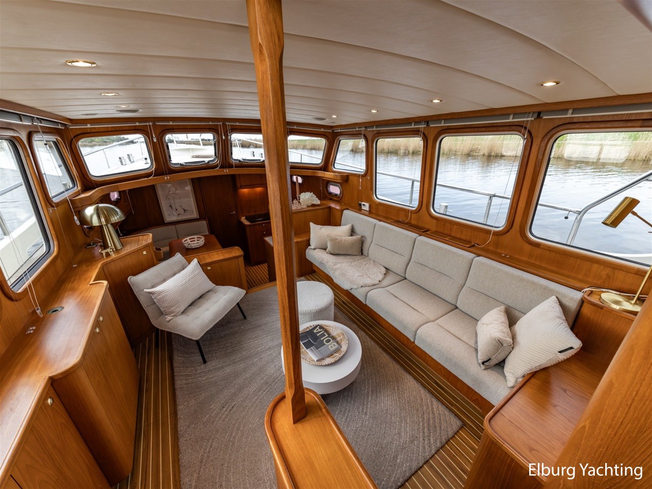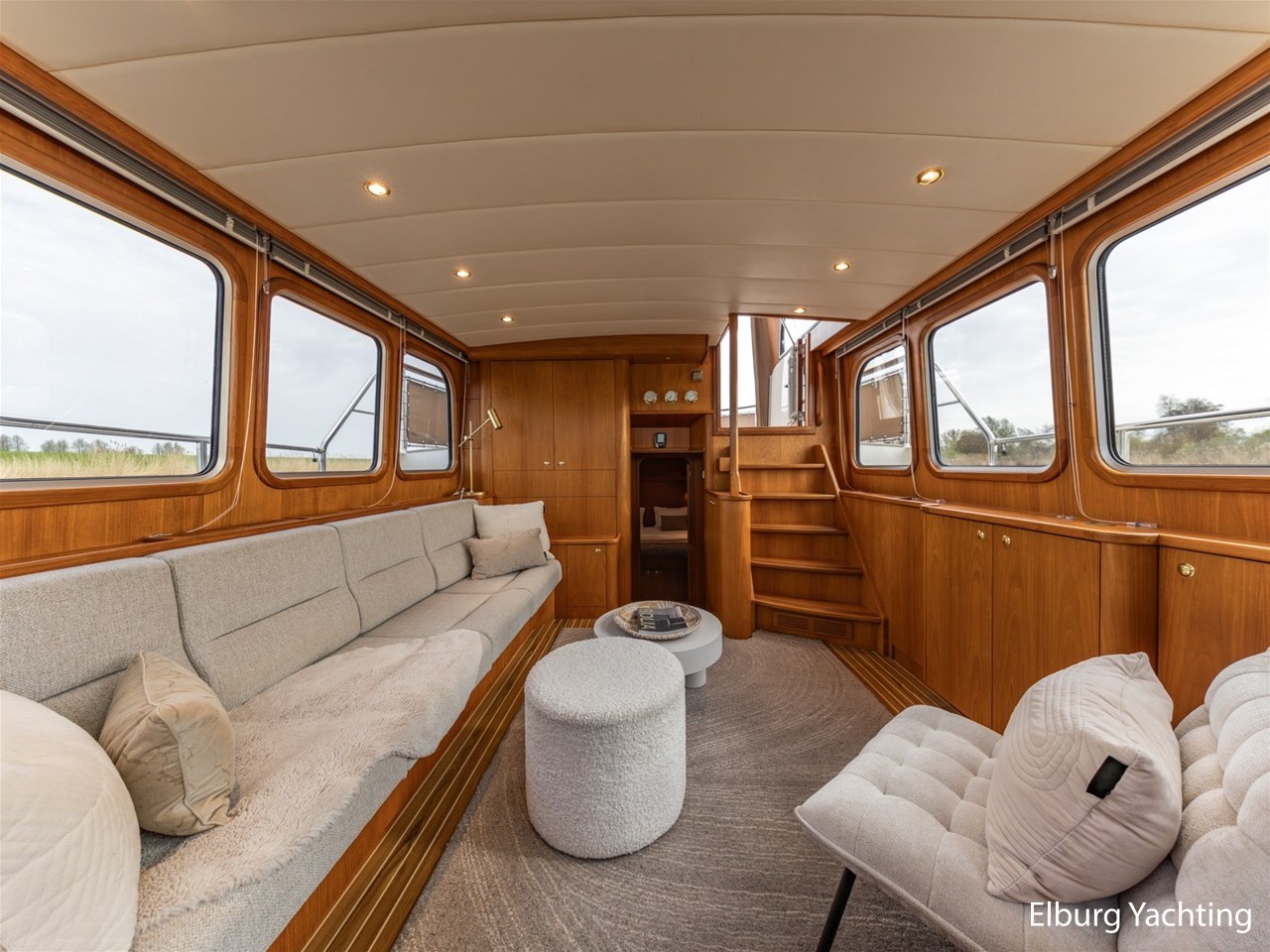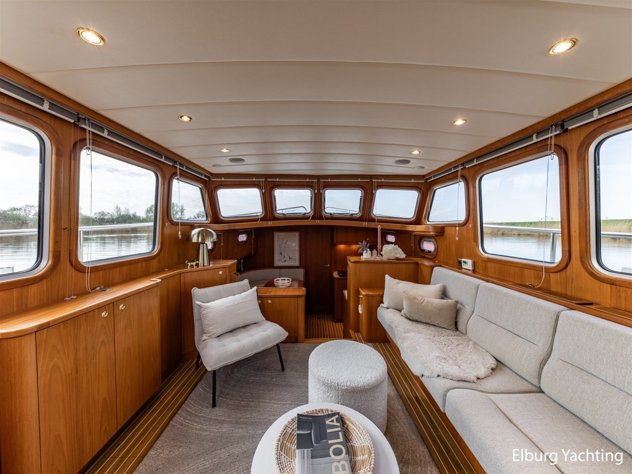 - Hoogwaardig Teakhouten interieur met ronde afwerking en nieuwe grijze stoffering (2024)