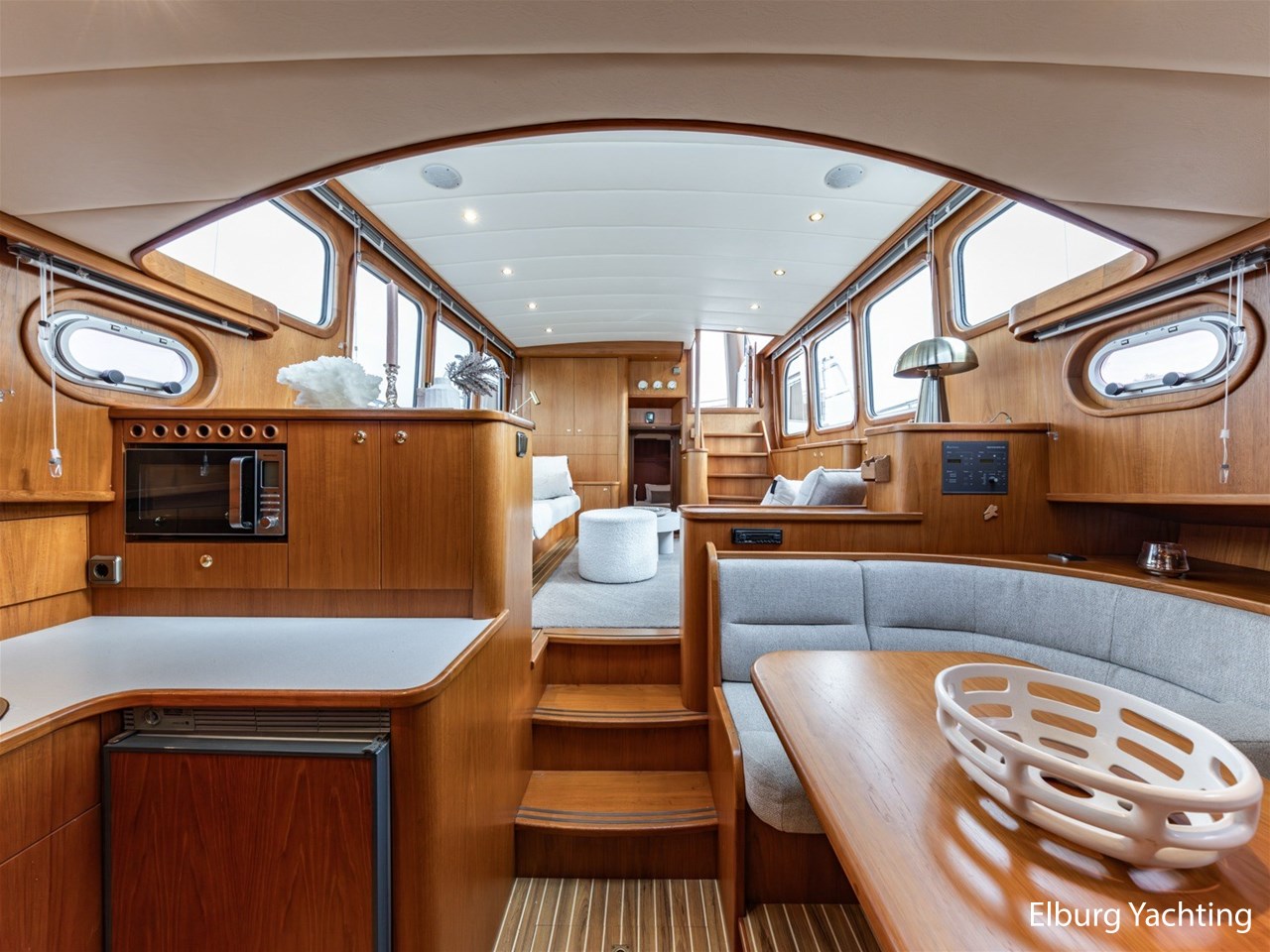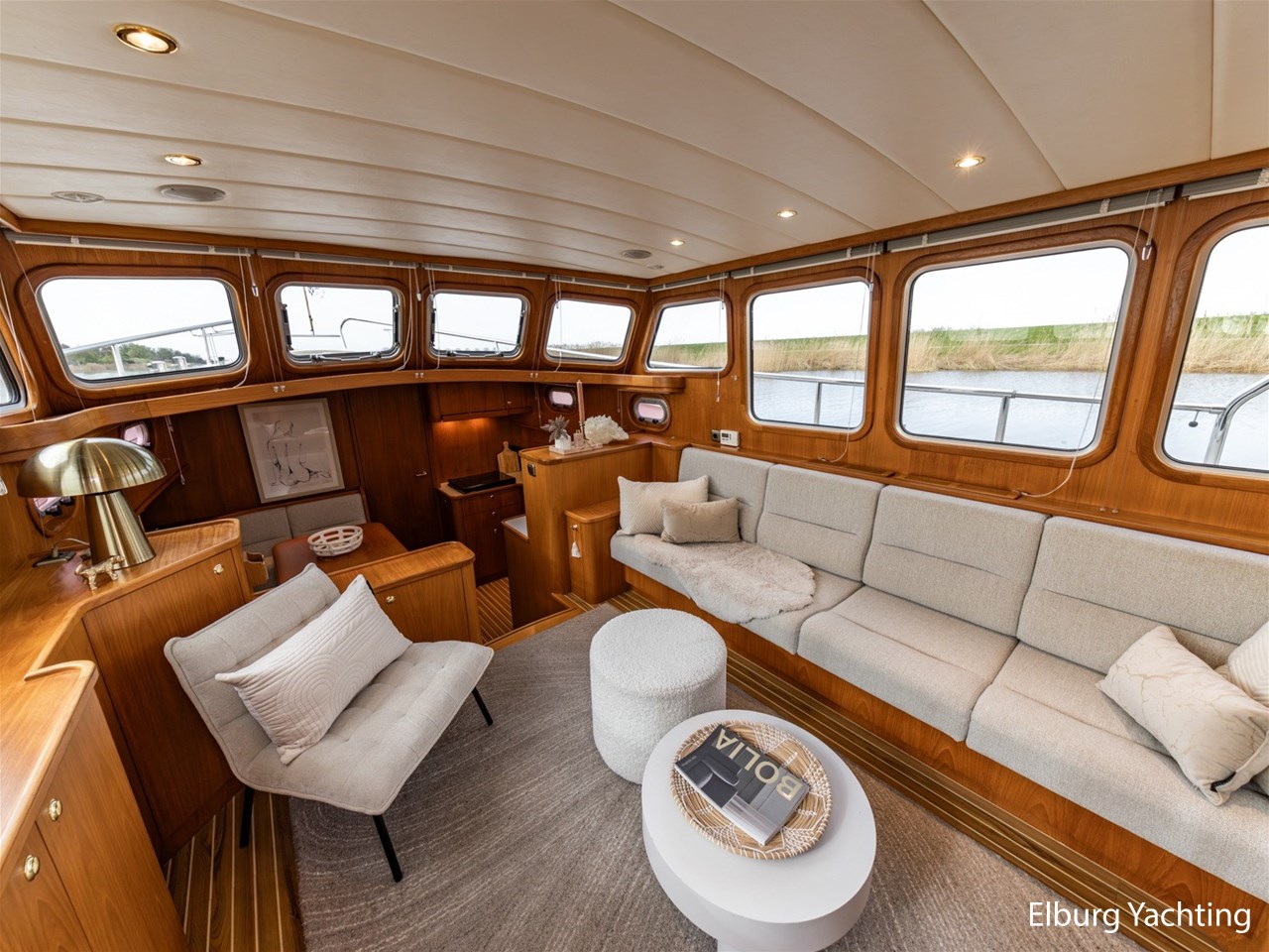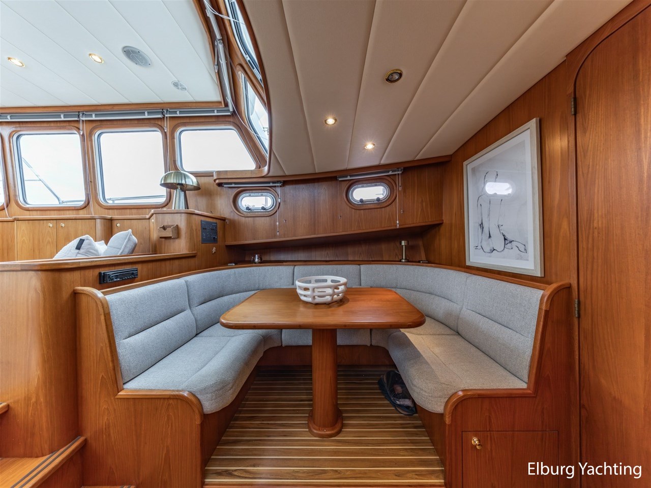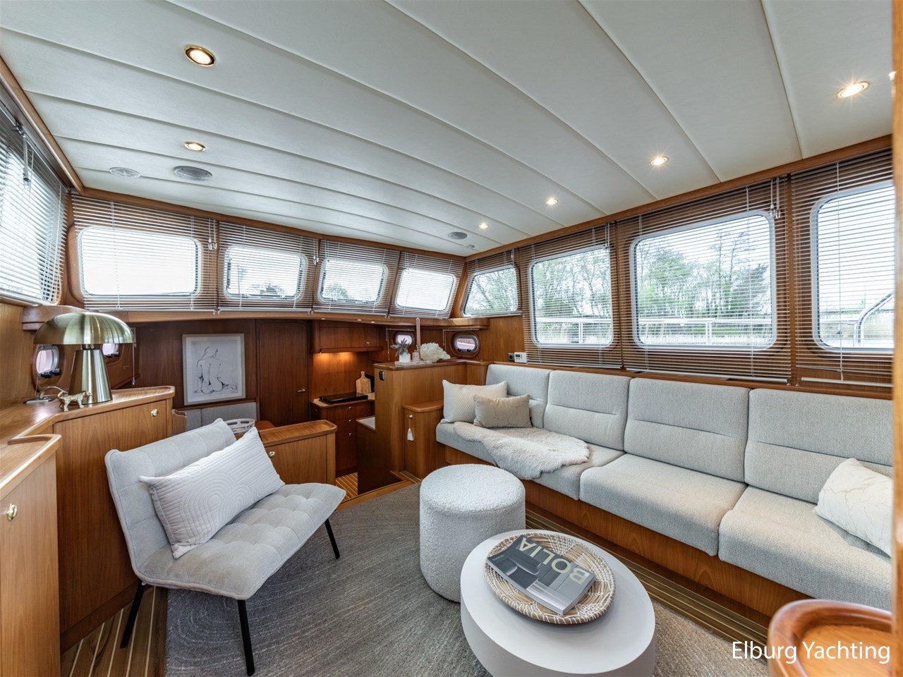 - Hoogwaardig Teakhouten interieur met ronde afwerking en nieuwe grijze stoffering (2024)