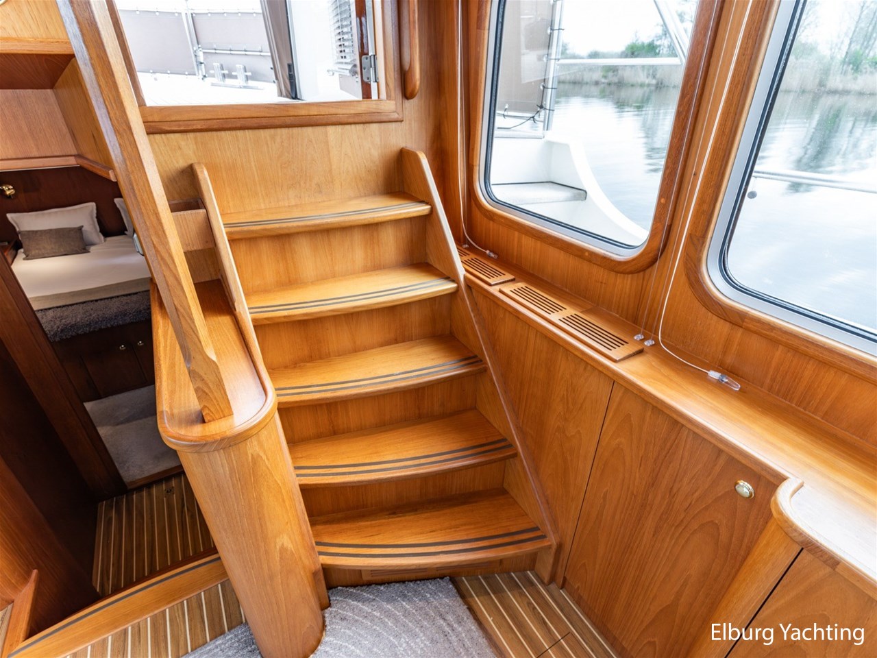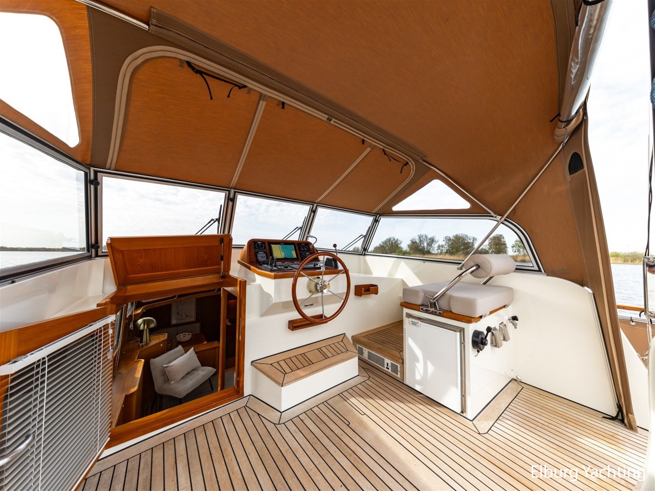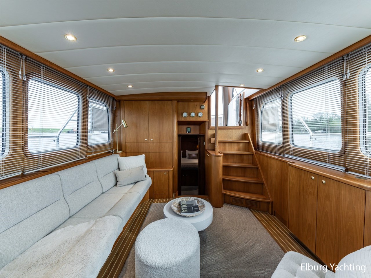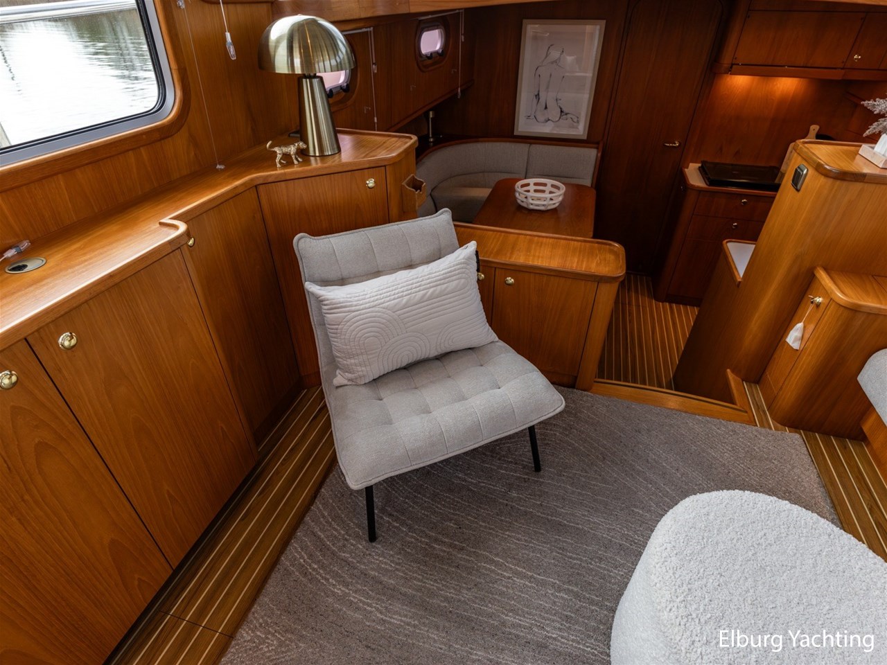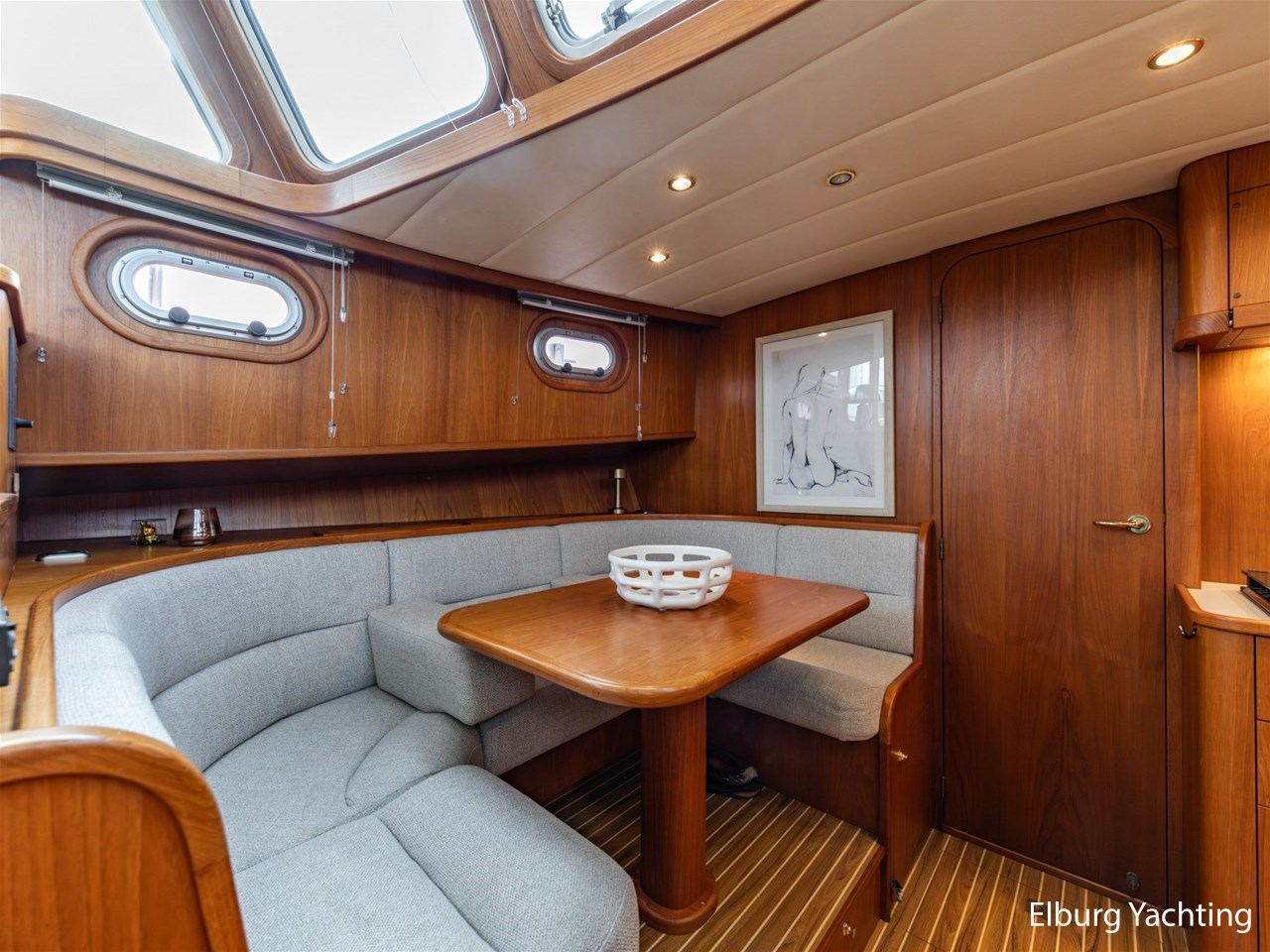 - Hoogwaardig Teakhouten interieur met ronde afwerking en nieuwe grijze stoffering (2024)