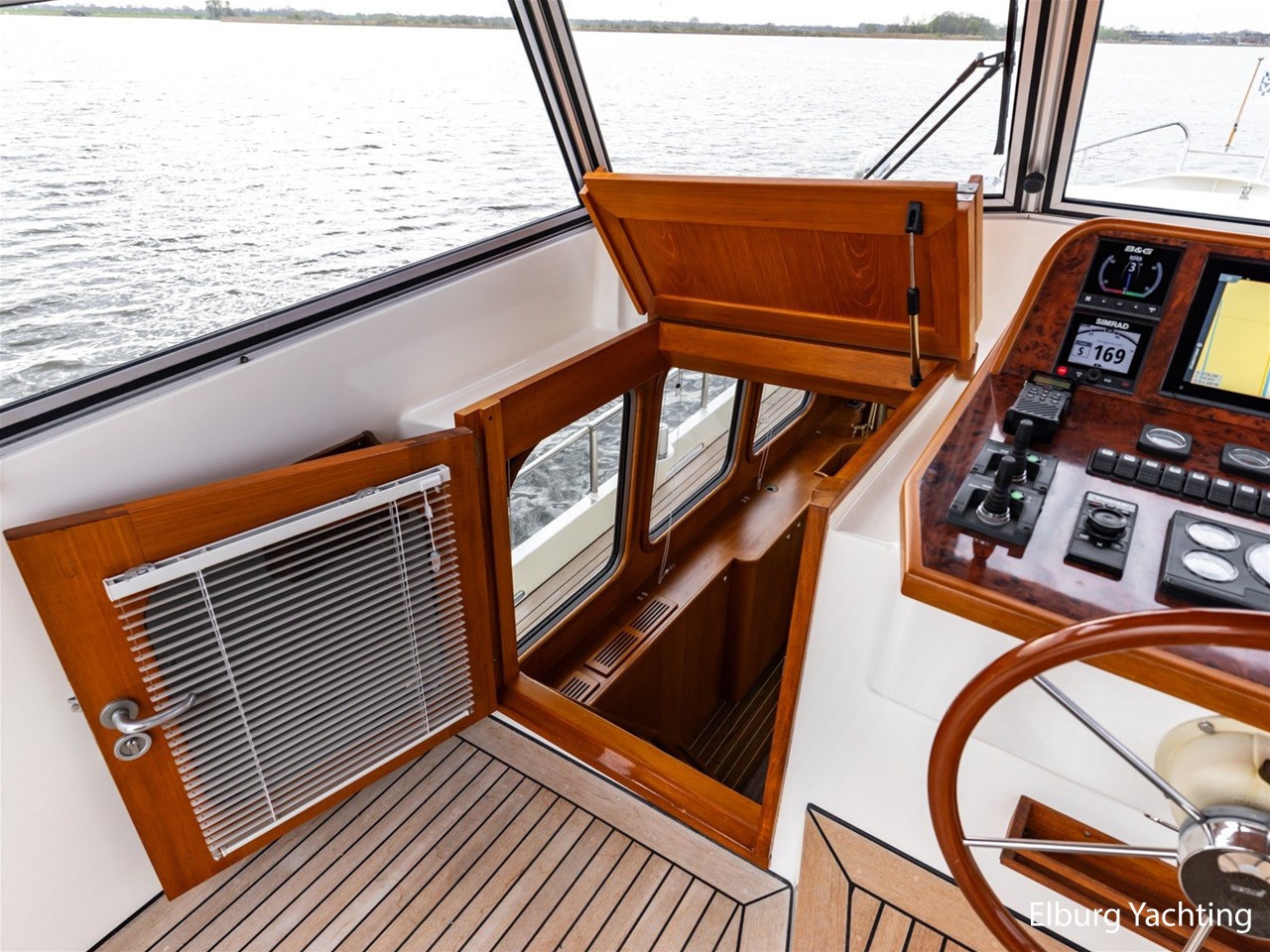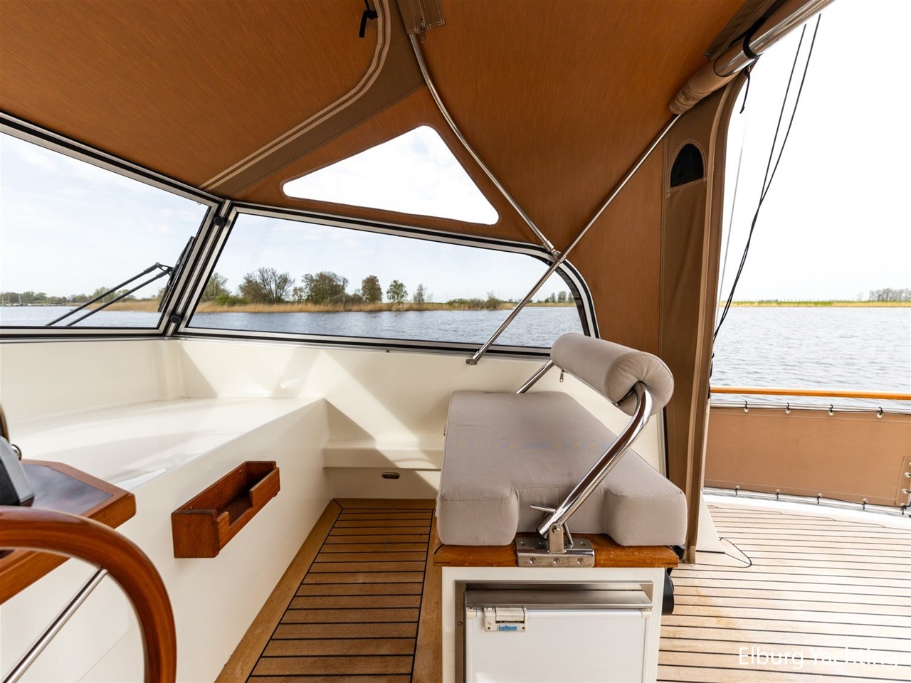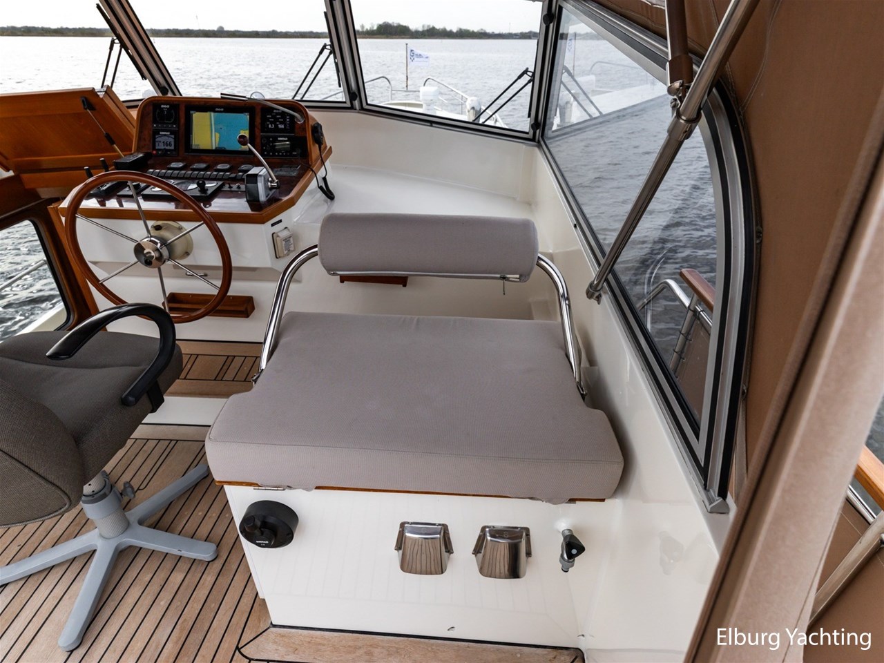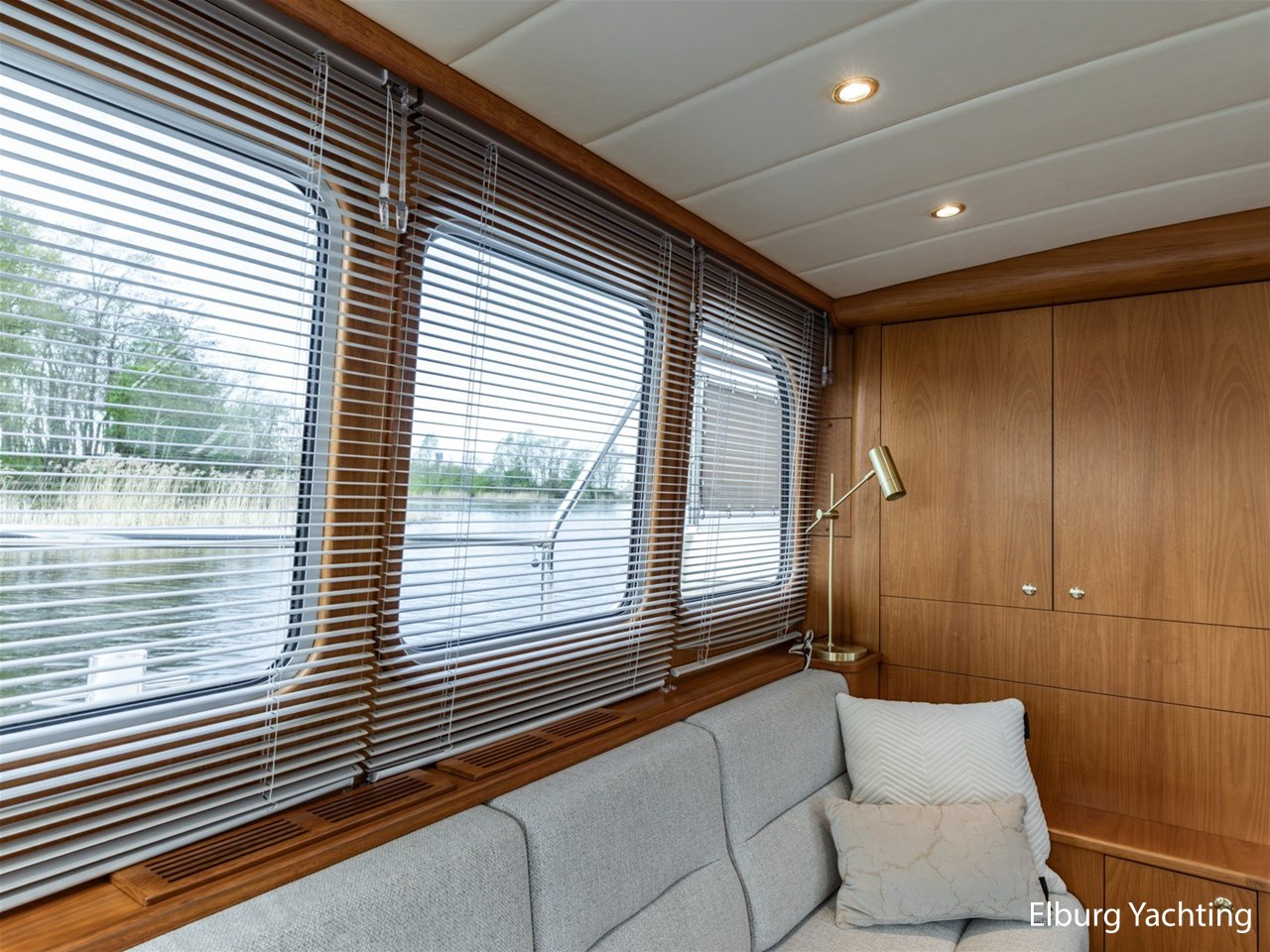 - Hoogwaardig Teakhouten interieur met ronde afwerking en nieuwe grijze stoffering (2024)