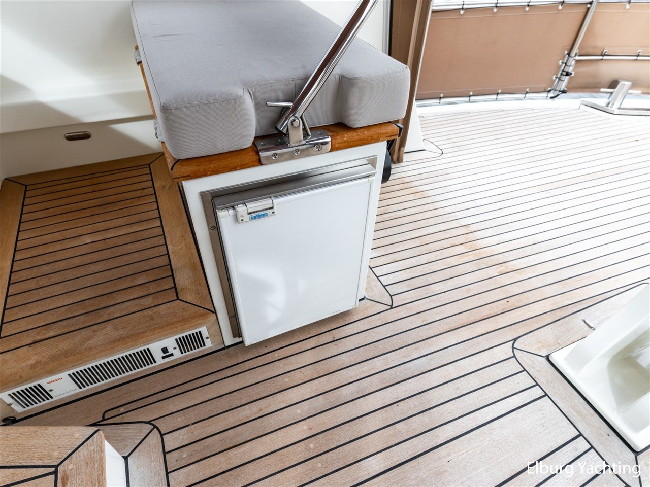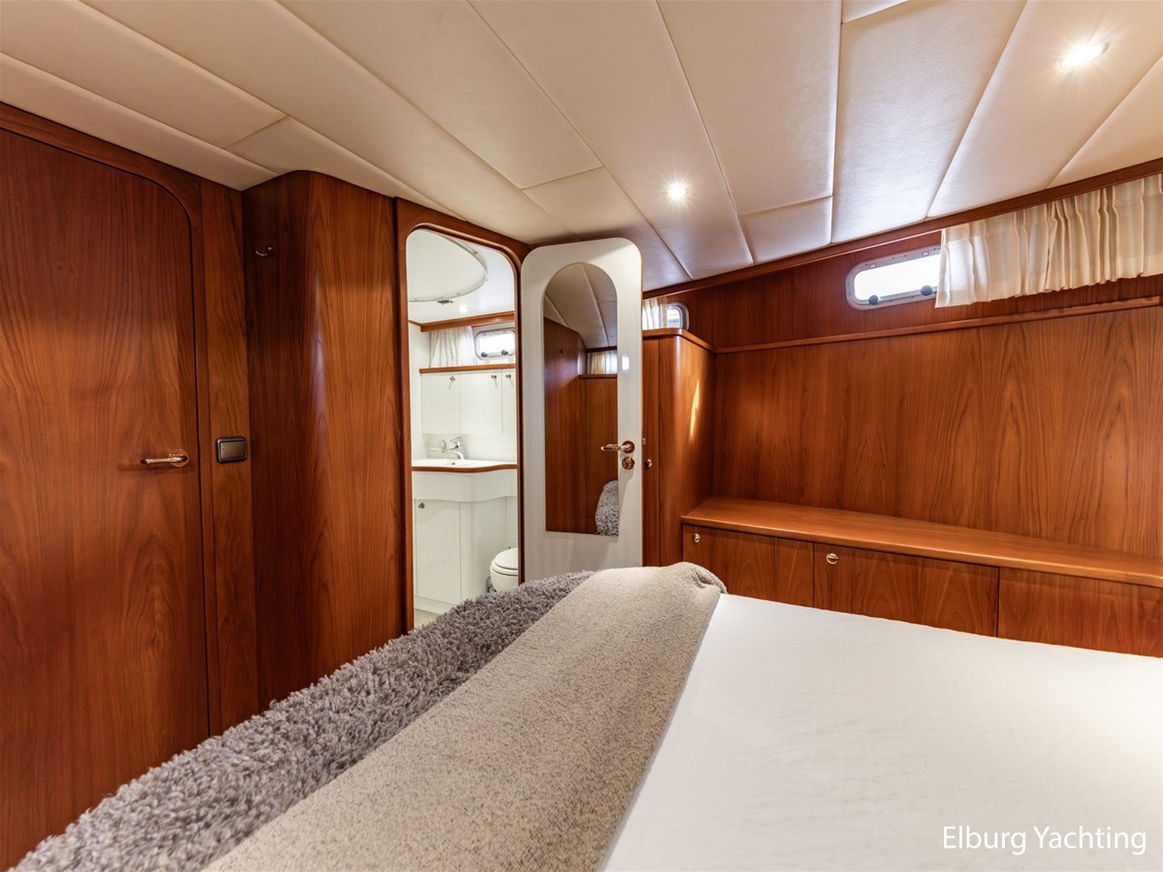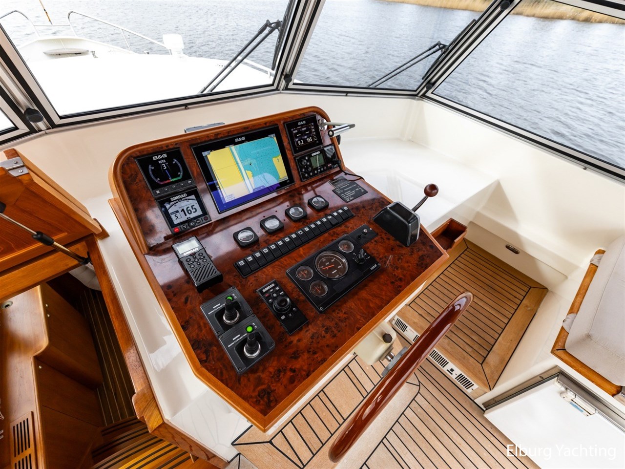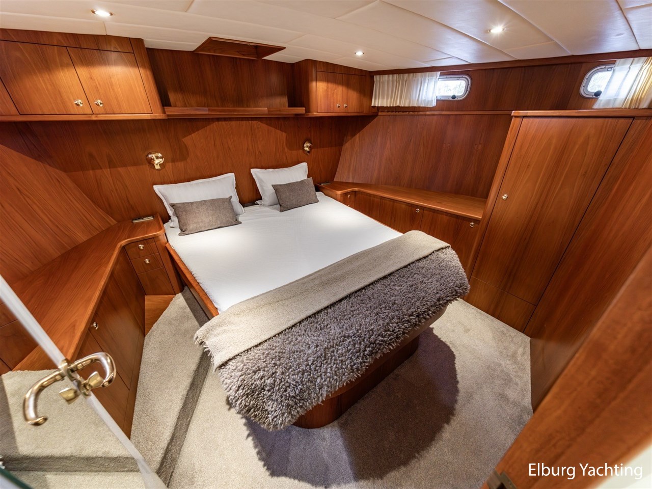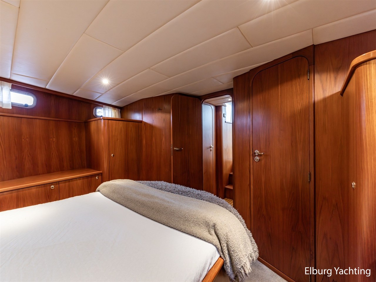 - Hoogwaardig Teakhouten interieur met ronde afwerking en nieuwe grijze stoffering (2024)