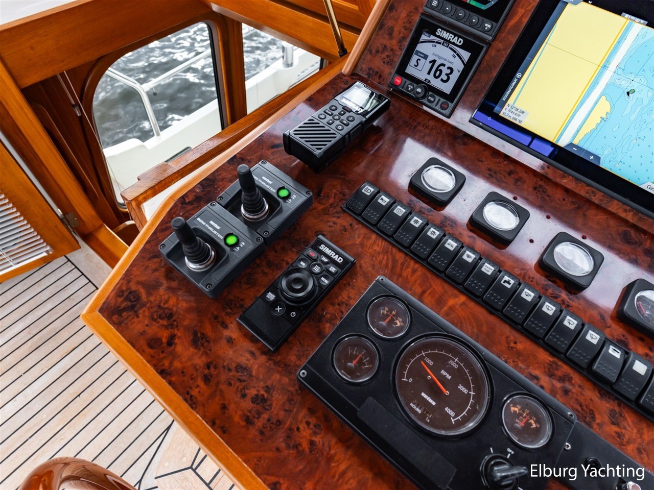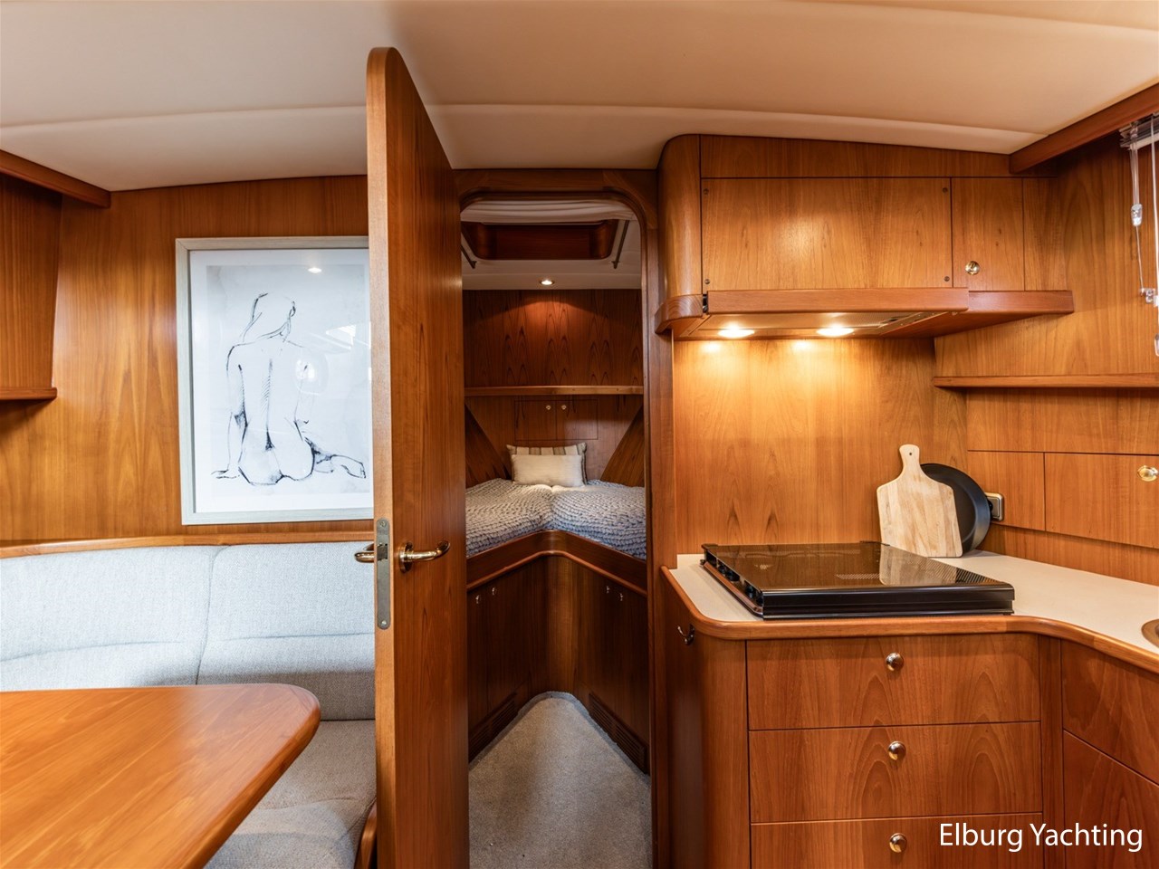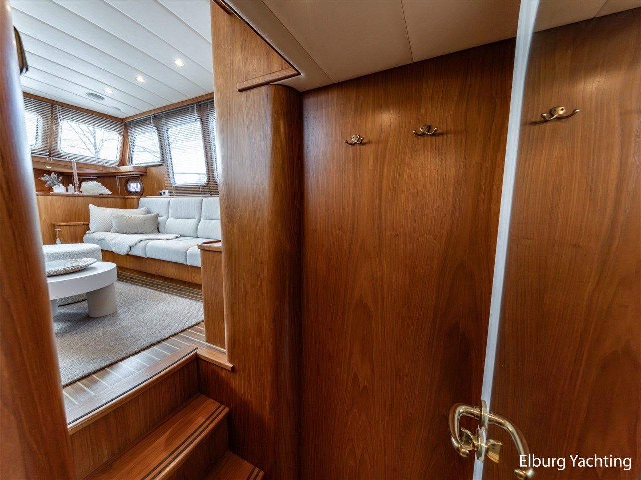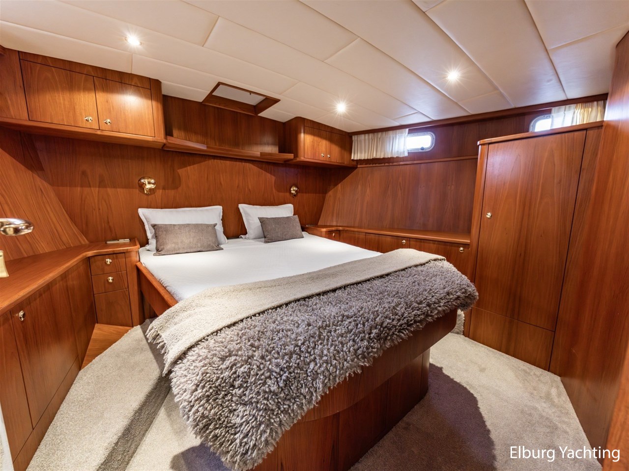 - Hoogwaardig Teakhouten interieur met ronde afwerking en nieuwe grijze stoffering (2024)
