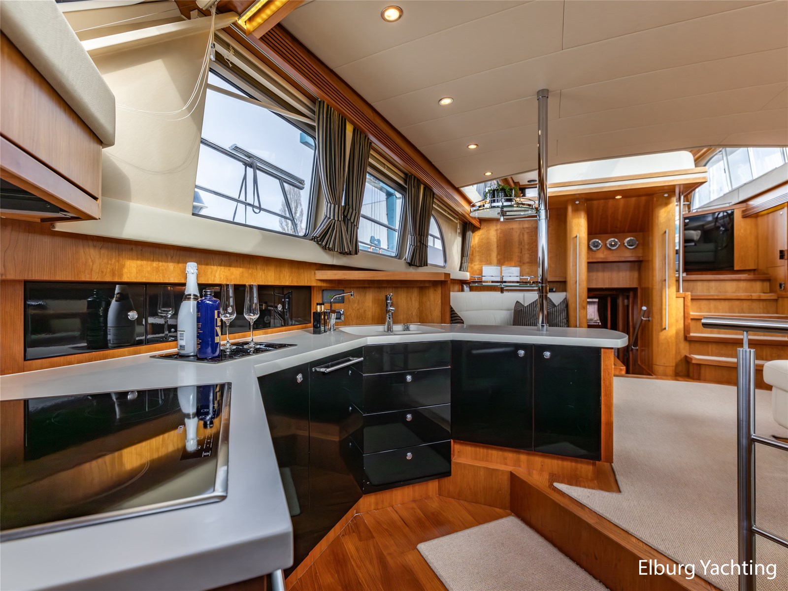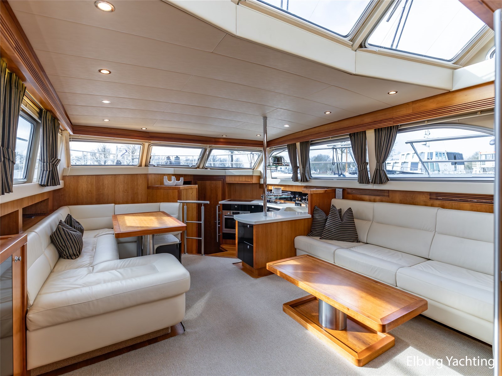 Vanuit de stuurhut loopt u via een niveauverschil naar de ruime salon, uitgevoerd in teak met crème-witte lederen bekleding en royale lichtinval dankzij de grote ramen. De salon is sfeervol verlicht met ingebouwde LED-verlichting en uitgerust met een flatscreen-tv, zodat ontspanning aan boord gegarandeerd is. Aansluitend bevindt zich, een niveau lager, de volledig uitgeruste kombuis. Deze keuken is voorzien van een Corian werkblad, keramische kookplaat, afzuigkap, Bosch oven, combimagnetron en dubbele koelkast. Alles is aanwezig om aan boord volwaardig te kunnen koken en leven.
