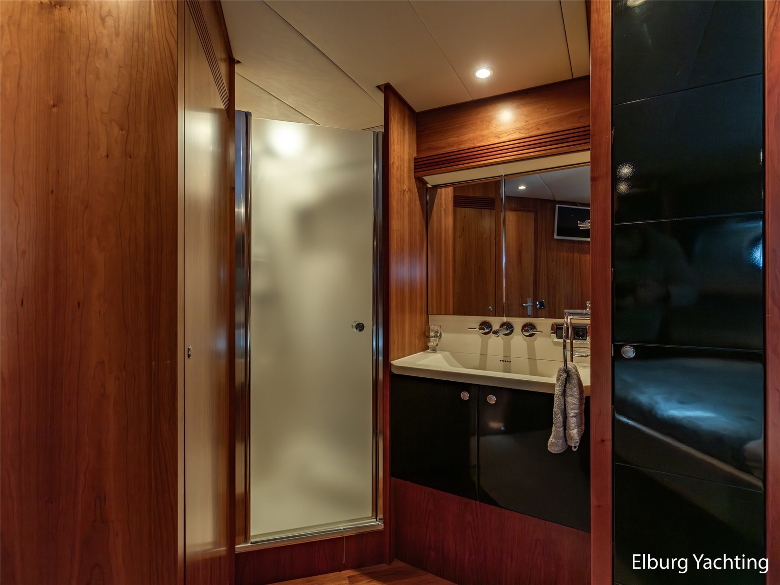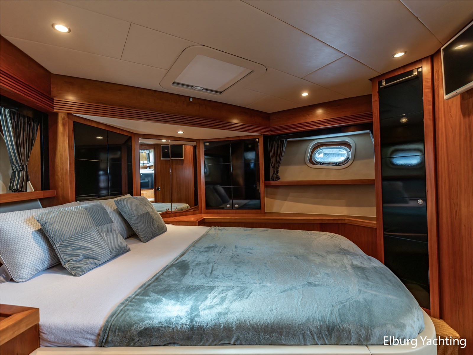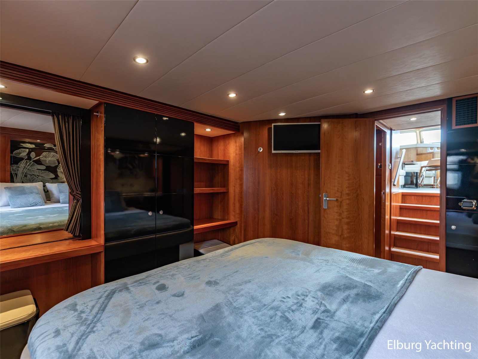 De eigenaarshut achterin is bijzonder royaal en beslaat de volle breedte van het jacht. Deze luxe 'full beam' master cabin beschikt over een vrijstaand tweepersoonsbed, een badkamer en suite, ruime kastopstelling en een sfeervolle afwerking.