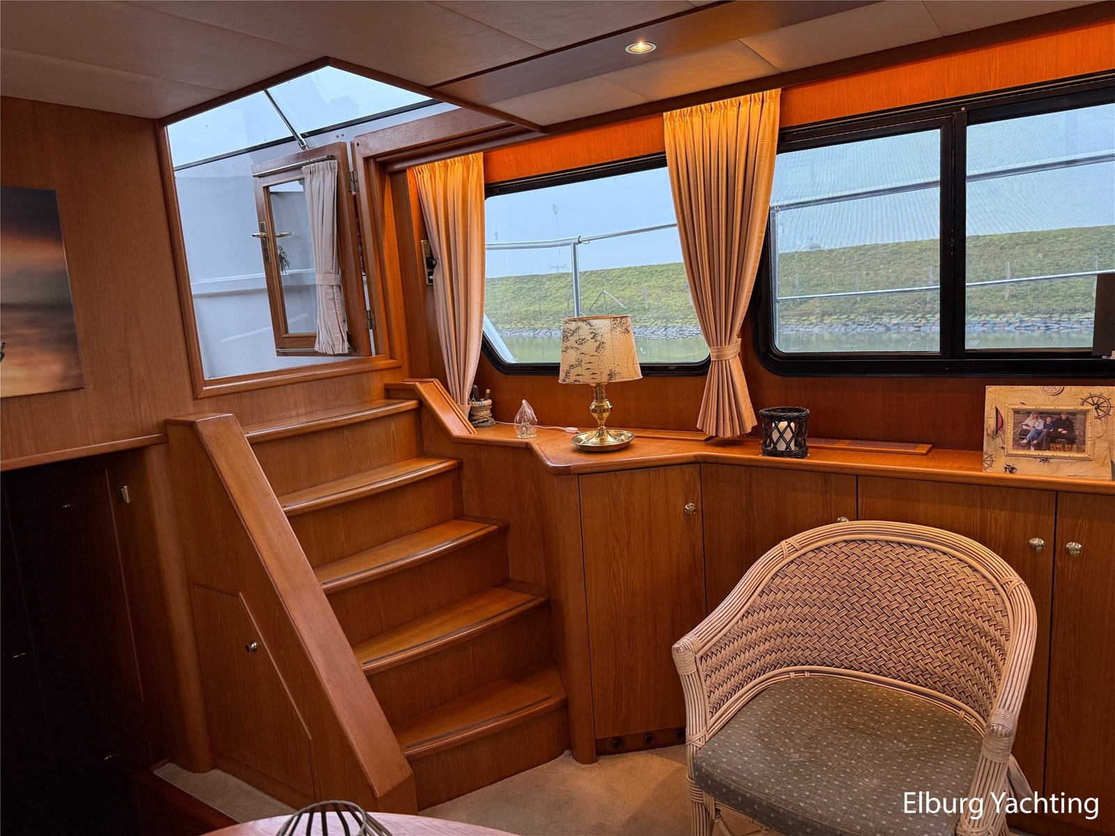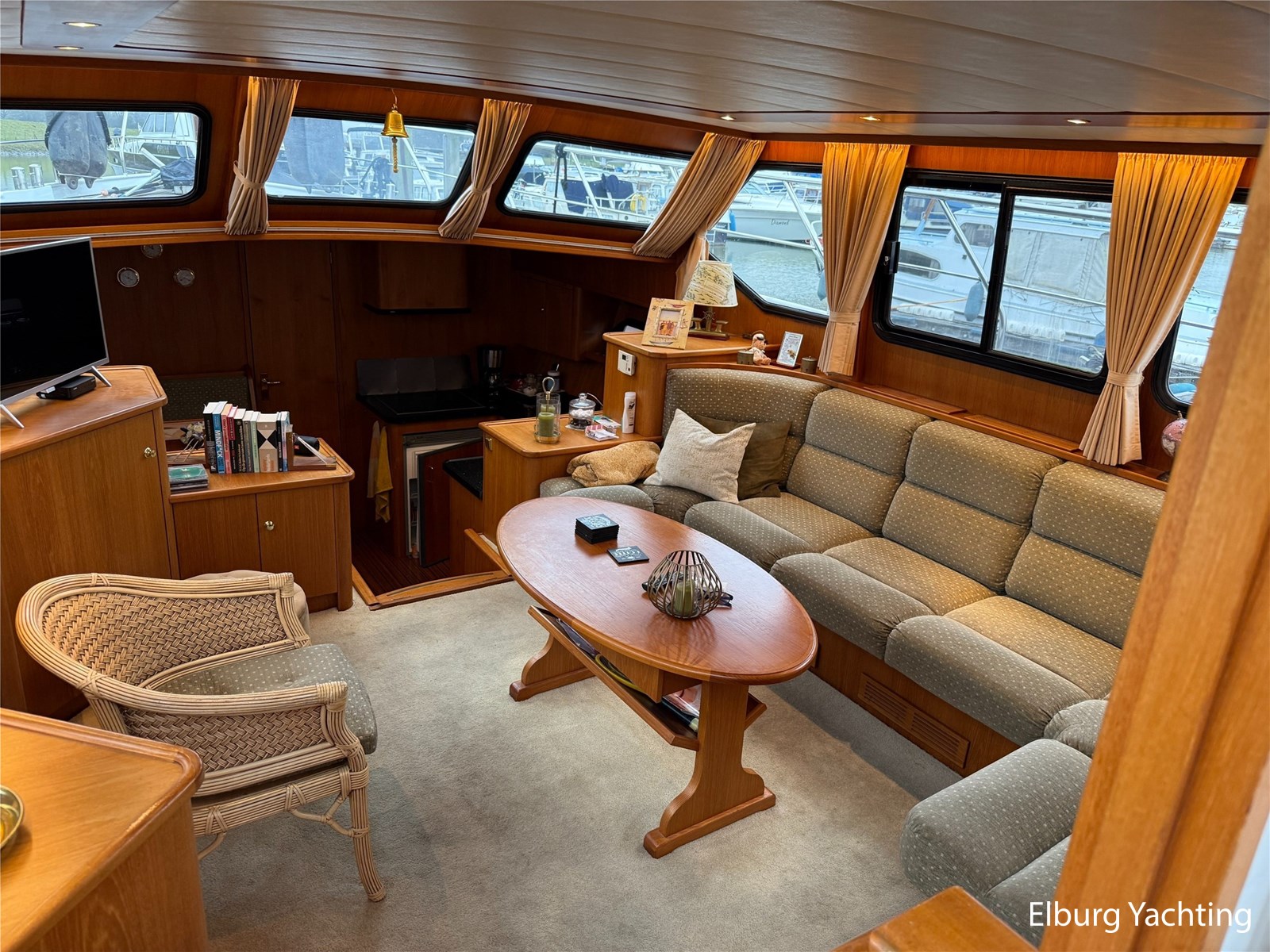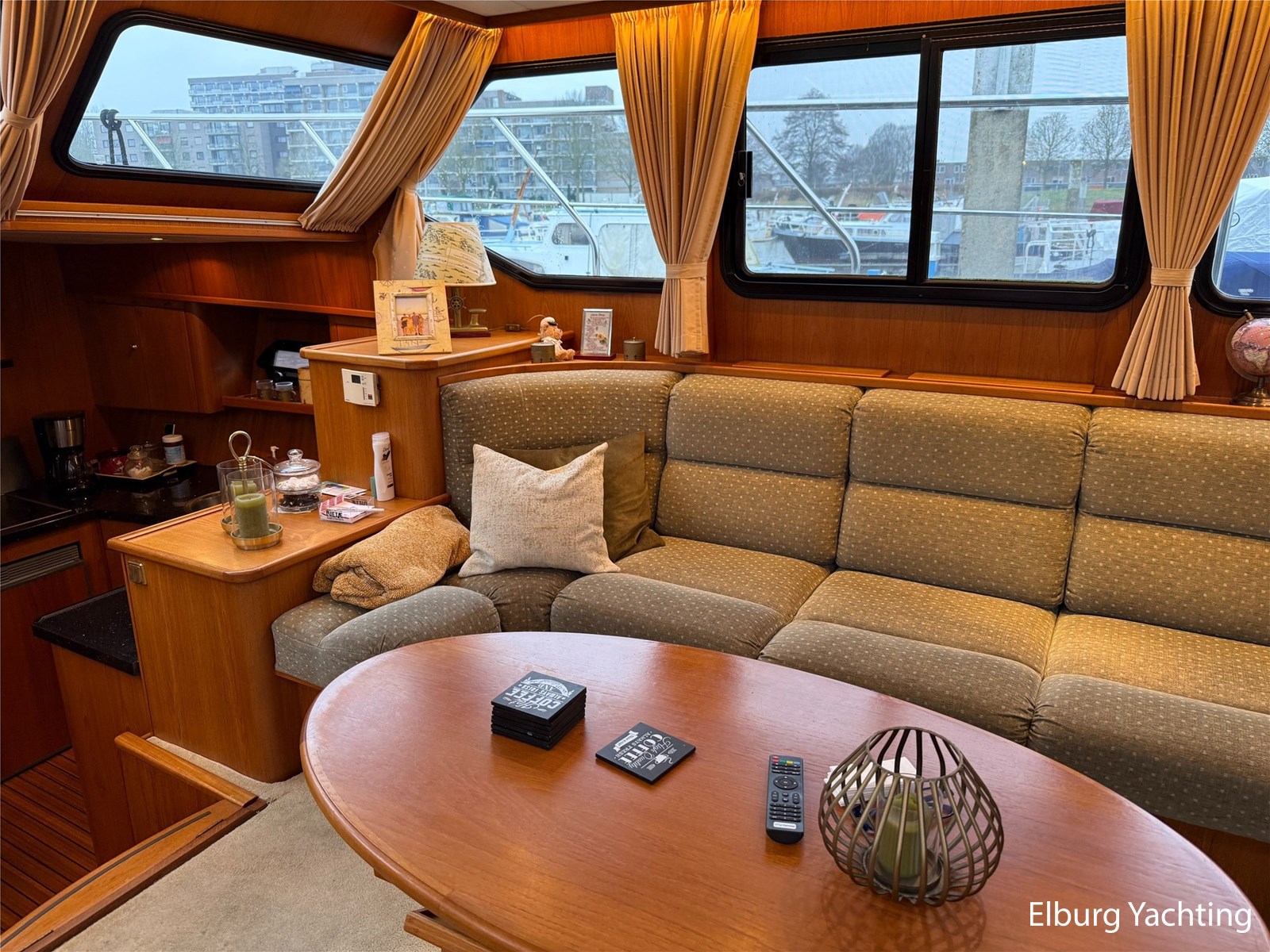 Binnen is het interieur van prachtig scheeps Teakhout in combinatie met bruine stoffen bekleding. Dit creëert een rustige ruimtelijke omgeving waar men heerlijk tot rust komt. Het jacht heeft een grote salon met comfortabele bank met tv en vloerbedekking. Verder naar voren de kombuis met daartegenover de dinette. Helemaal voorin is de voorhut met dubbel vrijstaand bed. Achter de salon via de luie trap naar beneden zijn de derde hut met stapelbed en daar tegenover de badkamer met elektrisch toilet, douche en wastafel gesitueerd en helemaal achterin zit de eigenaarshut met vrijstaand tweepersoons bed.