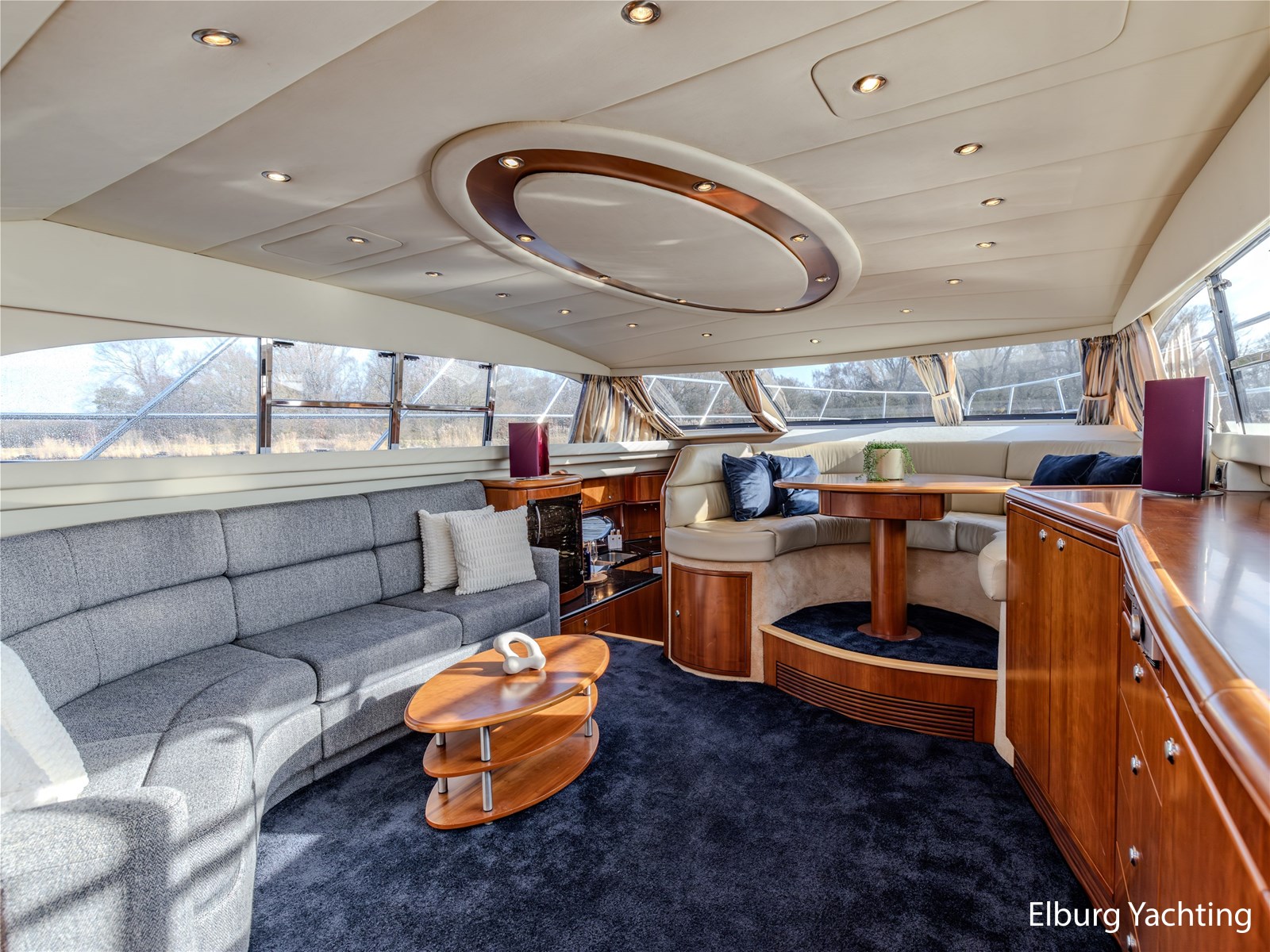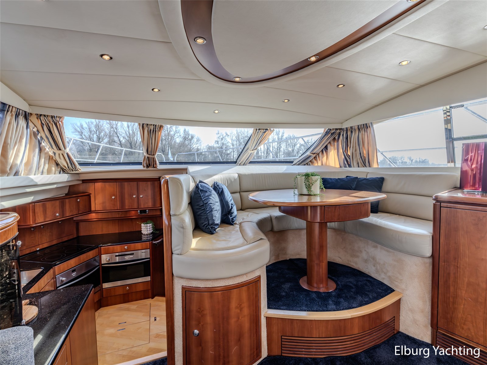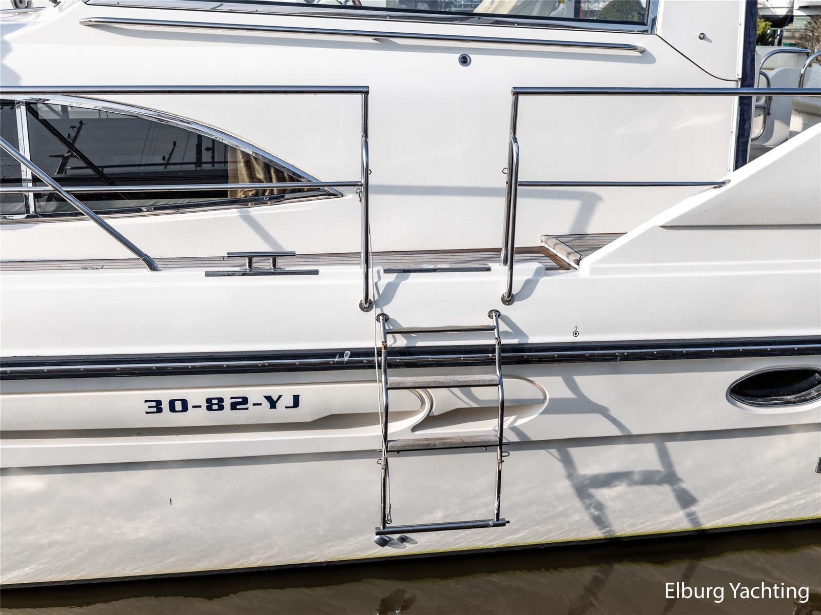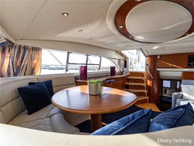 Rondom is het jacht voorzien van een prachtig Teakdek in combinatie met een driedubbel uitgevoerde r.v.s. zeereling. Aan beide zijden zijn relingpoortjes aangebracht met een comfortabele boegopstap waardoor het jacht ook bij de lagere steigers eenvoudig te betreden is. Het zwemplateau is eenvoudig te bereiken via de luie trap aan stuurboordzijde en een hydraulische gangway tevens is het zwemplateau voorzien van een Teakdek met steunen voor de bijboot, welke eenvoudig met de uitschuifbare gangway kunt kranen. Binnen is het jacht voorzien van een warm luxe Kersenhouten interieur met granieten werkbladen. De Kombuis is voorzien van Miele kwaliteitsapparatuur, het is aangenaam op temperatuur te krijgen via de Kabola centrale verwarming. Dimbare verlichting en 3 volwaardige hutten met 3 maal sanitair (3 x elektrische toiletten met 3 douches). Aan boord is de kastruimte goed doordacht en het interieur is prachtig afgewerkt.