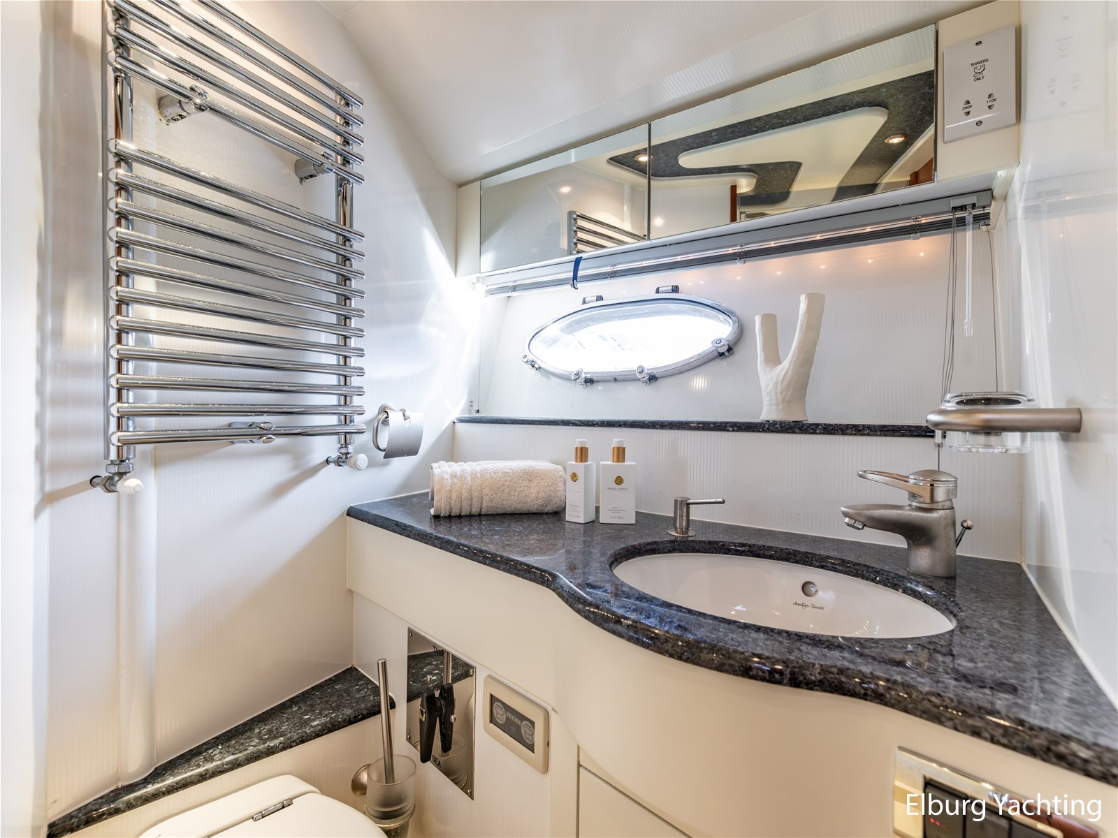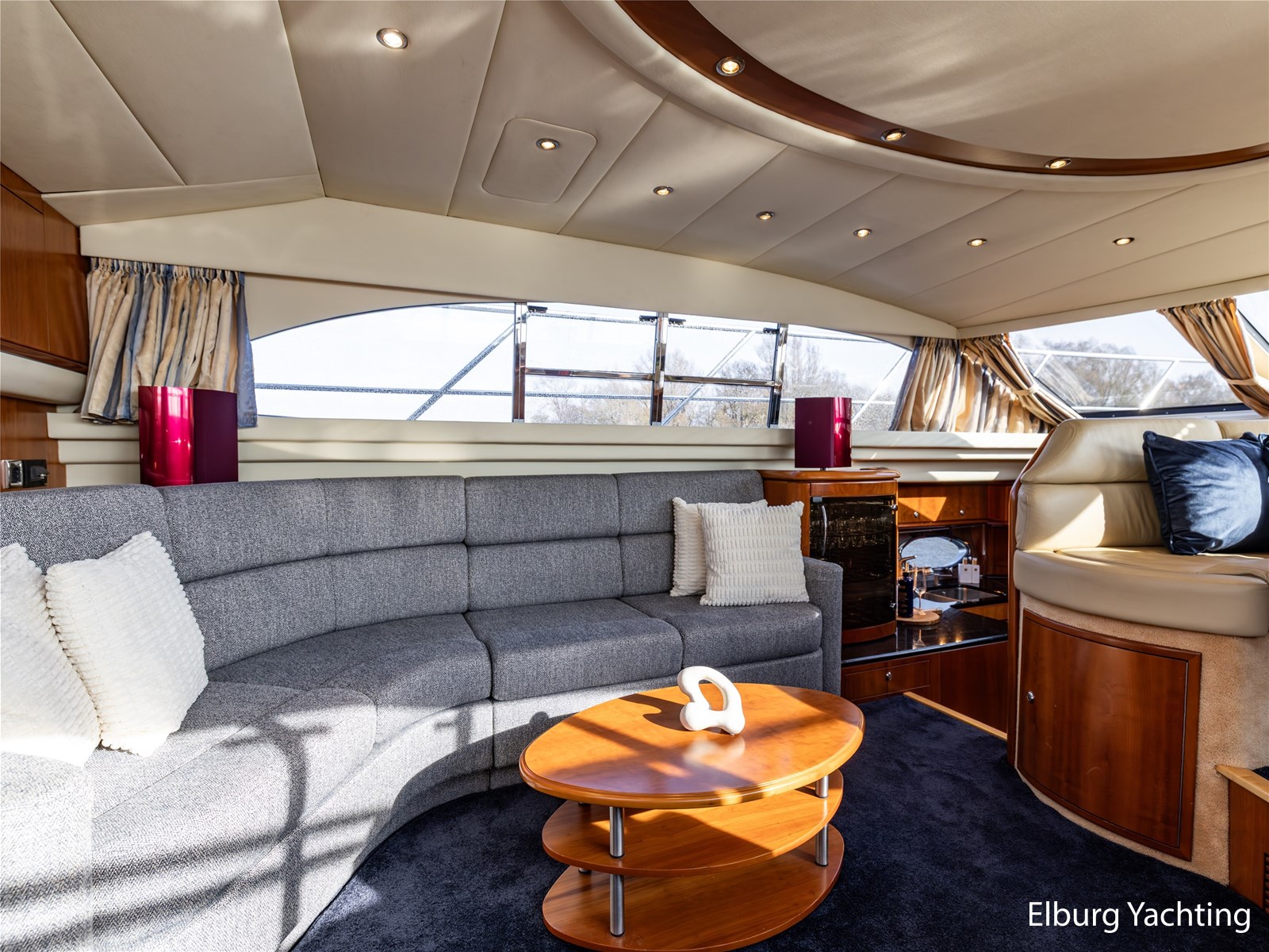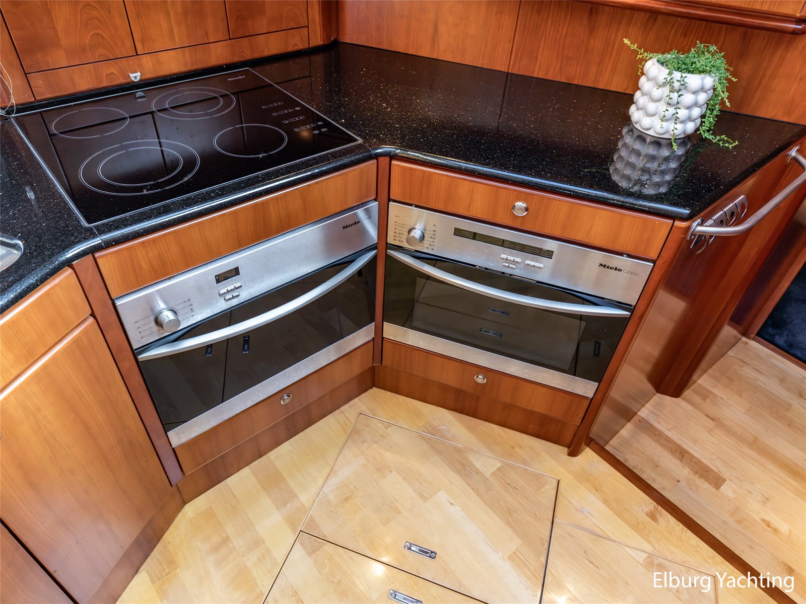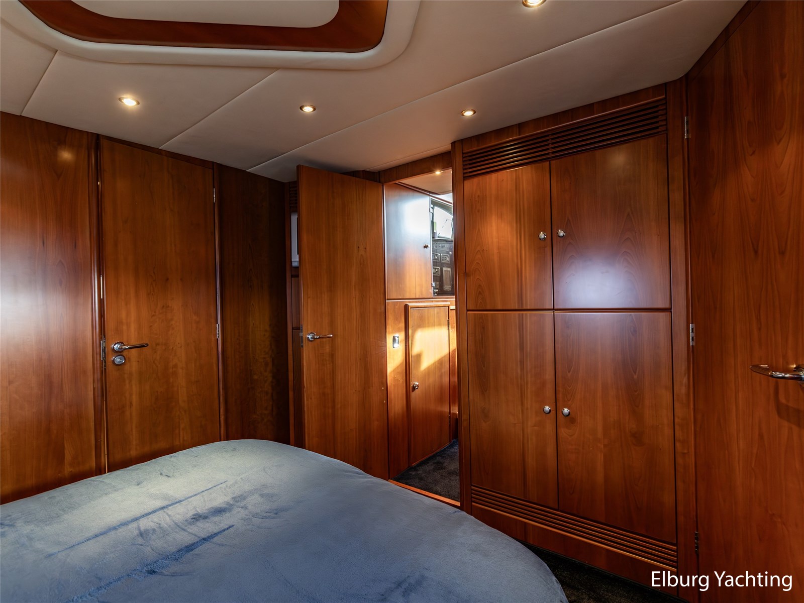 Rondom is het jacht voorzien van een prachtig Teakdek in combinatie met een driedubbel uitgevoerde r.v.s. zeereling. Aan beide zijden zijn relingpoortjes aangebracht met een comfortabele boegopstap waardoor het jacht ook bij de lagere steigers eenvoudig te betreden is. Het zwemplateau is eenvoudig te bereiken via de luie trap aan stuurboordzijde en een hydraulische gangway tevens is het zwemplateau voorzien van een Teakdek met steunen voor de bijboot, welke eenvoudig met de uitschuifbare gangway kunt kranen. Binnen is het jacht voorzien van een warm luxe Kersenhouten interieur met granieten werkbladen. De Kombuis is voorzien van Miele kwaliteitsapparatuur, het is aangenaam op temperatuur te krijgen via de Kabola centrale verwarming. Dimbare verlichting en 3 volwaardige hutten met 3 maal sanitair (3 x elektrische toiletten met 3 douches). Aan boord is de kastruimte goed doordacht en het interieur is prachtig afgewerkt.