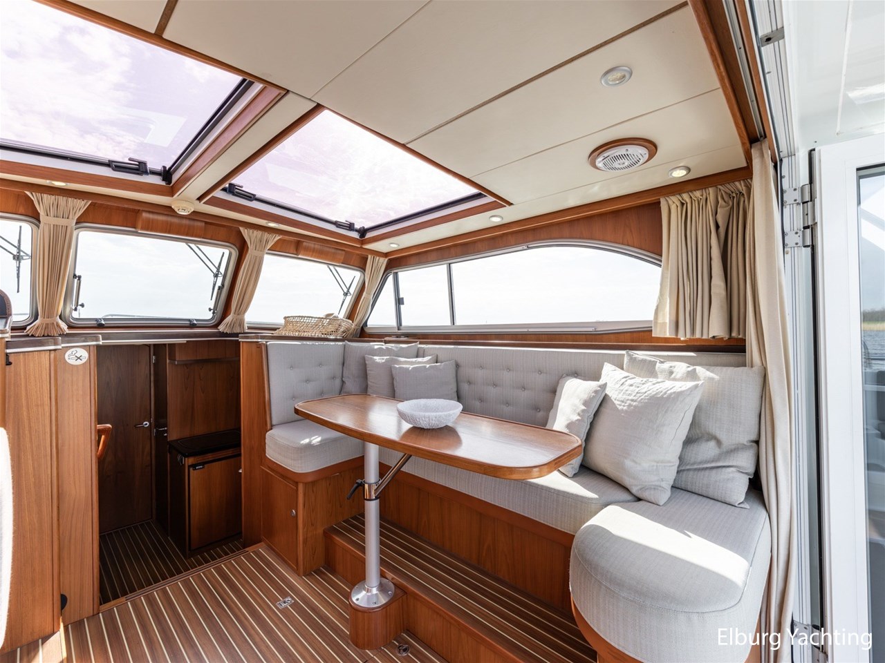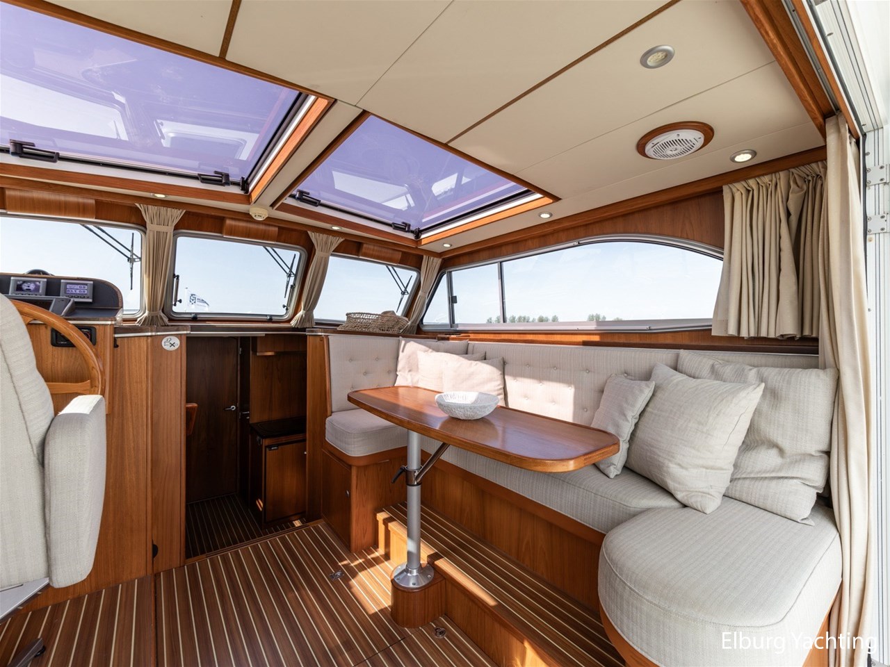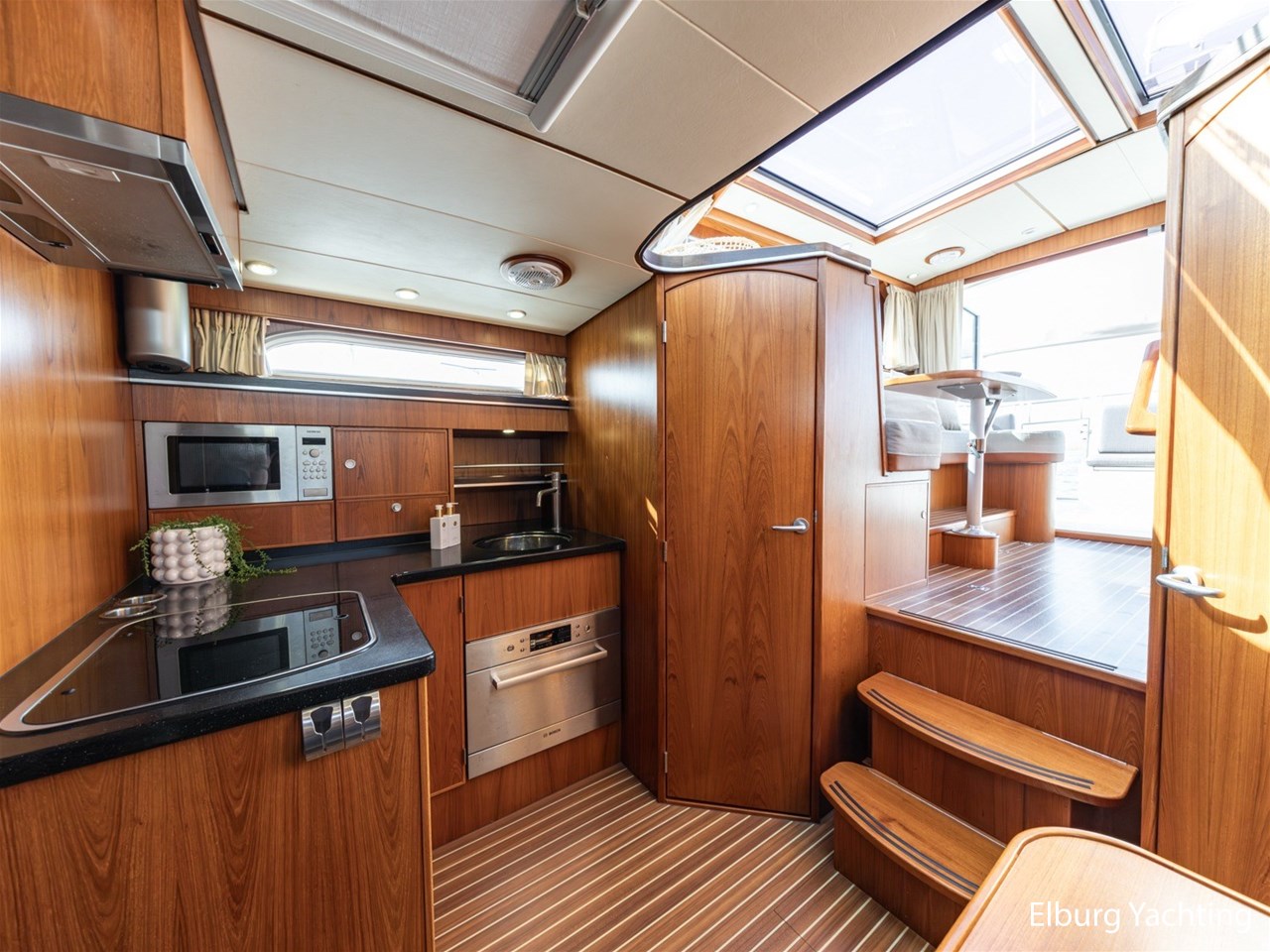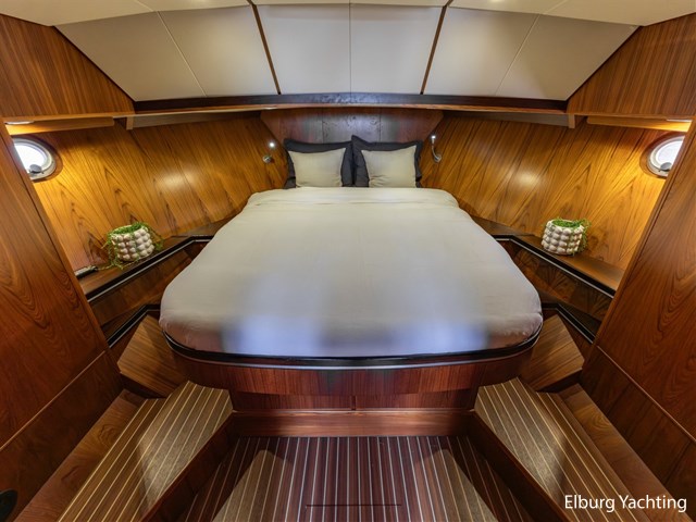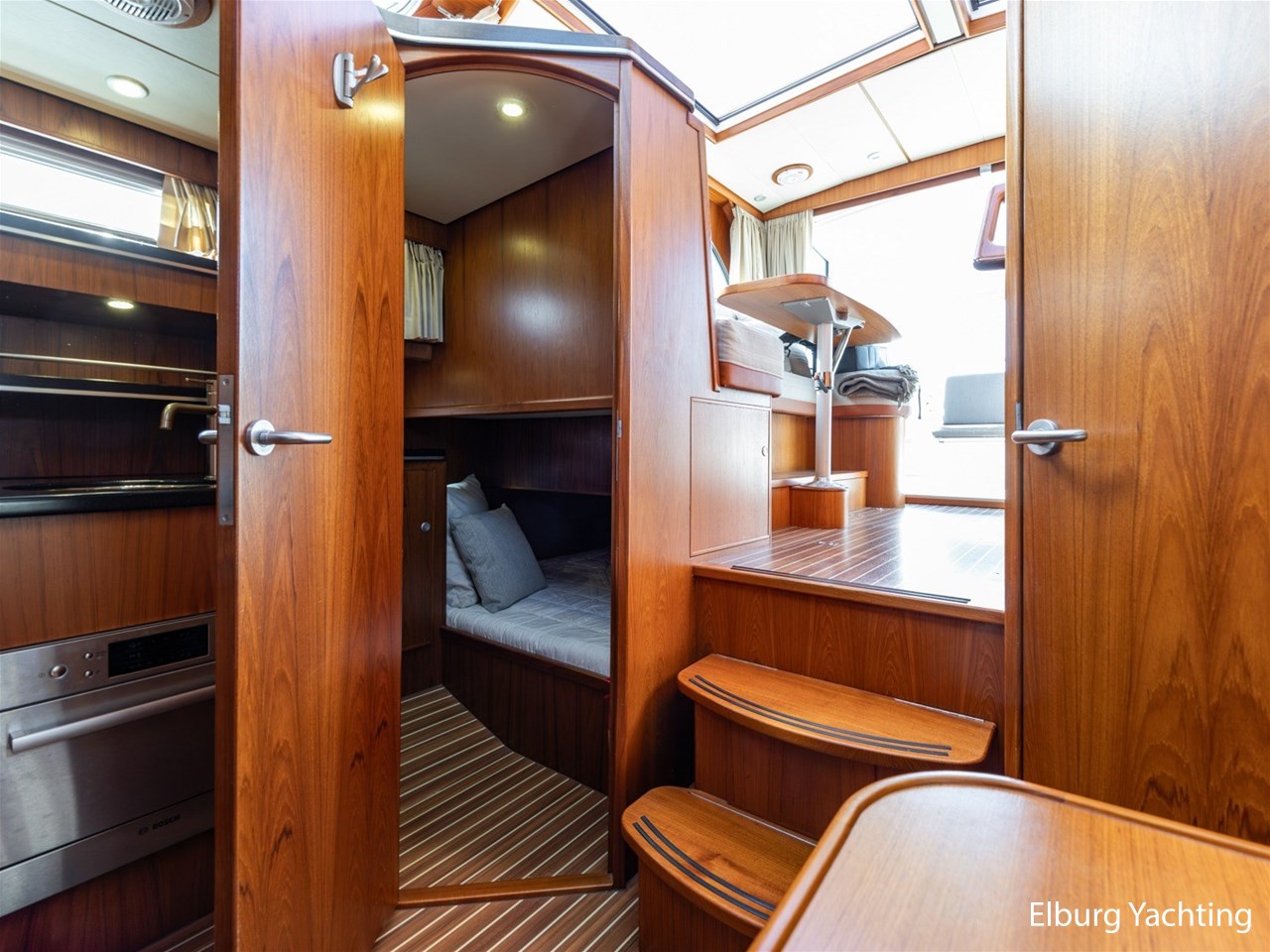 - Teak scheepsinterieur met wengé afwerking en r.v.s. accenten