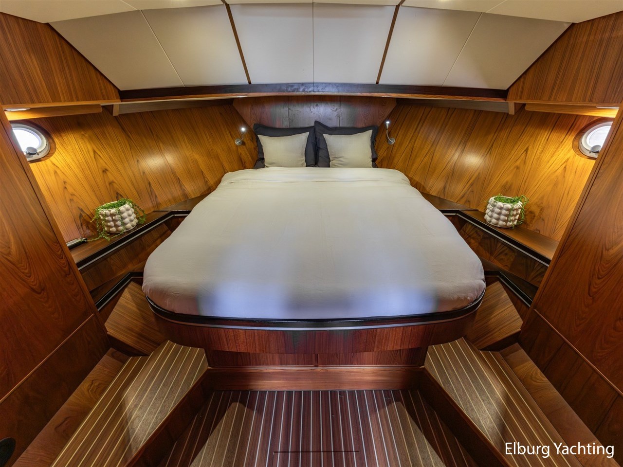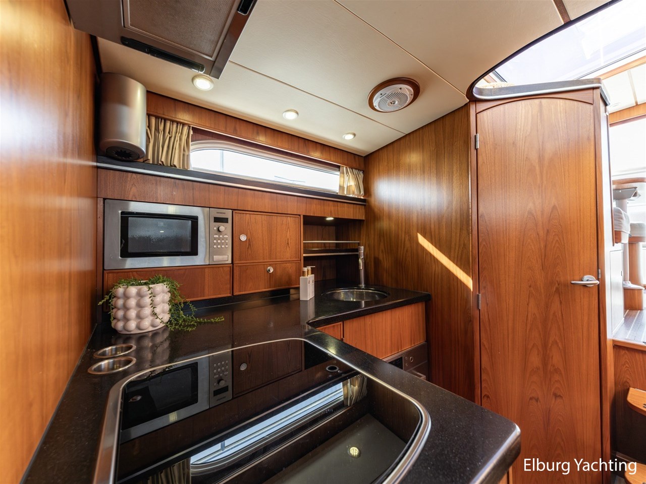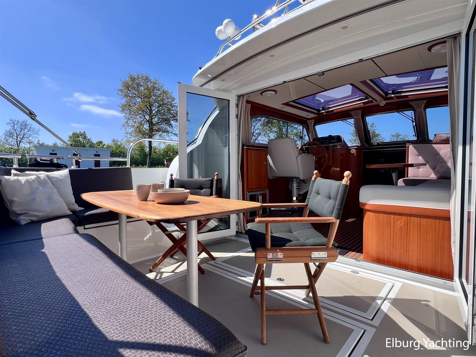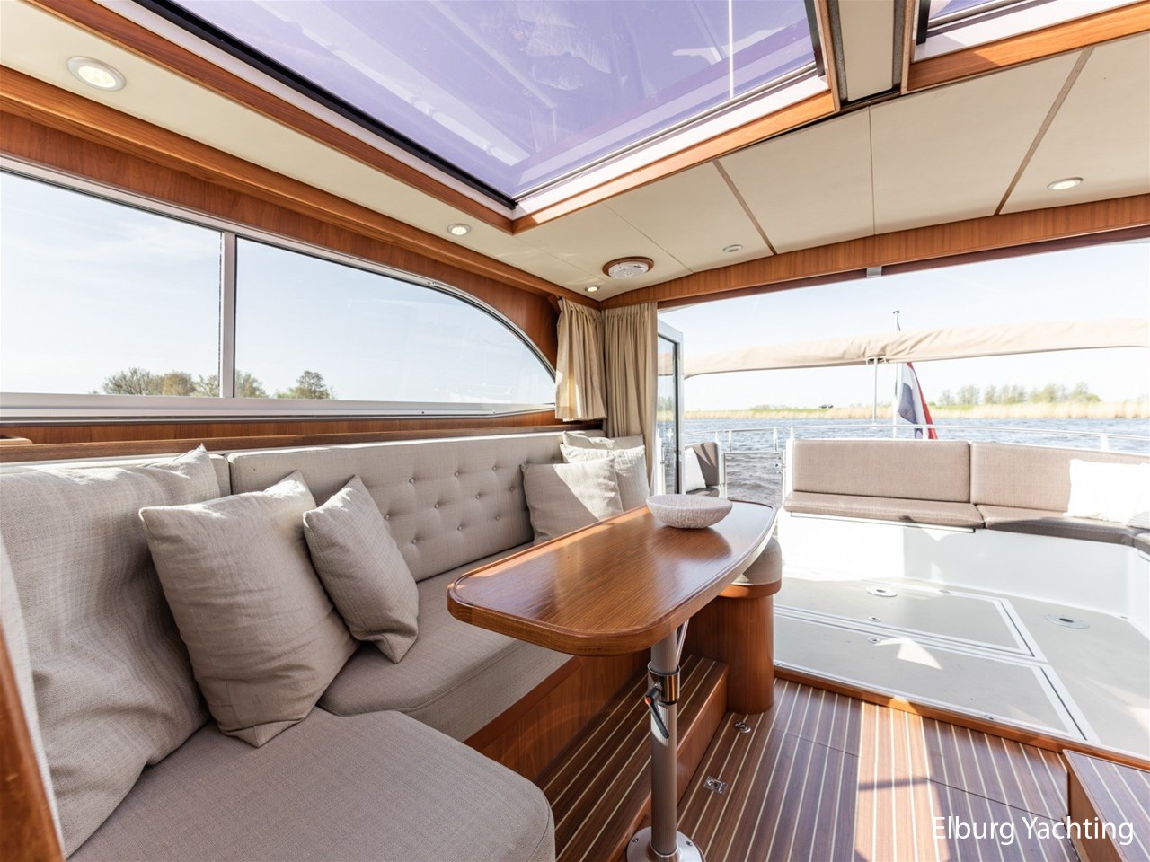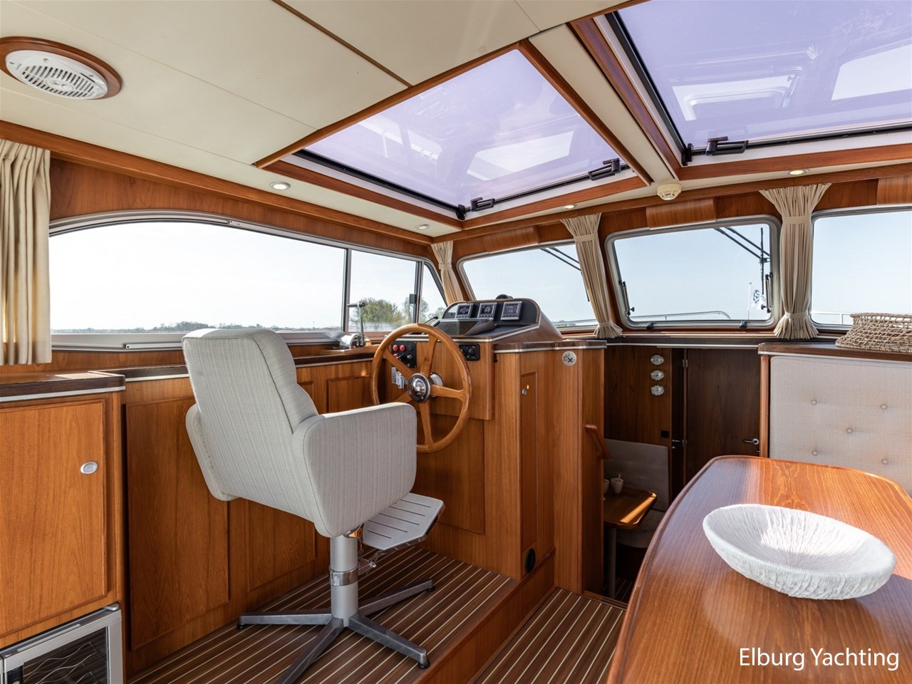 - Teak scheepsinterieur met wengé afwerking en r.v.s. accenten