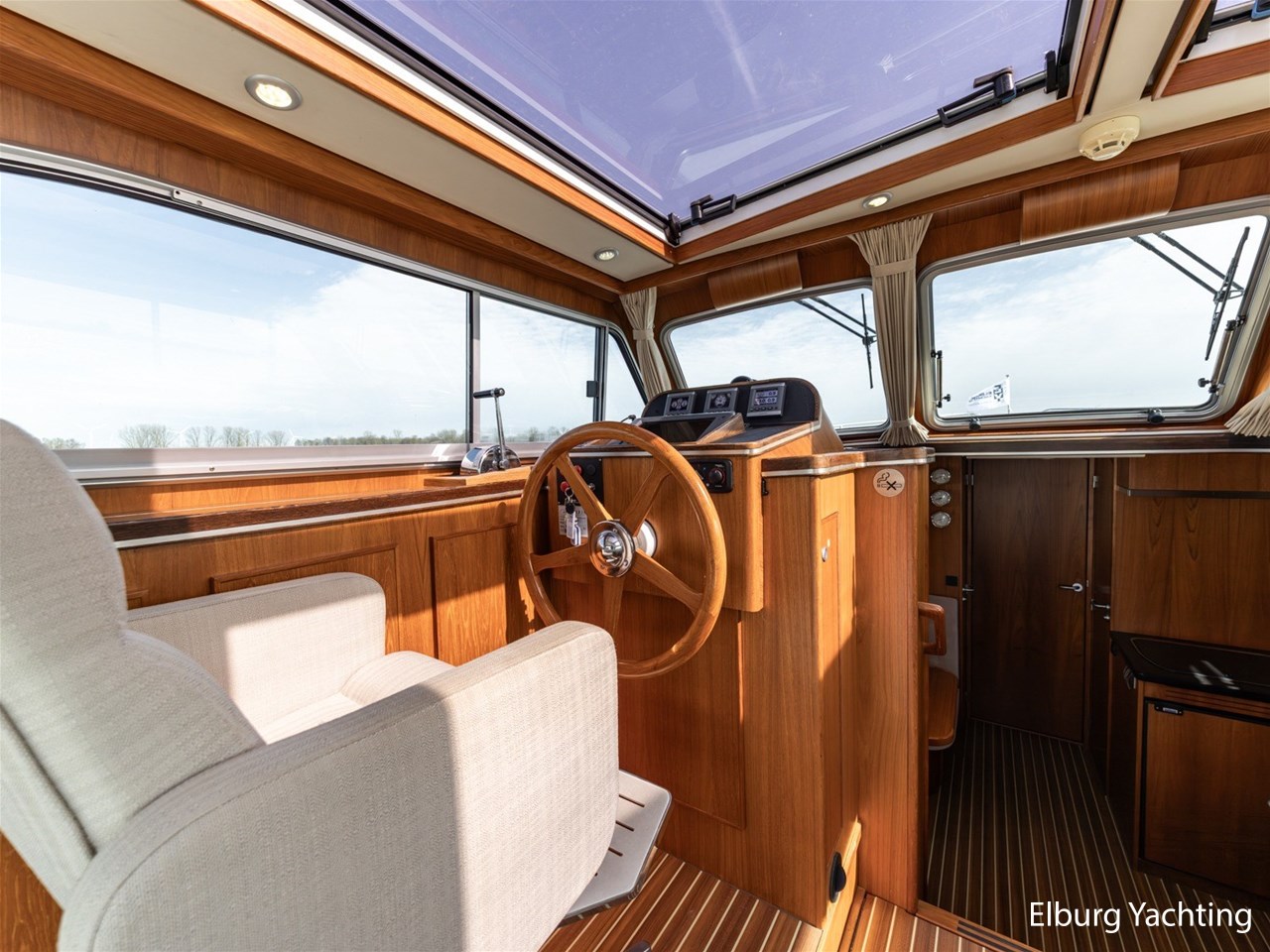Deze modern gelijnde Steeler NG40, ontworpen door Martin Bekebrede en gebouwd door de werf Steeler Yachts, verkeert in uitstekende staat. Het schip is volledig klaar voor het nieuwe vaarseizoen dankzij grootschalig onderhoud in 2025: de romp (Beigegrijs, RAL 7006) en opbouw zijn volledig nieuw gespoten, de Steyr hoofdmotor (uitgerust met extra isolatie) heeft een grote beurt gehad en alle accu’s zijn vernieuwd. Eerder in 2022 is het onderwaterschip volledig gestraald en voorzien van een nieuw verfsysteem. Het interieur is hoogwaardig afgewerkt in teak met wengé details en r.v.s. accenten. Uniek voor deze lengte zijn de zes vaste slaapplaatsen, verdeeld over drie hutten waaronder een ruime eigenaarshut met een 2-persoons frans bed. Door de twee grote panoramadaken in de salon komt er veel daglicht naar binnen. Het achterdek en de salon zijn gelijkvloers en open met elkaar te verbinden door de drie aluminium klapdeuren. Voor extra gemak aan boord is de kombuis uitgerust met een Bosch vaatwasser en een wijnkoeler in de salon. In de kuip is een grote U-vorming bank aanwezig met afneembare kussens en een inklapbare biminitop voor beschutting tegen de zon. Dankzij de klapbare beugel heeft deze Steeler NG40 een minimale doorvaarthoogte van slechts 2,70 meter.